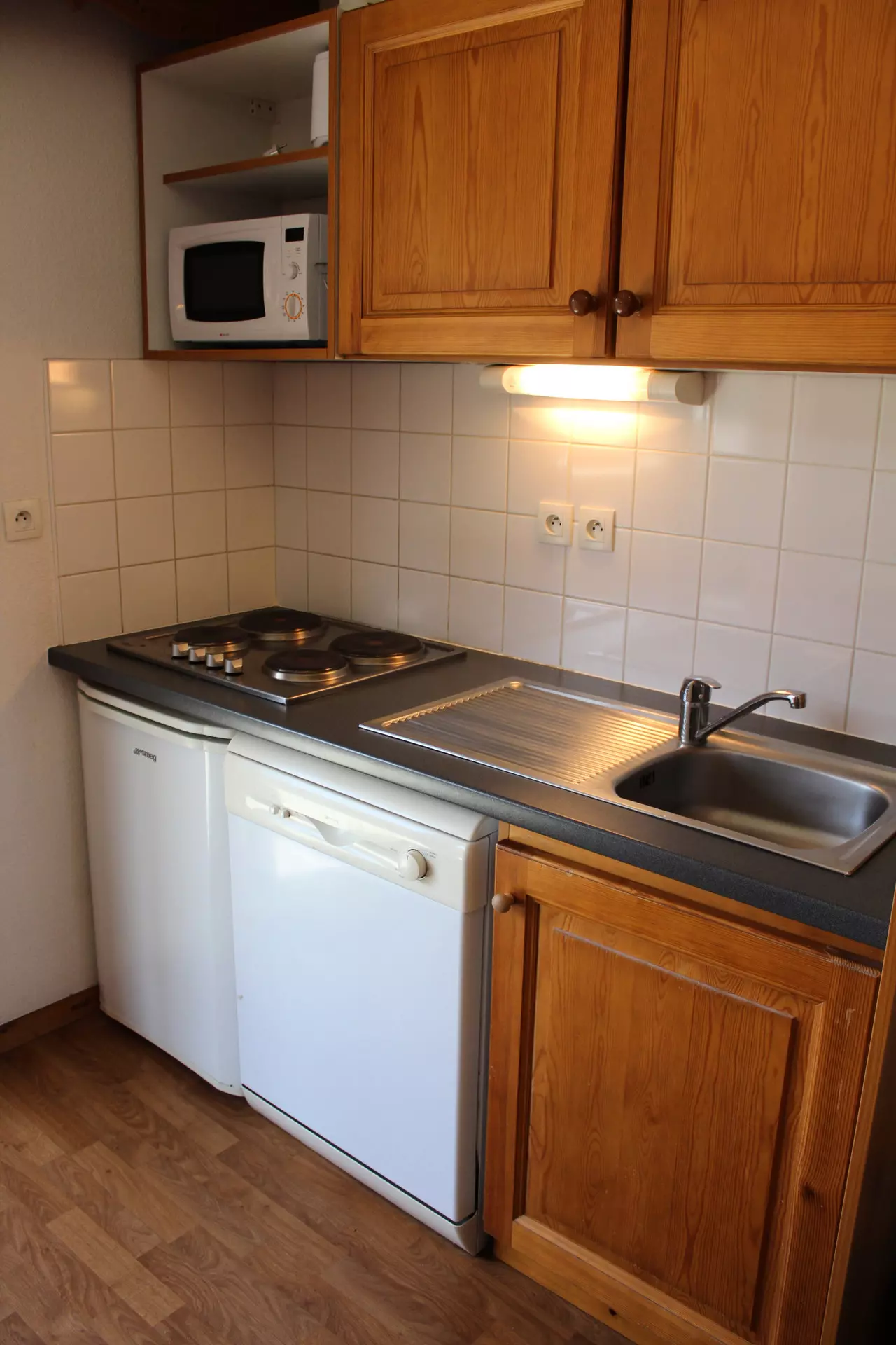 Kitchenette entièrement équipée. Lave vaisselle, micro-ondes, cafetière électrique.