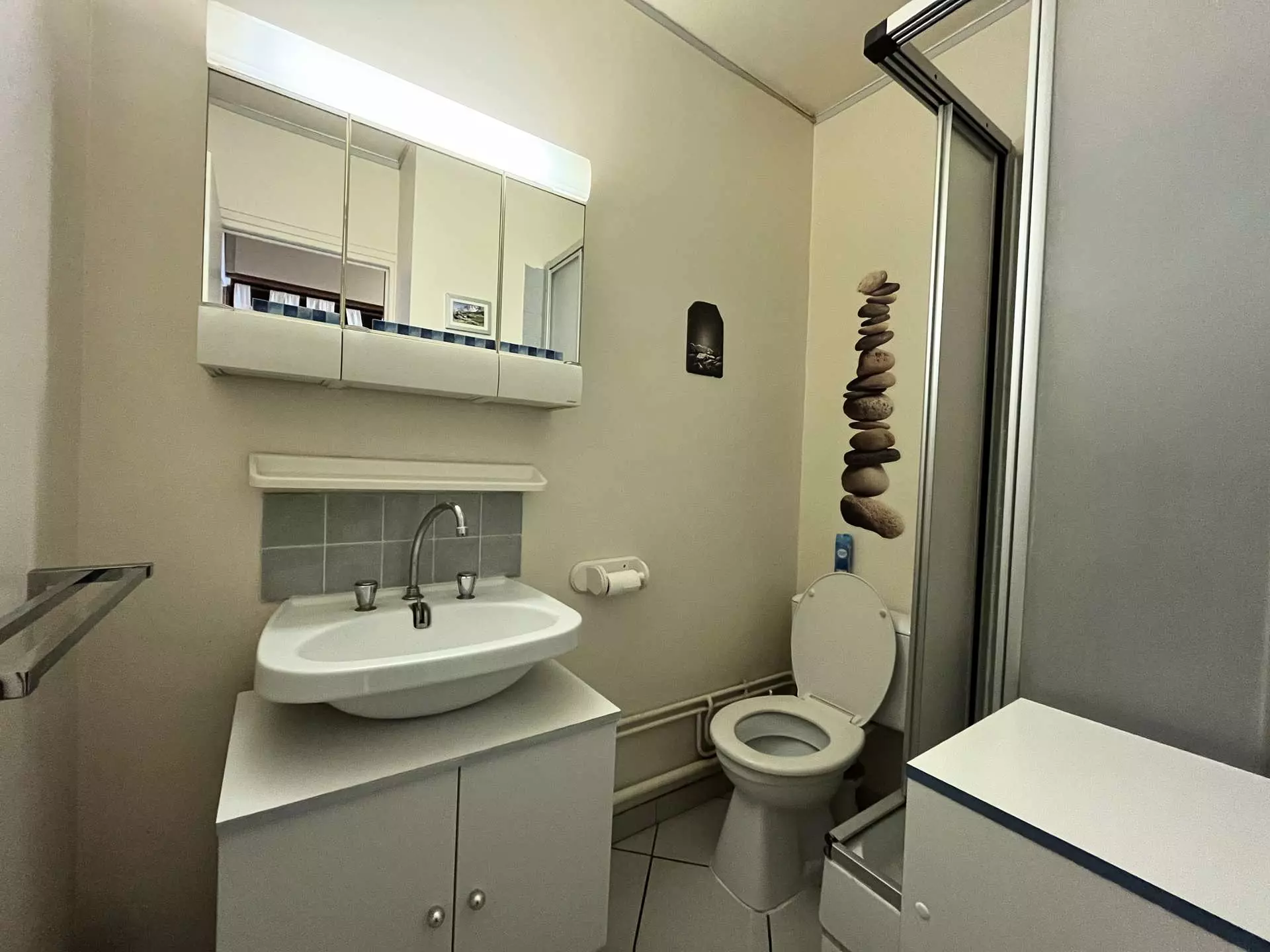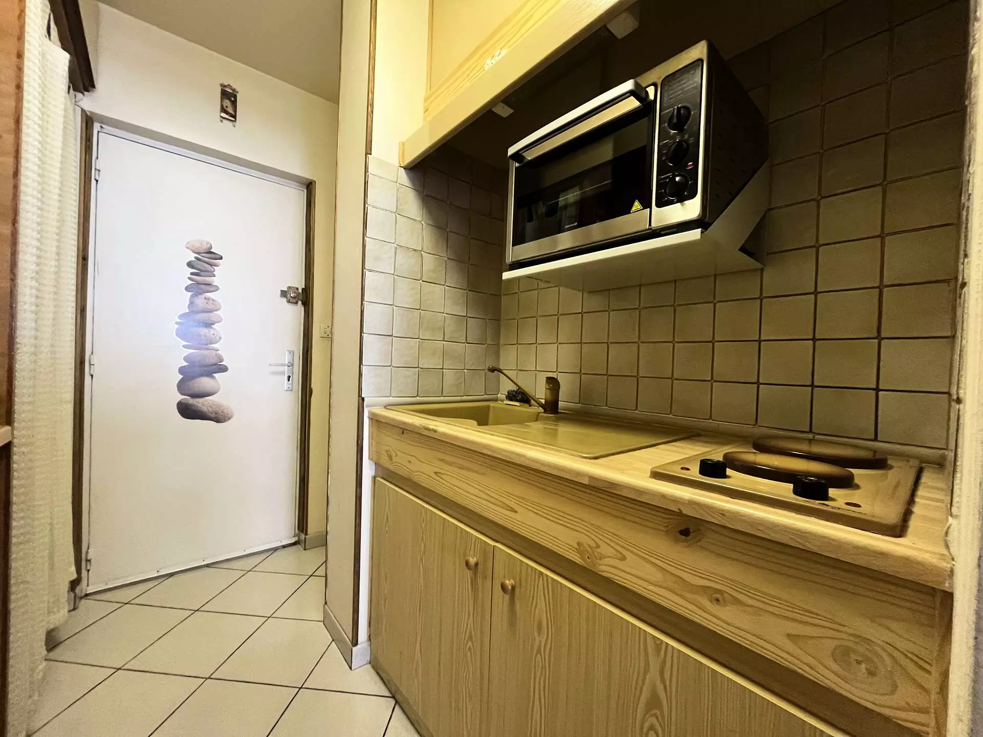 Il comprend une entrée desservant la salle d'eau / WC, une cuisine séparée équipée d'un micro-ondes, de plaques électriques, d'une cafetière électrique et d'un appareil à raclette...
