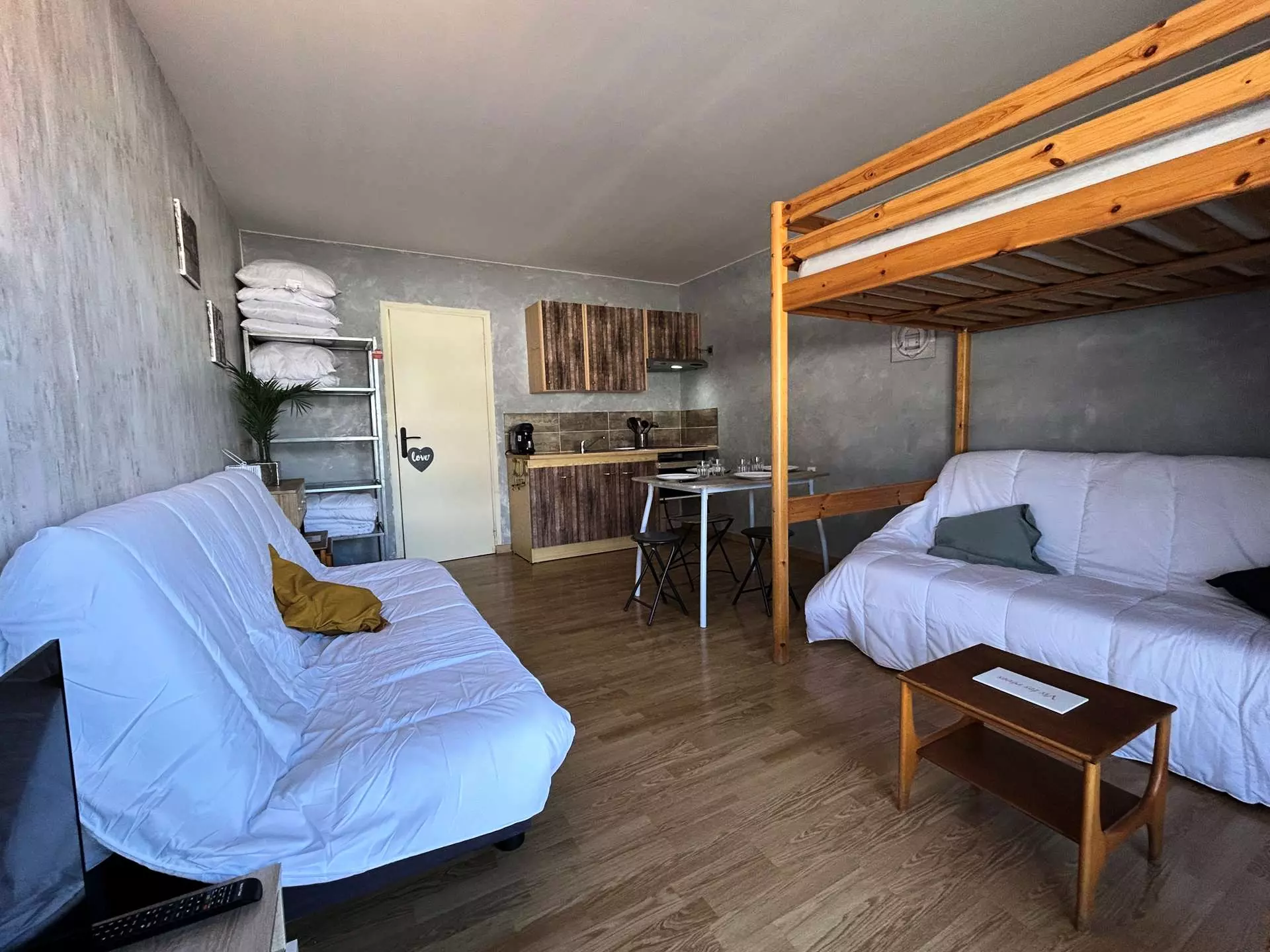 La pièce à vivre contitué d'un lit mézzanine double en haut 160x190 et un clic clac en bas en 140x190, un canapé et une télévision.