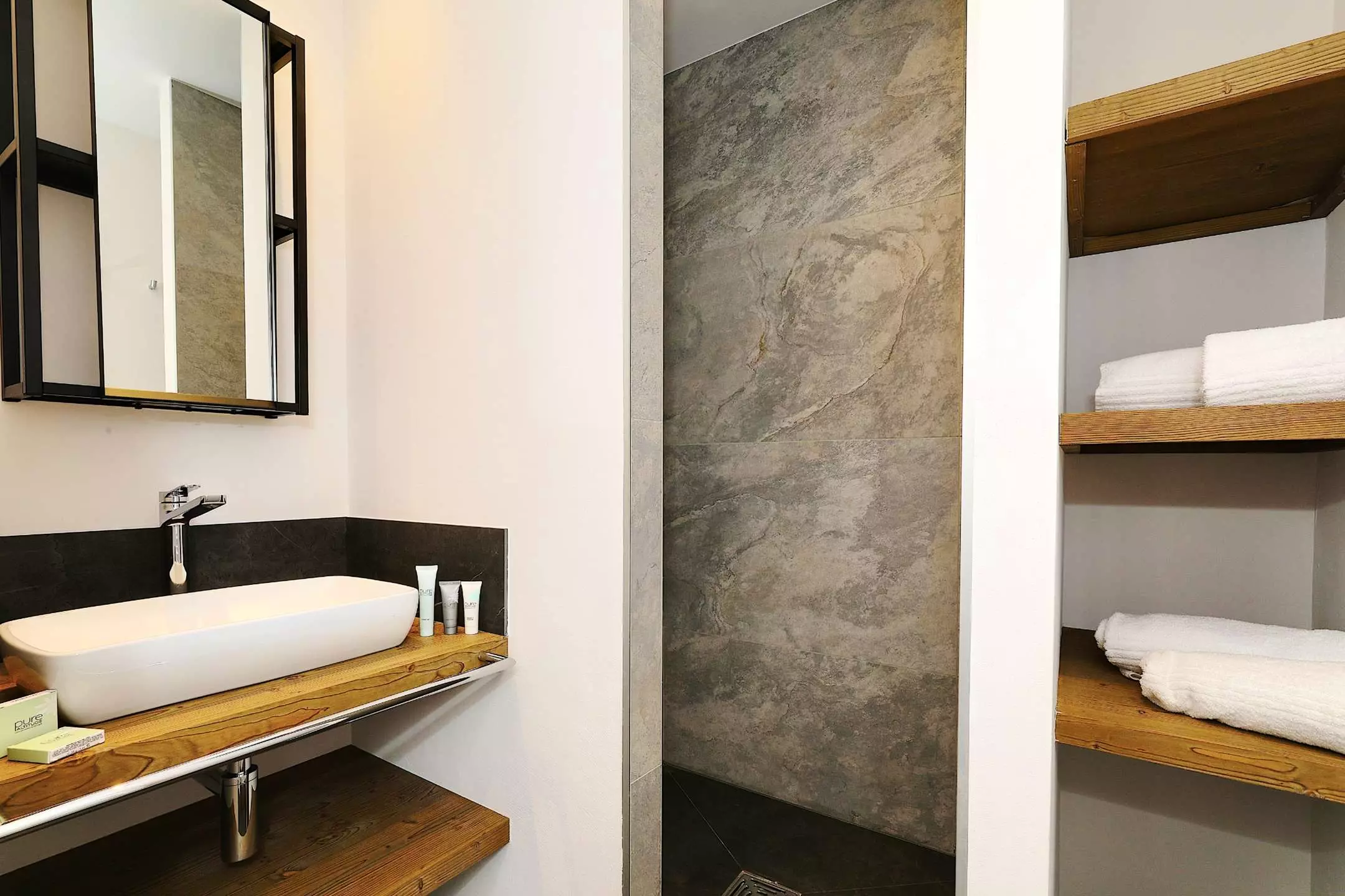 - Une salle de bains avec douche à l'italienne, lavabo une vasque et toilette