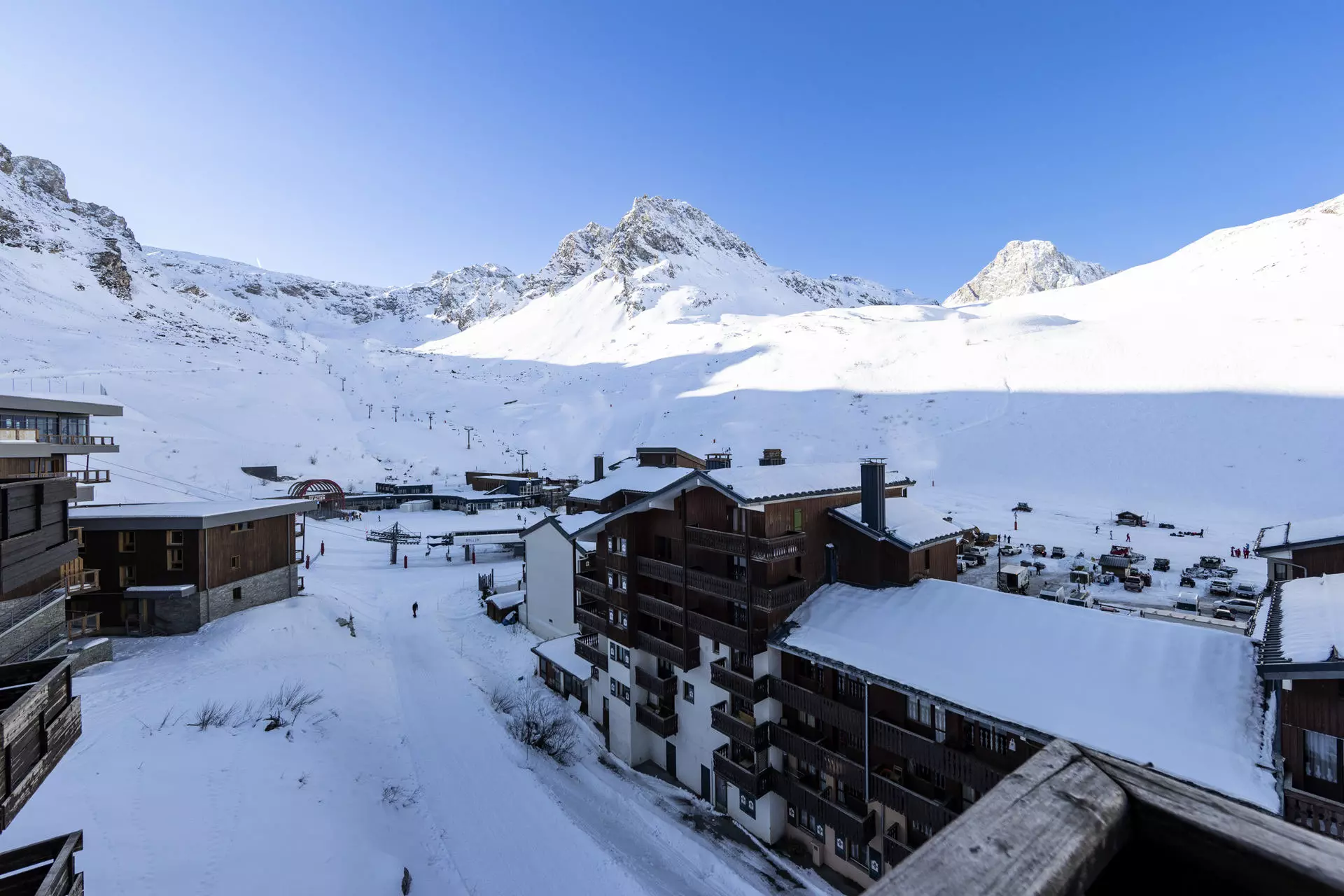 Immeuble plein centre de Tignes Val Claret et skis aux pieds.