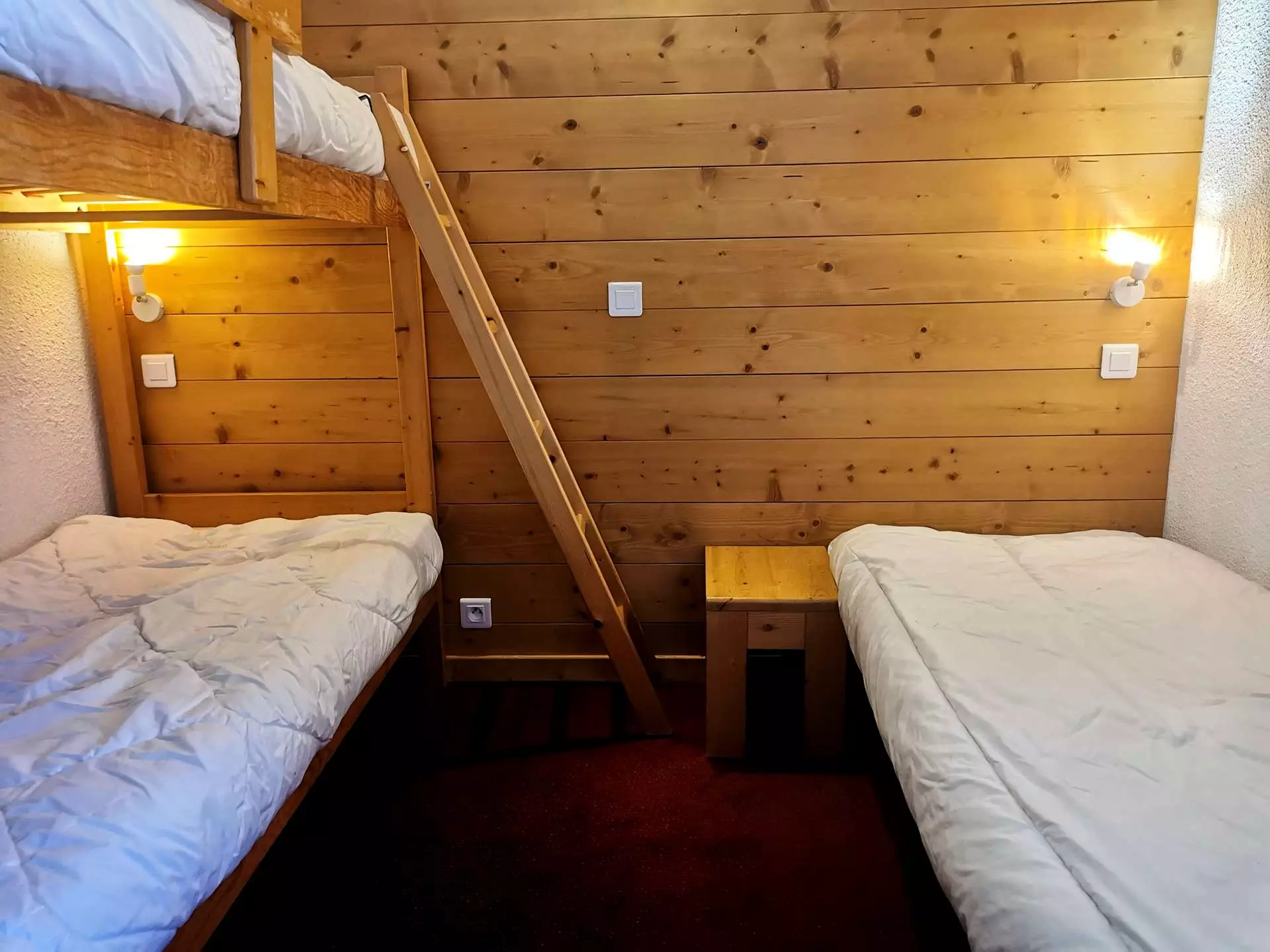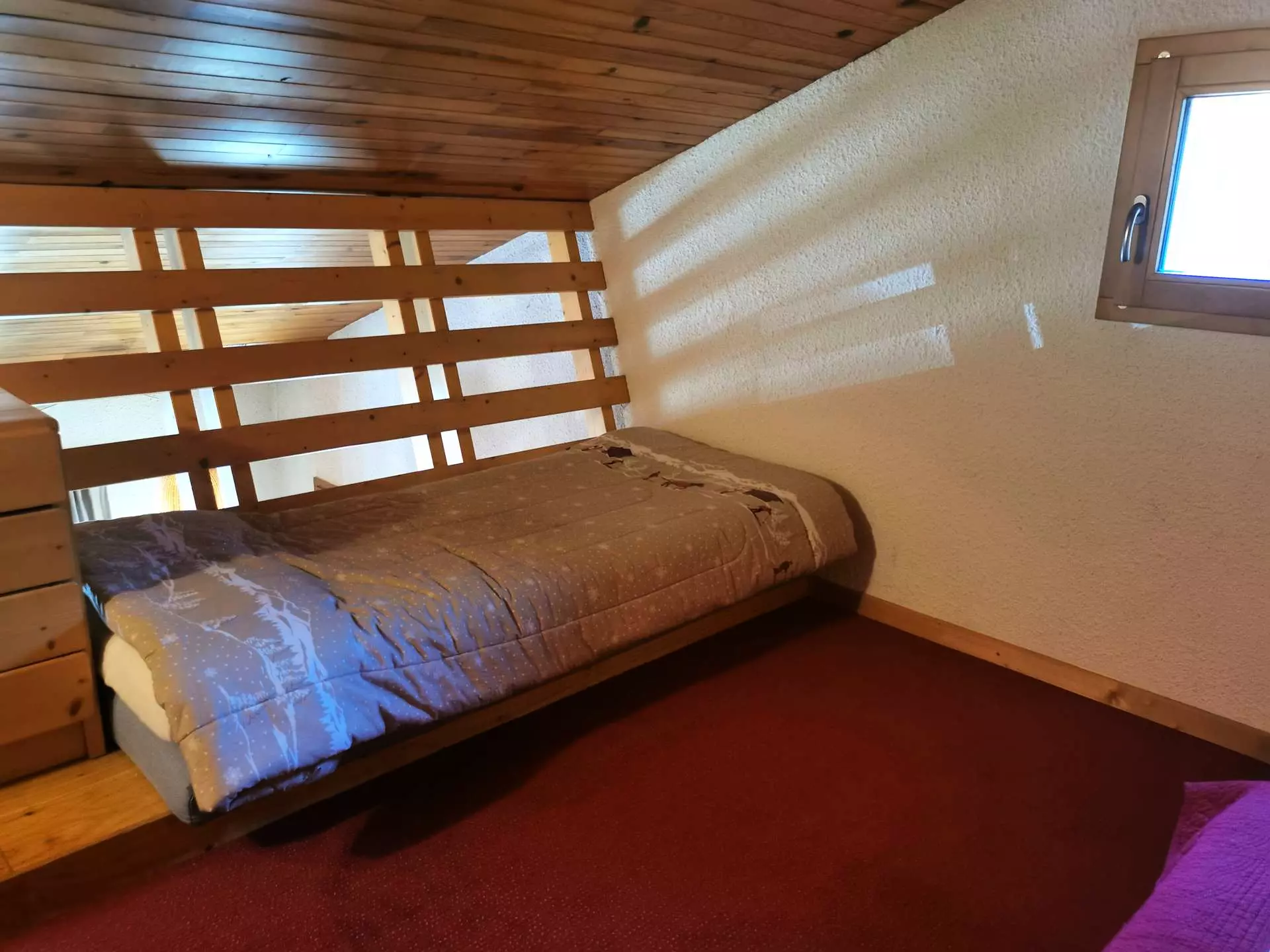 Le séjour est meublé d'un canapé, la chambre du bas d'un lit simple (90) et de lits superposés (90) et la mezzanine, d'un lit double (140) et d'un lit simple. Des couettes sont fournies pour tous les lits.