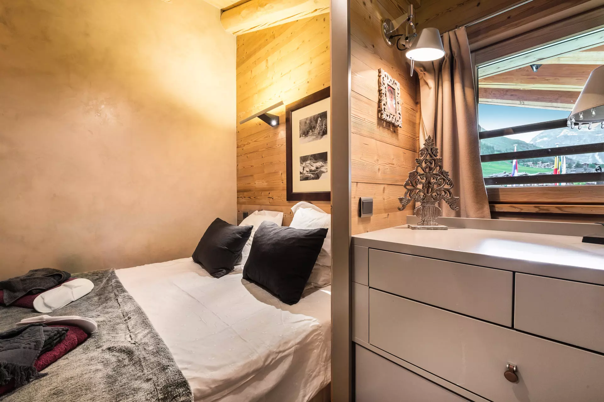 Appartement duplex de 50m². Plein centre de Val d'Isère. Emplacement idéal, proche de toutes commodités, skis aux pieds et à 10m de la télécabine du Solaise. 2 chambres avec lit double et lits séparables.