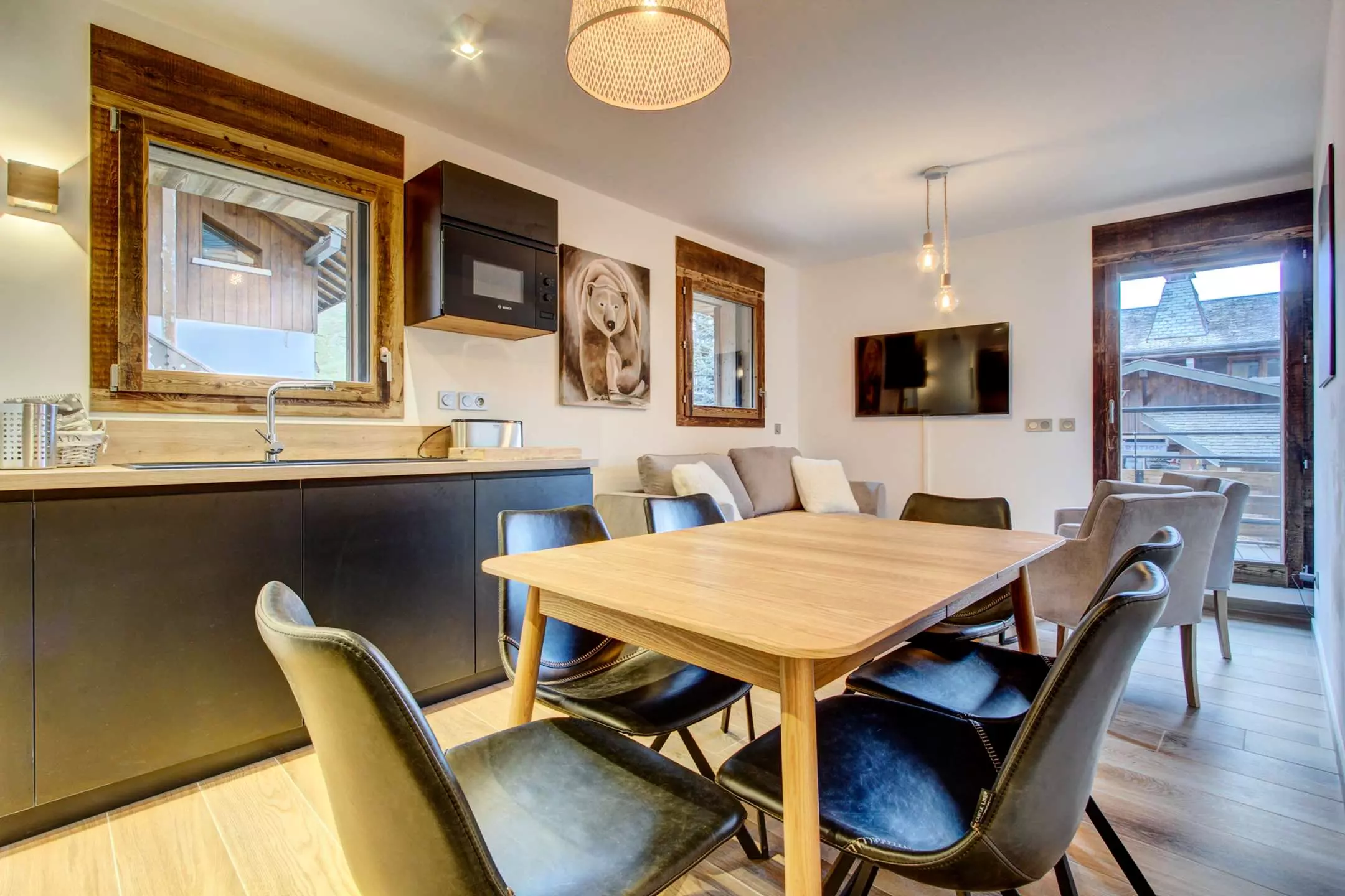 Pièce à vivre avec cuisine ouverte, coin repas, coin salon avec canapé-lit (140x200) et accès au balcon avec vue sur les pistes du Pleney