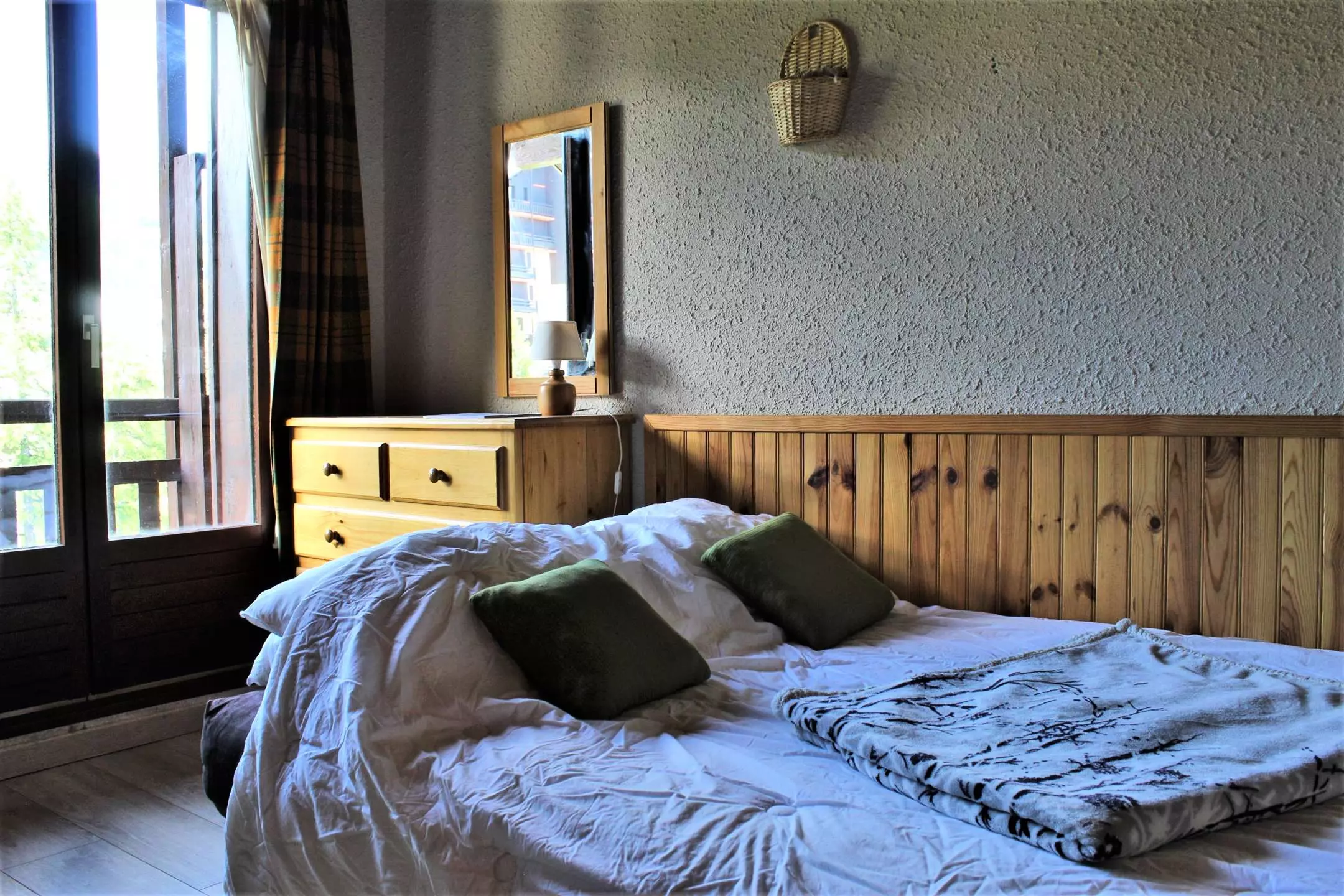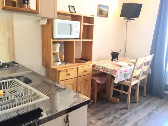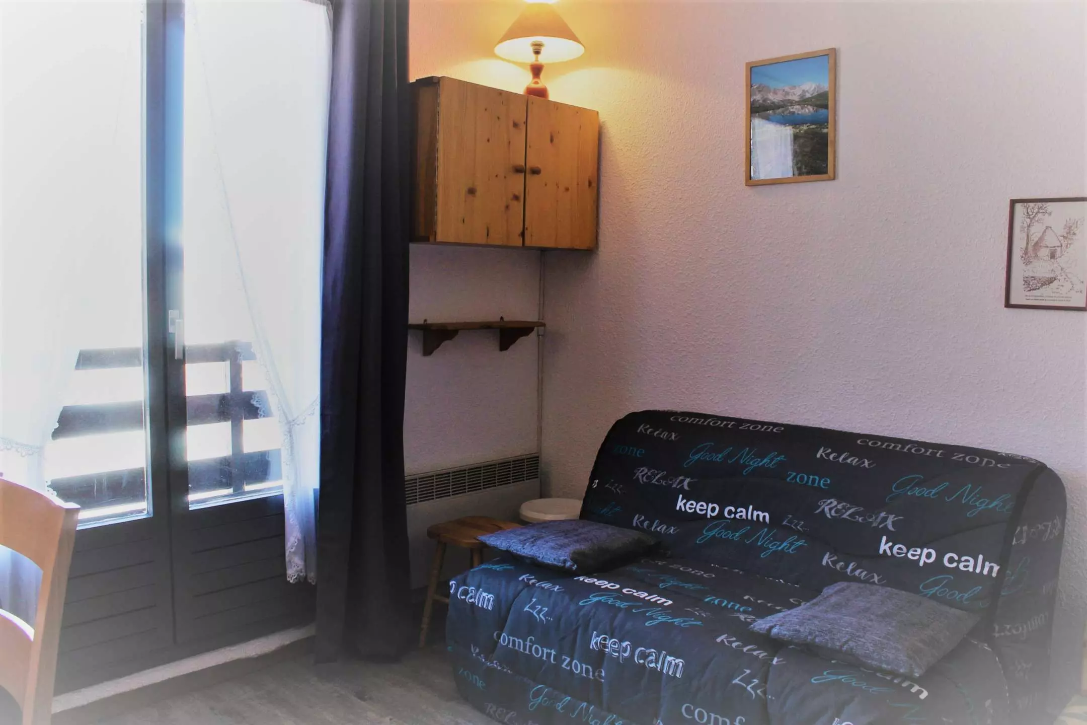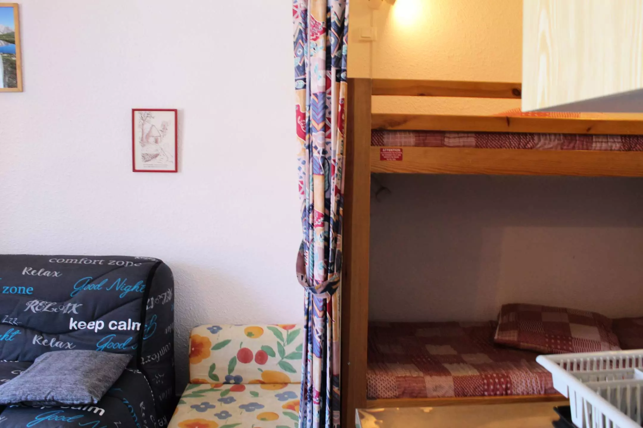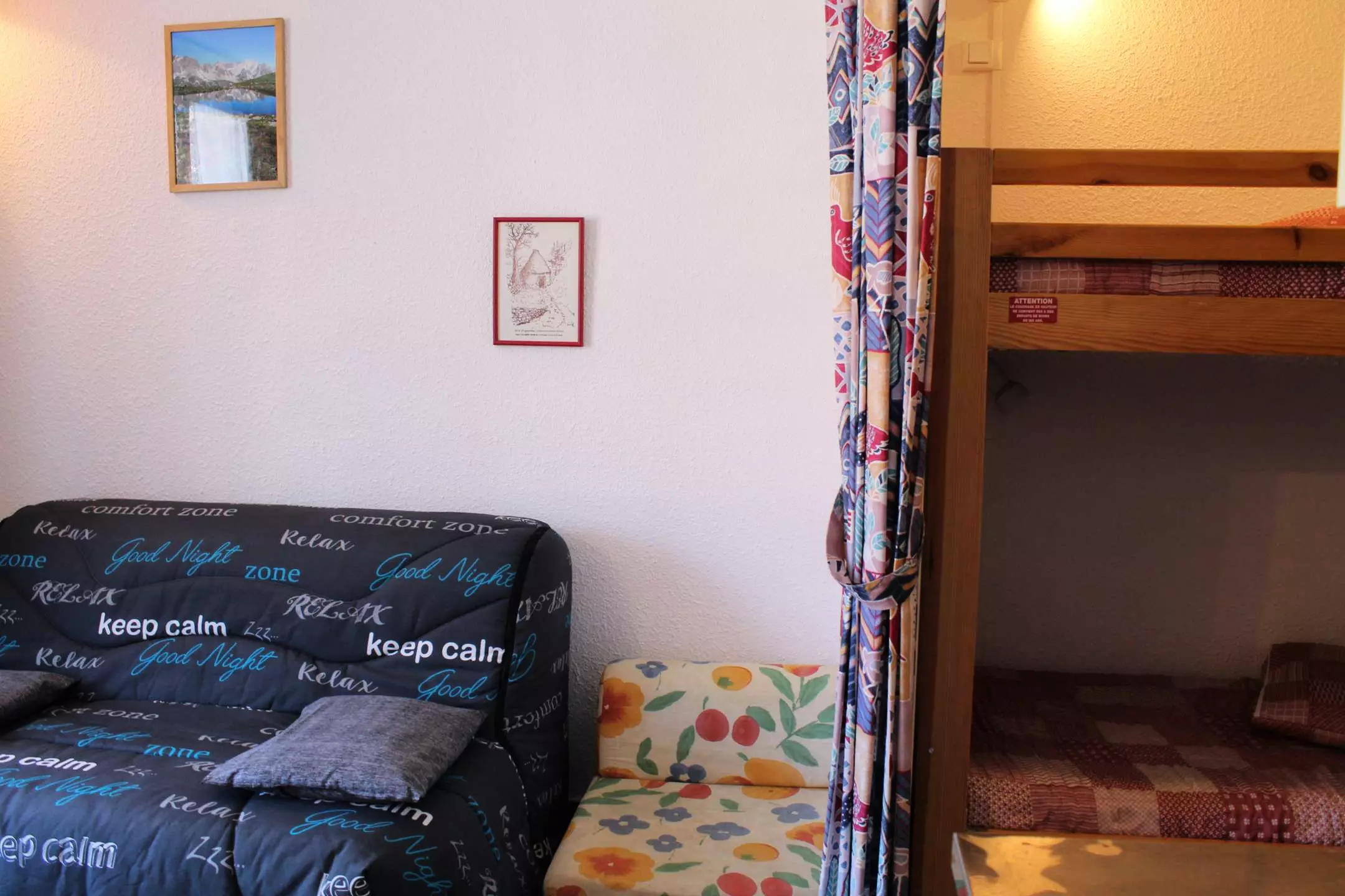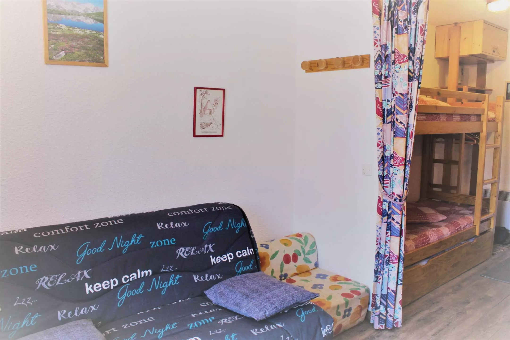 Studio situé rez-de-chaussée dans une résidence au calme, et proche des pistes. Il s'organise autour de deux lits superposés dans un coin montagne, d'un canapé clic-clac dans la pièce de vie avec la télévision, et d'une cabine avec un lit double.