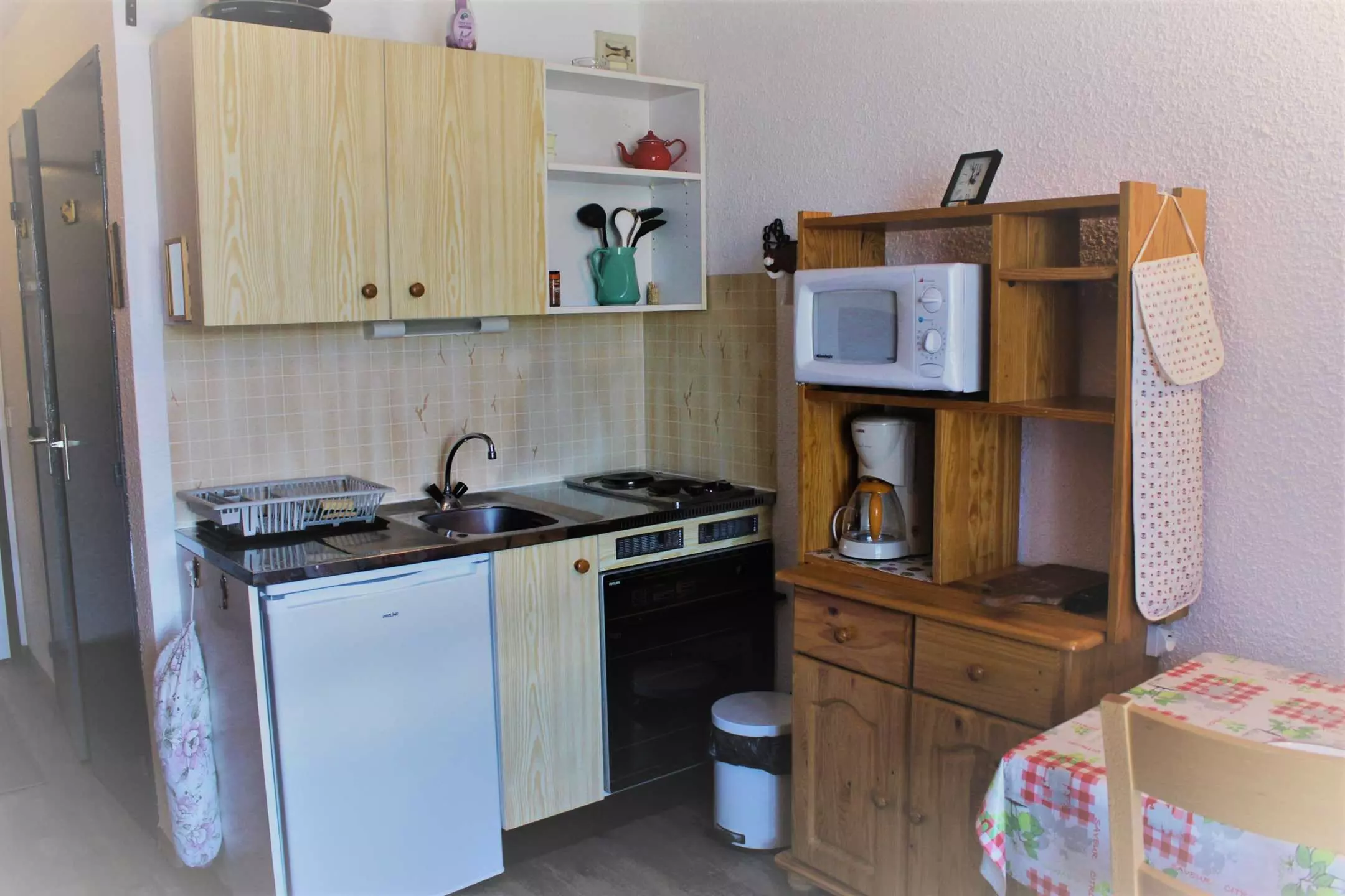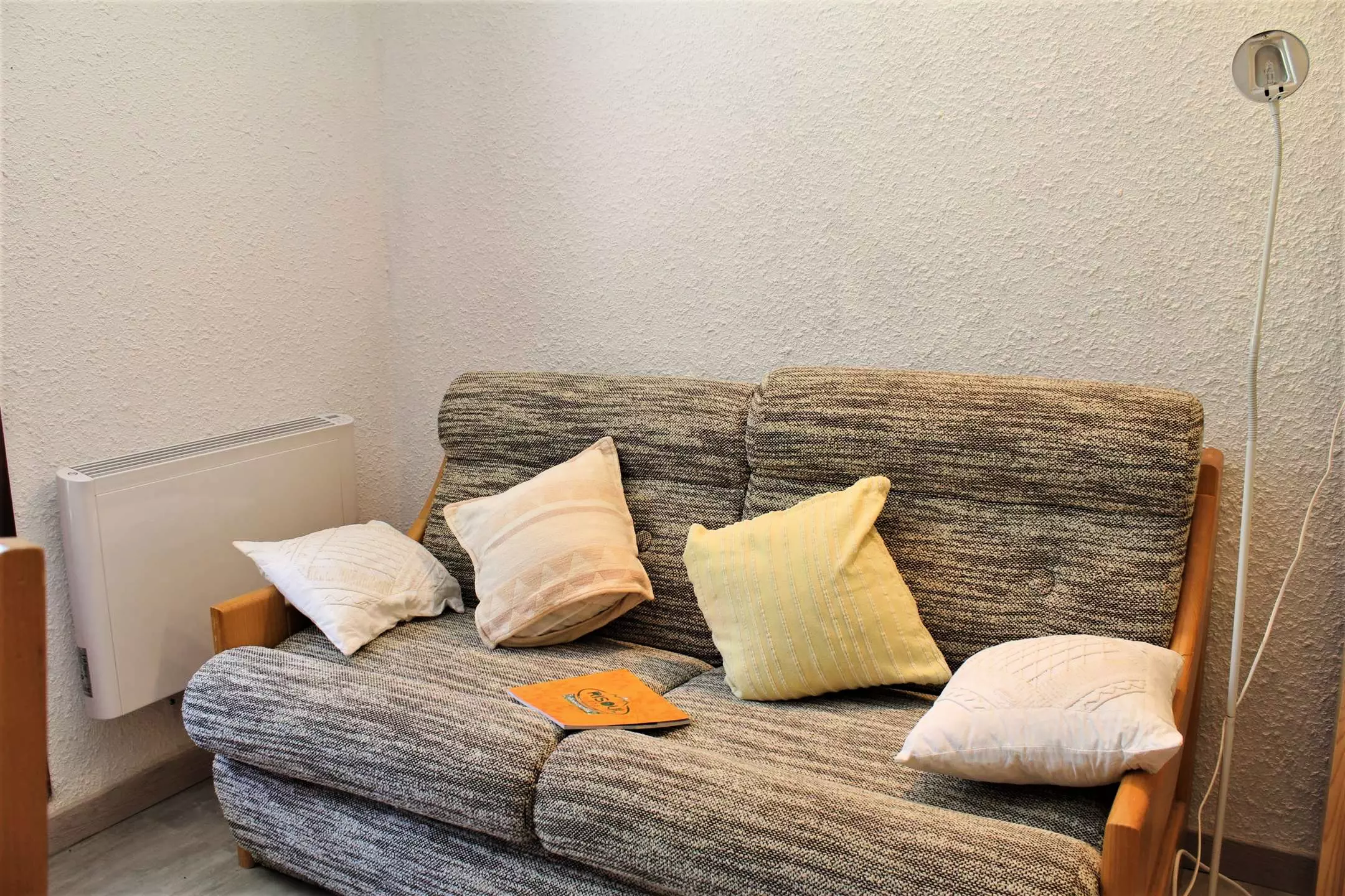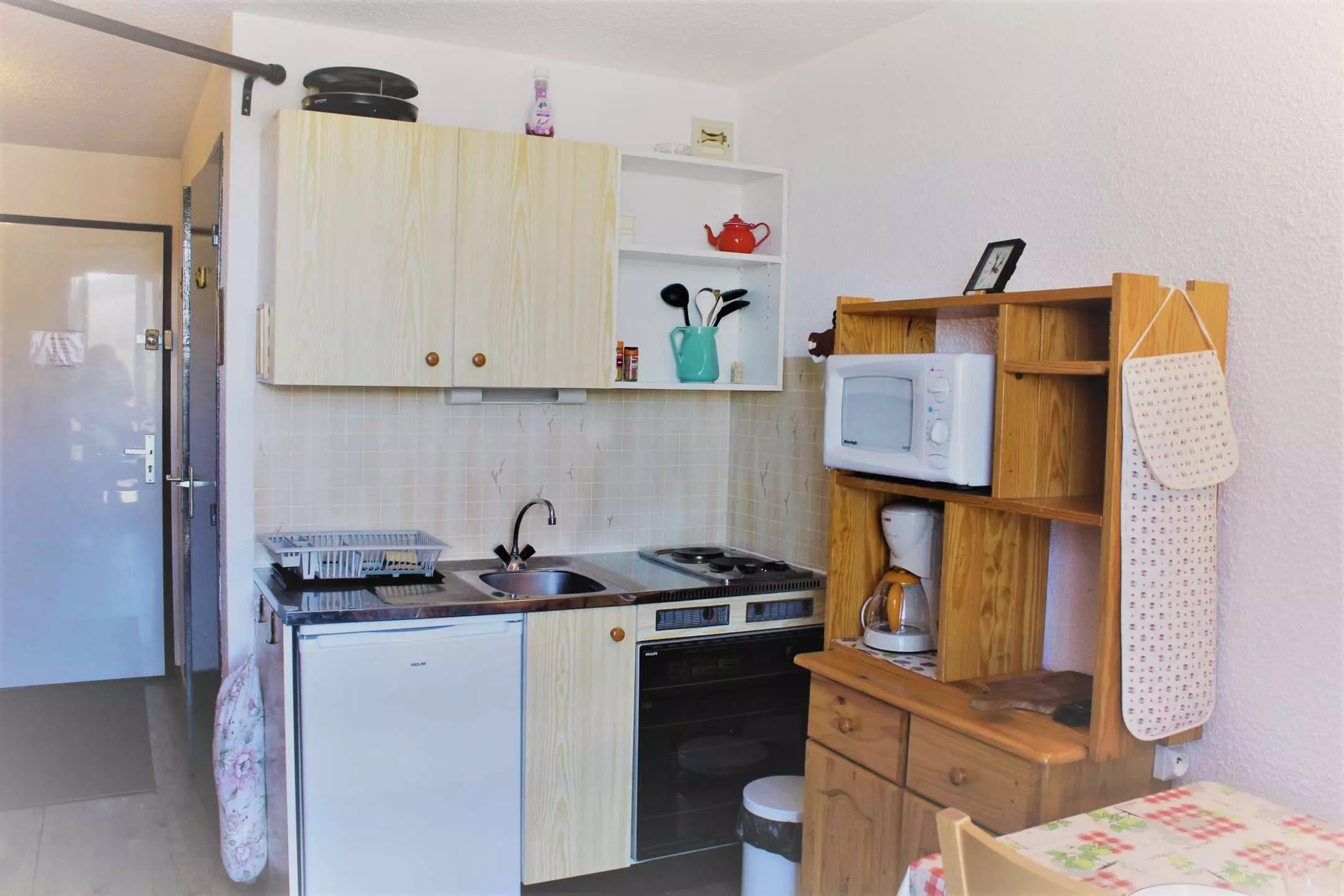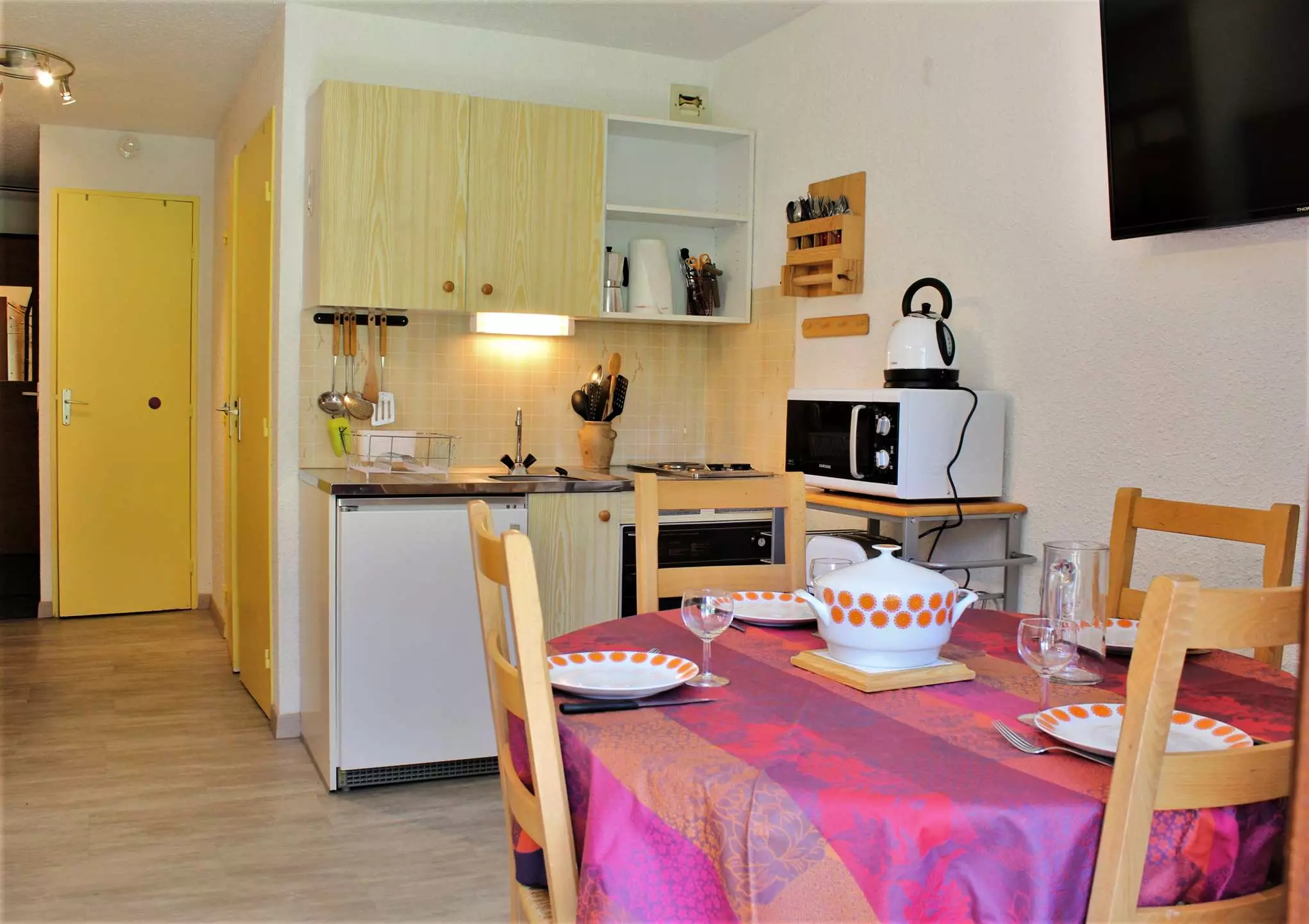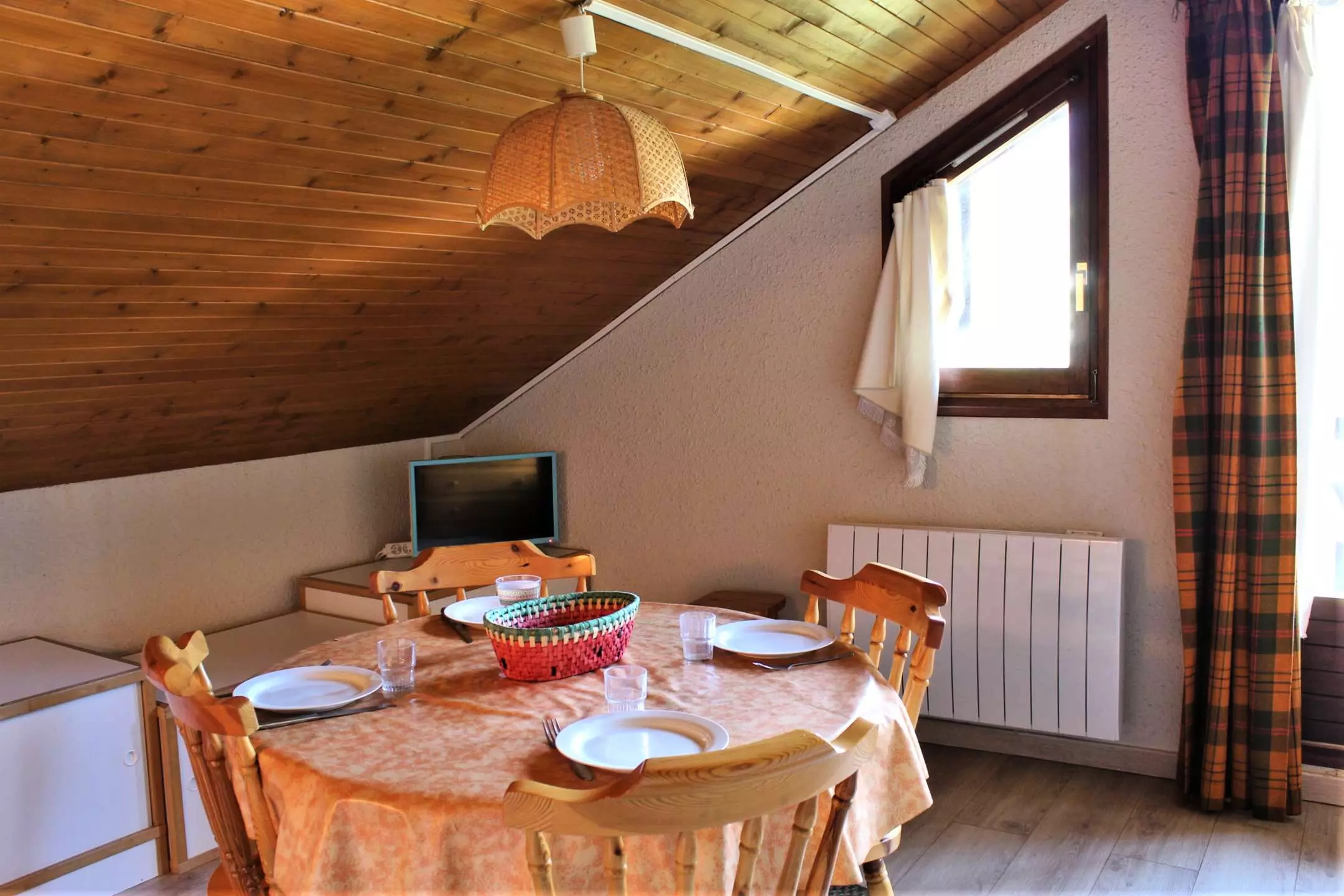 Studio situé rez-de-chaussée dans une résidence au calme, et proche des pistes. Il s'organise autour de deux lits superposés dans un coin montagne, d'un canapé clic-clac dans la pièce de vie avec la télévision, et d'une cabine avec un lit double.