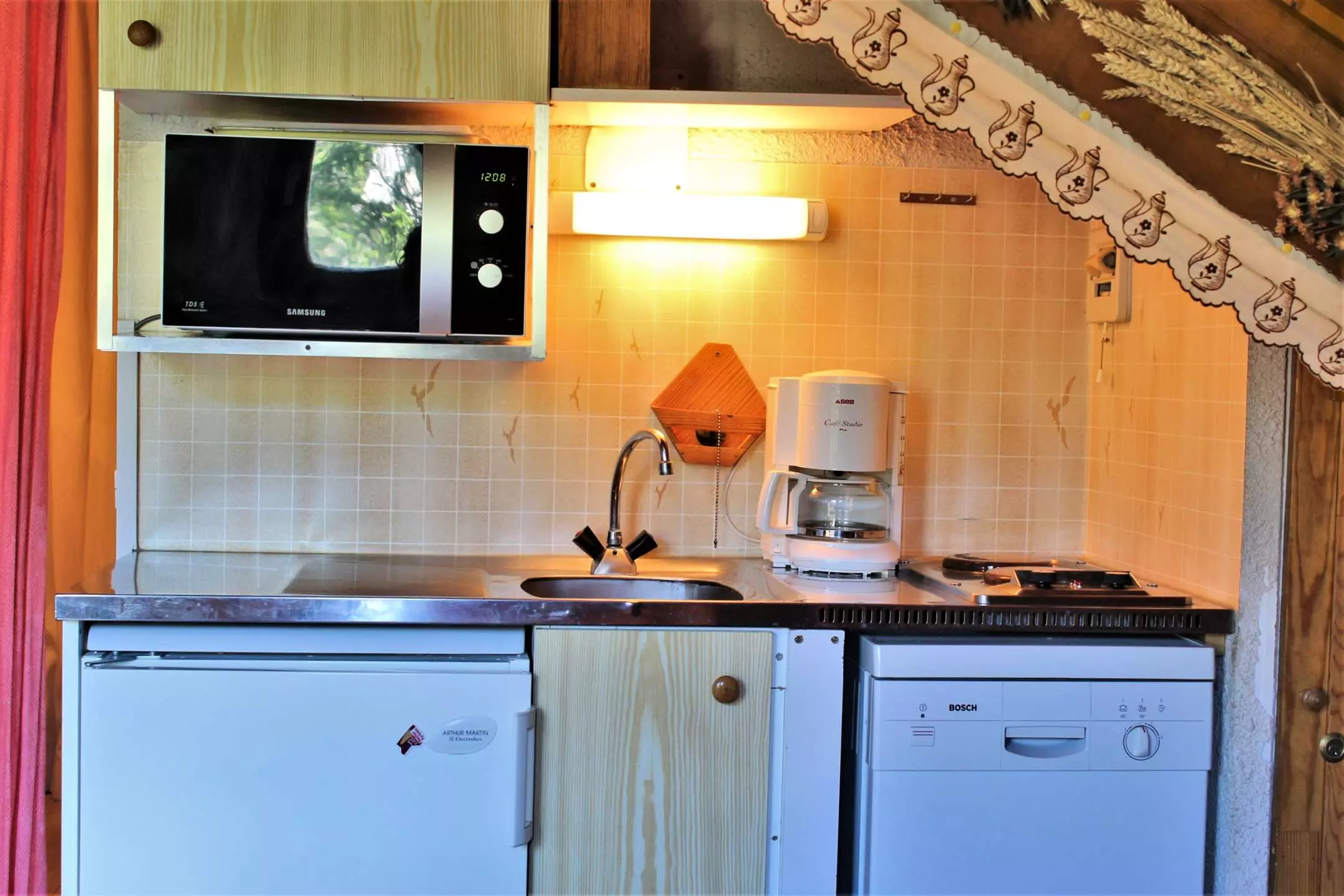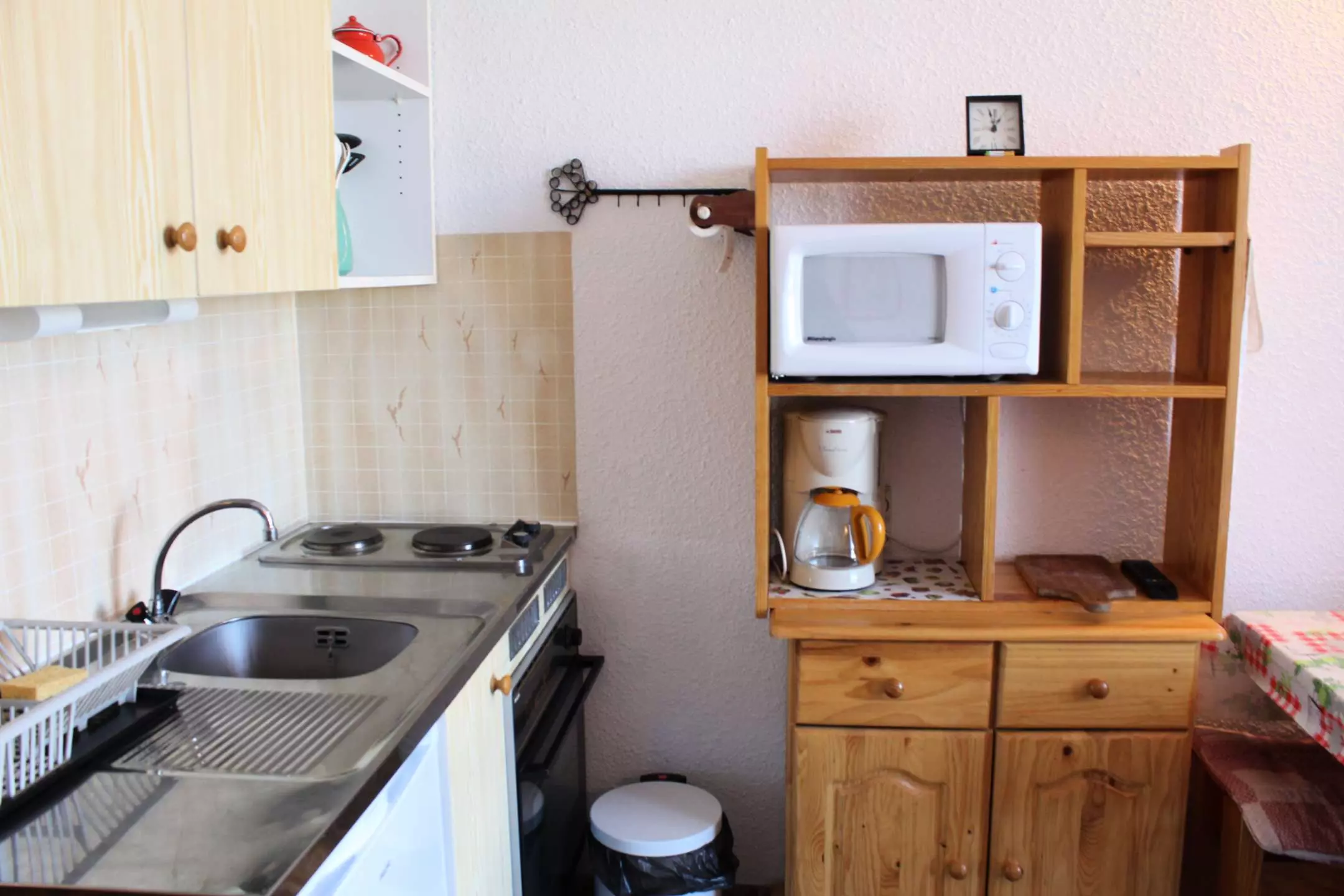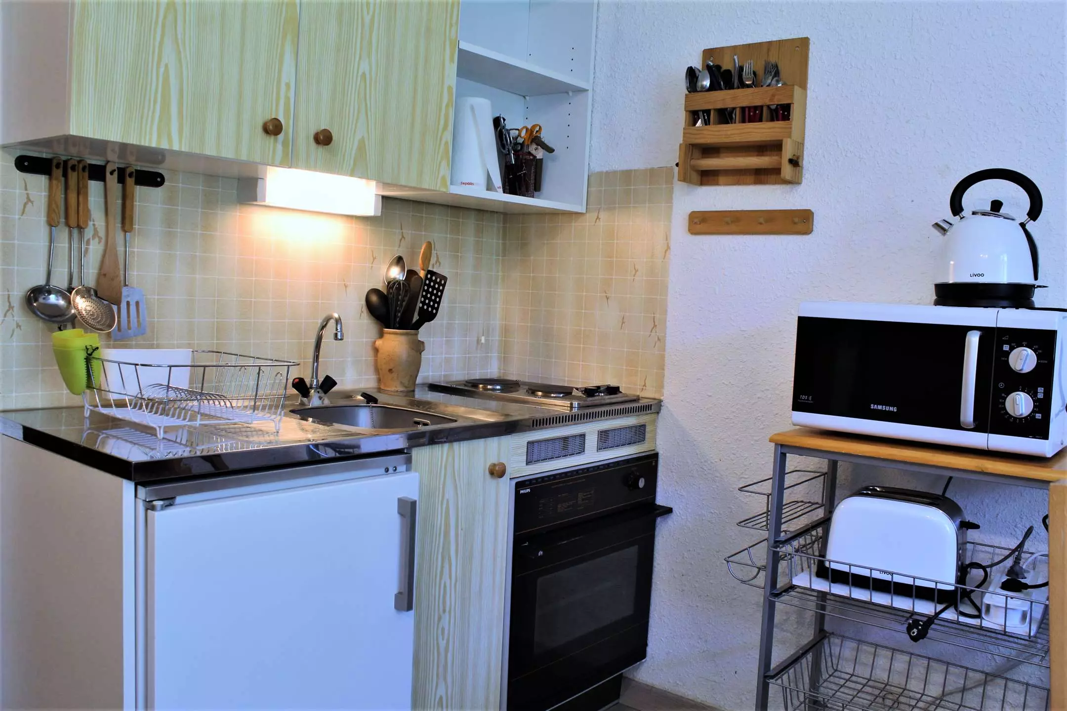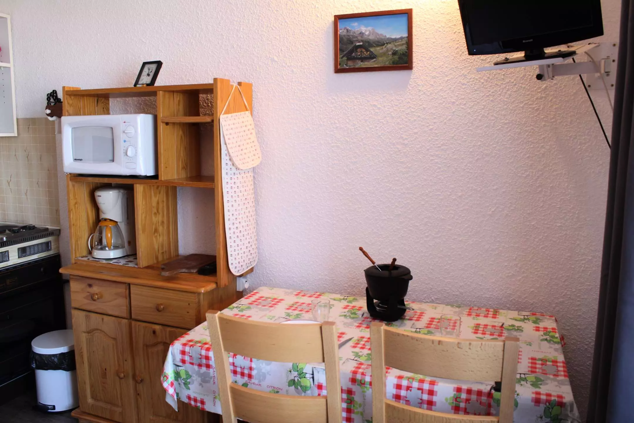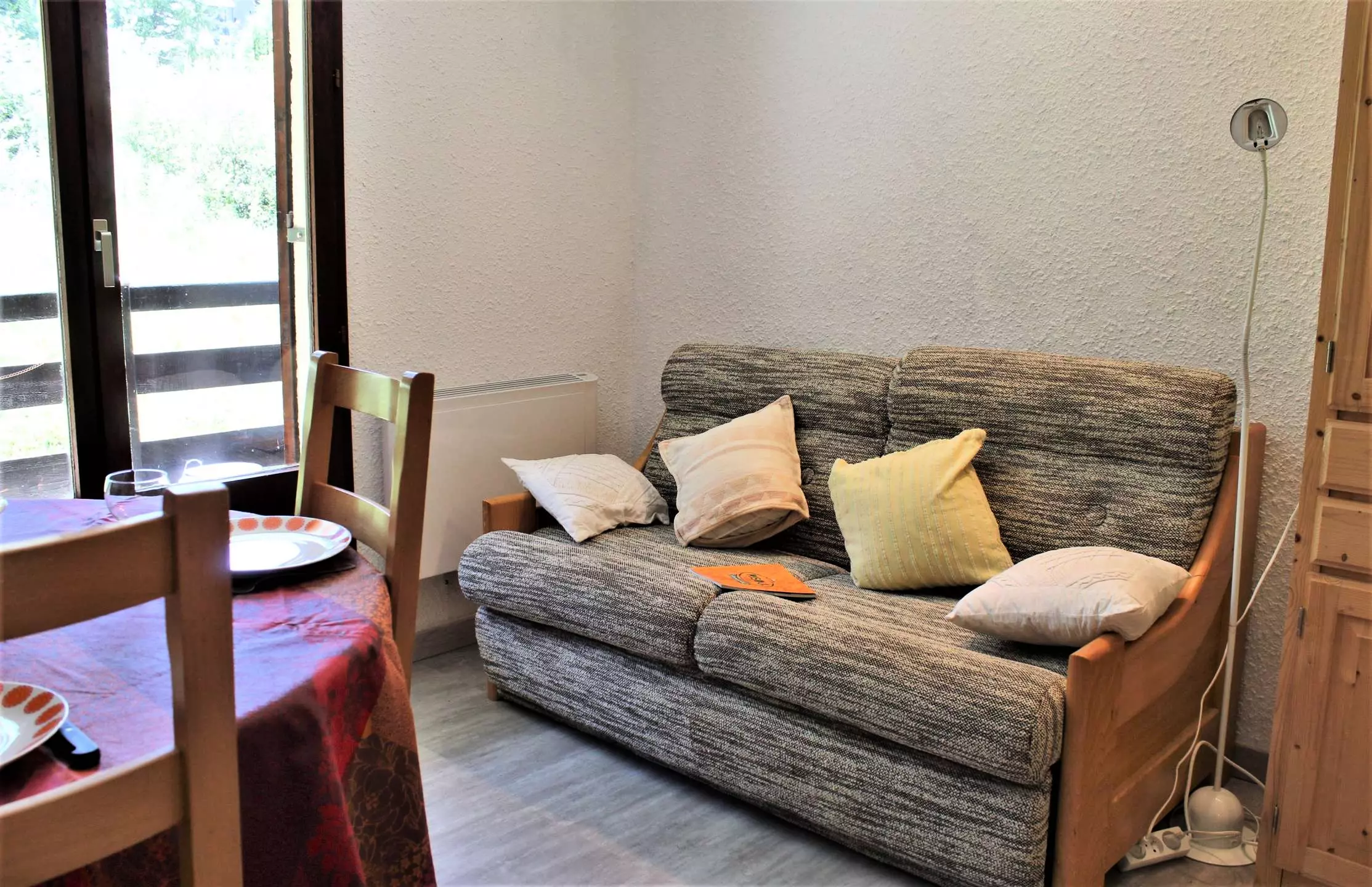 Studio situé rez-de-chaussée dans une résidence au calme, et proche des pistes. Il s'organise autour de deux lits superposés dans un coin montagne, d'un canapé clic-clac dans la pièce de vie avec la télévision, et d'une cabine avec un lit double.
