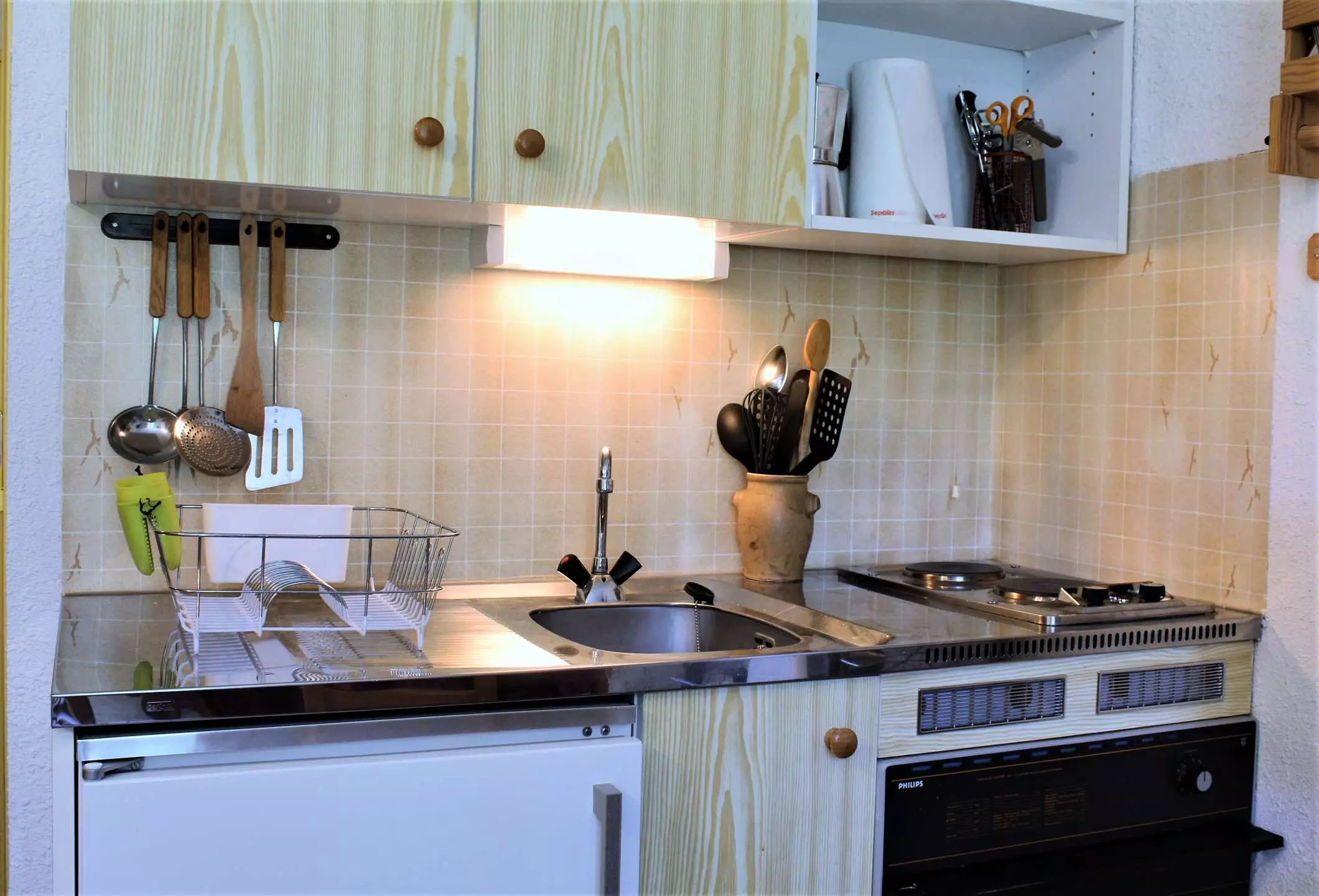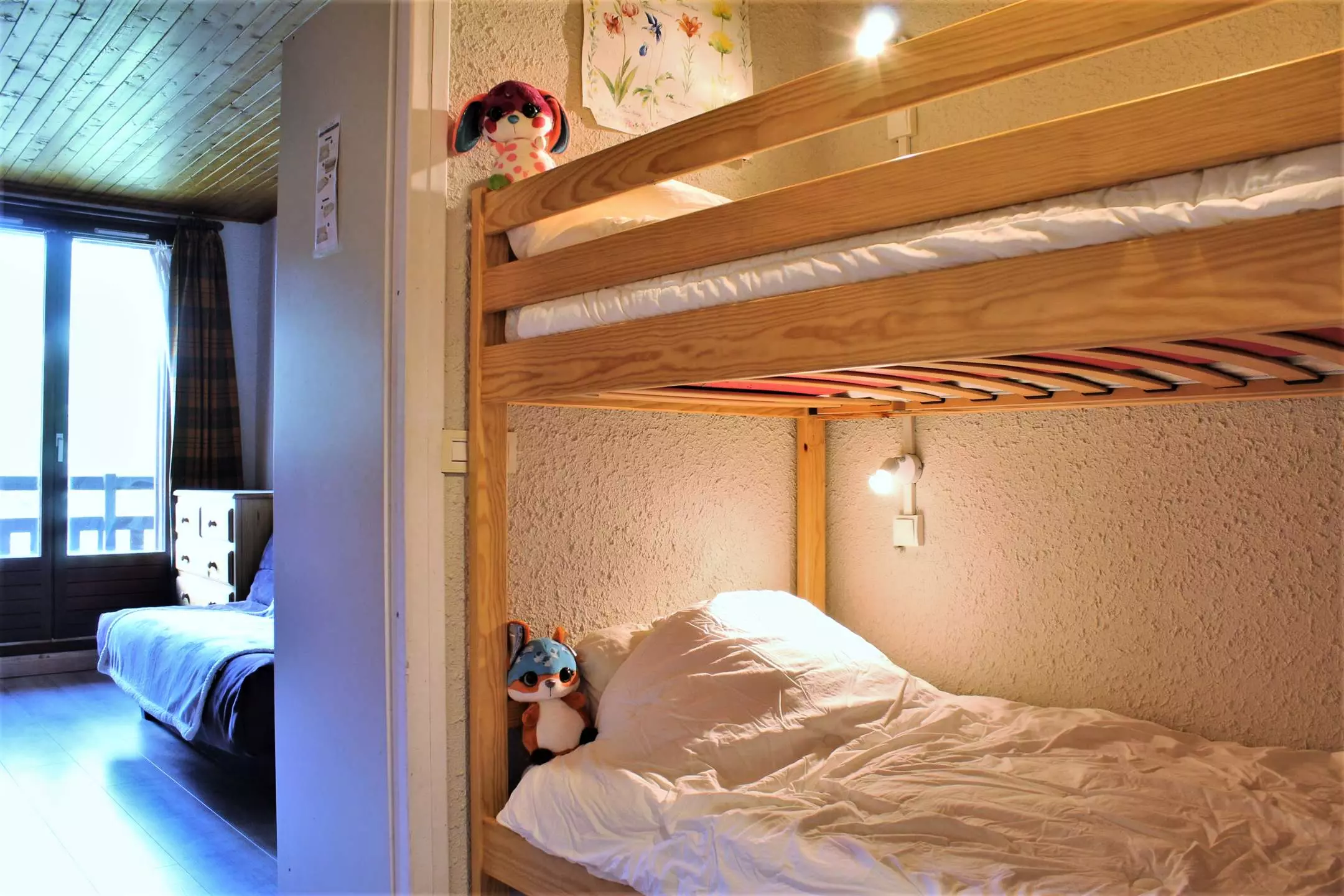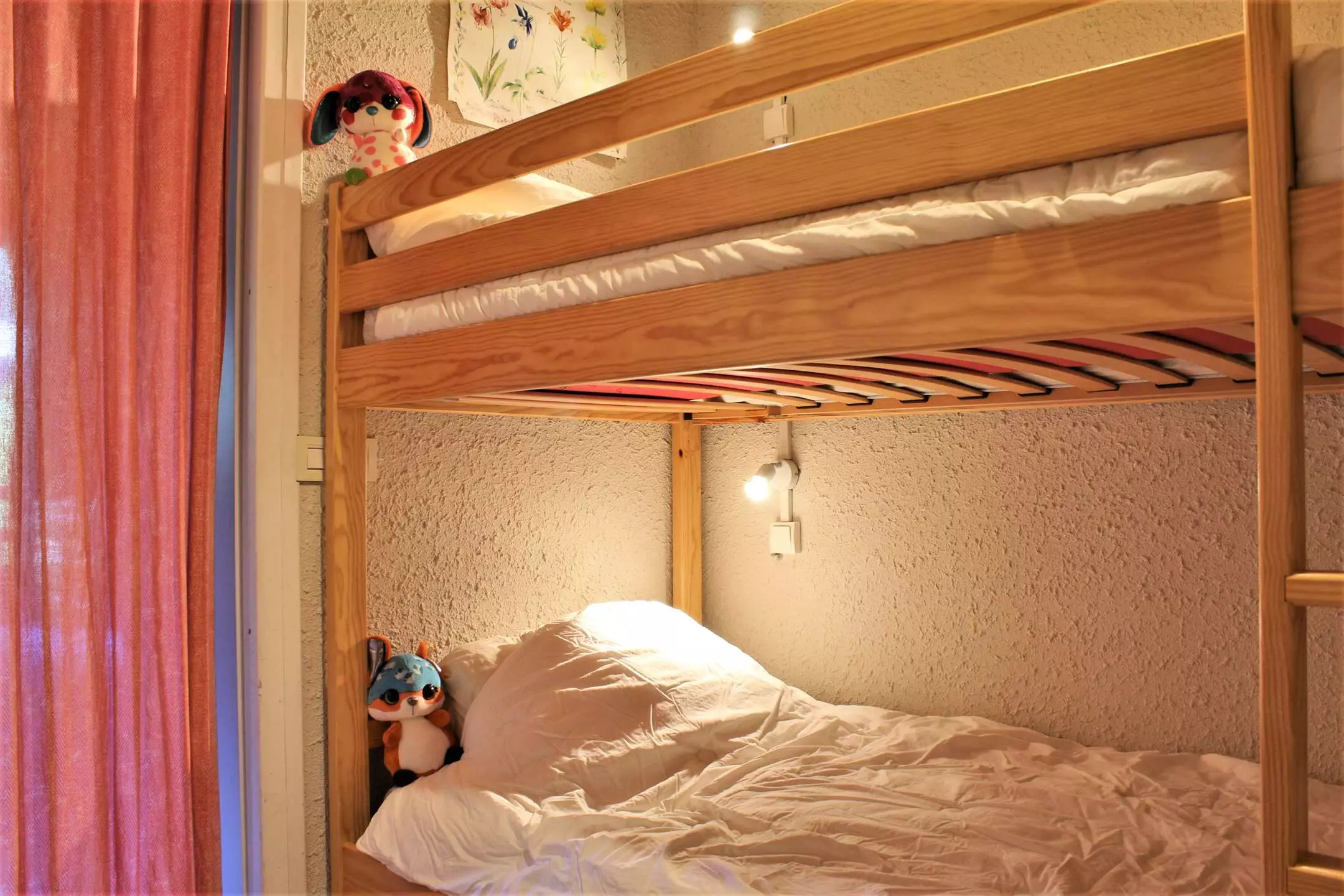Studio situé au 1er étage dans une résidence au calme, et proche des pistes. Il s'organise autour de deux lits superposés dans un coin montagne et d'un canapé clic-clac dans la pièce de vie avec la télévision, d'une cuisine équipée, d'une salle de bain et de WC indépendants. L'appartement dispose aussi d'un casier à ski.