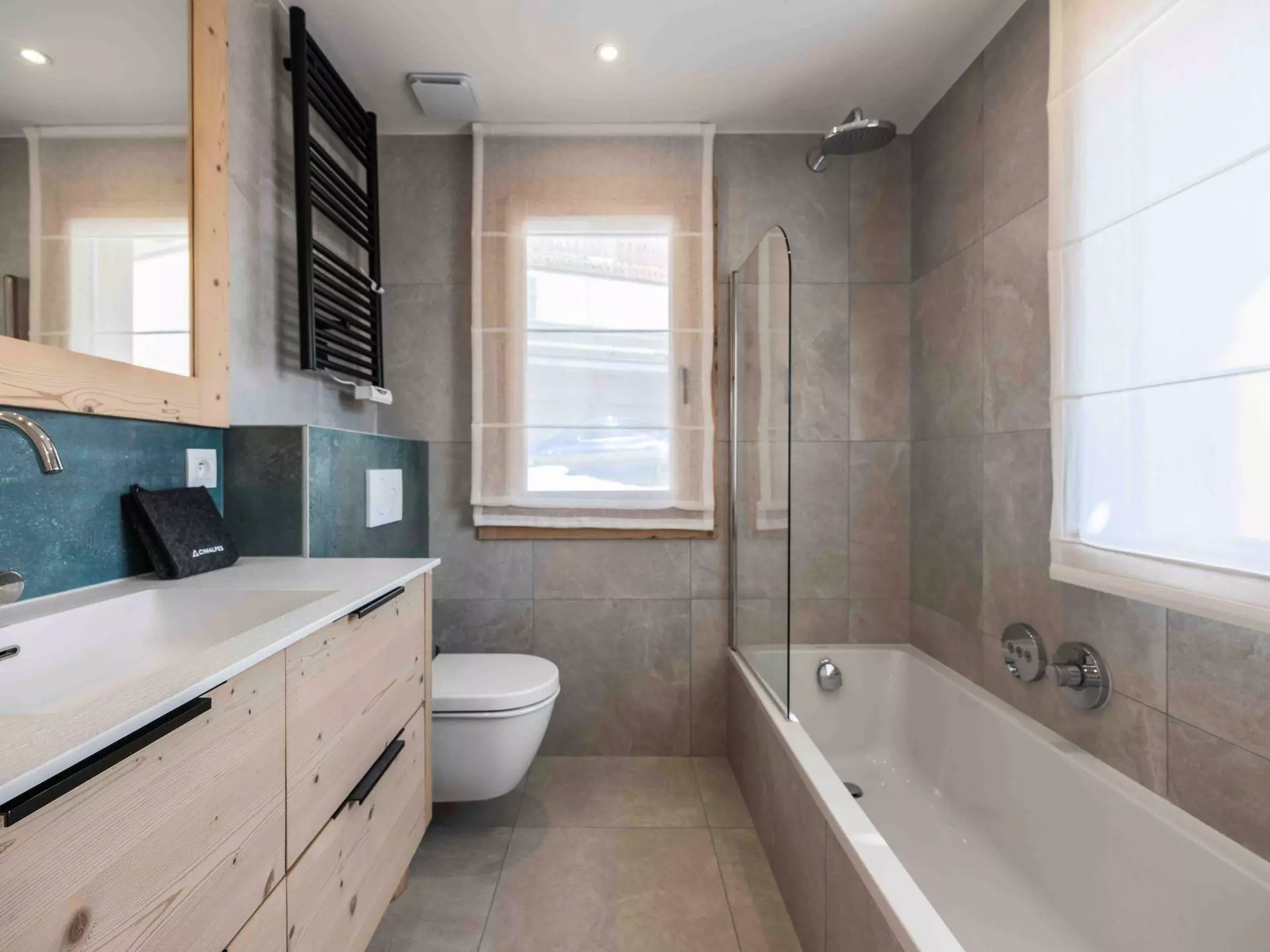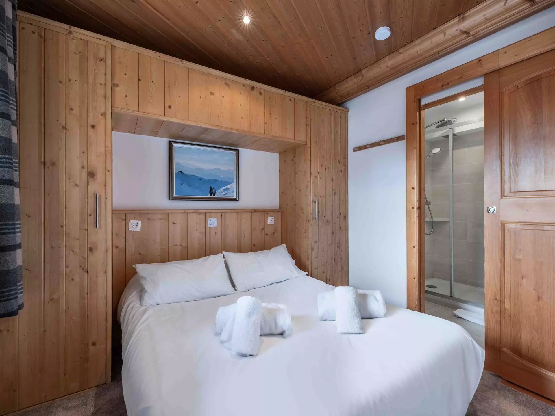 - Chambre 1 : lit double (180x200) avec accès balcon, en suite avec salle de bain, salle de douche et WC