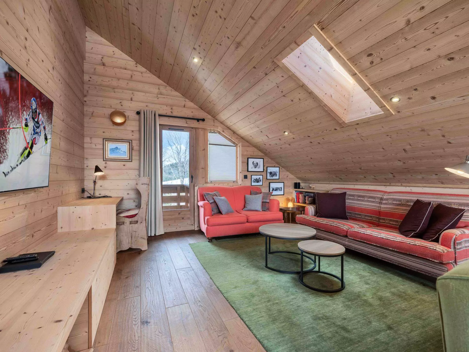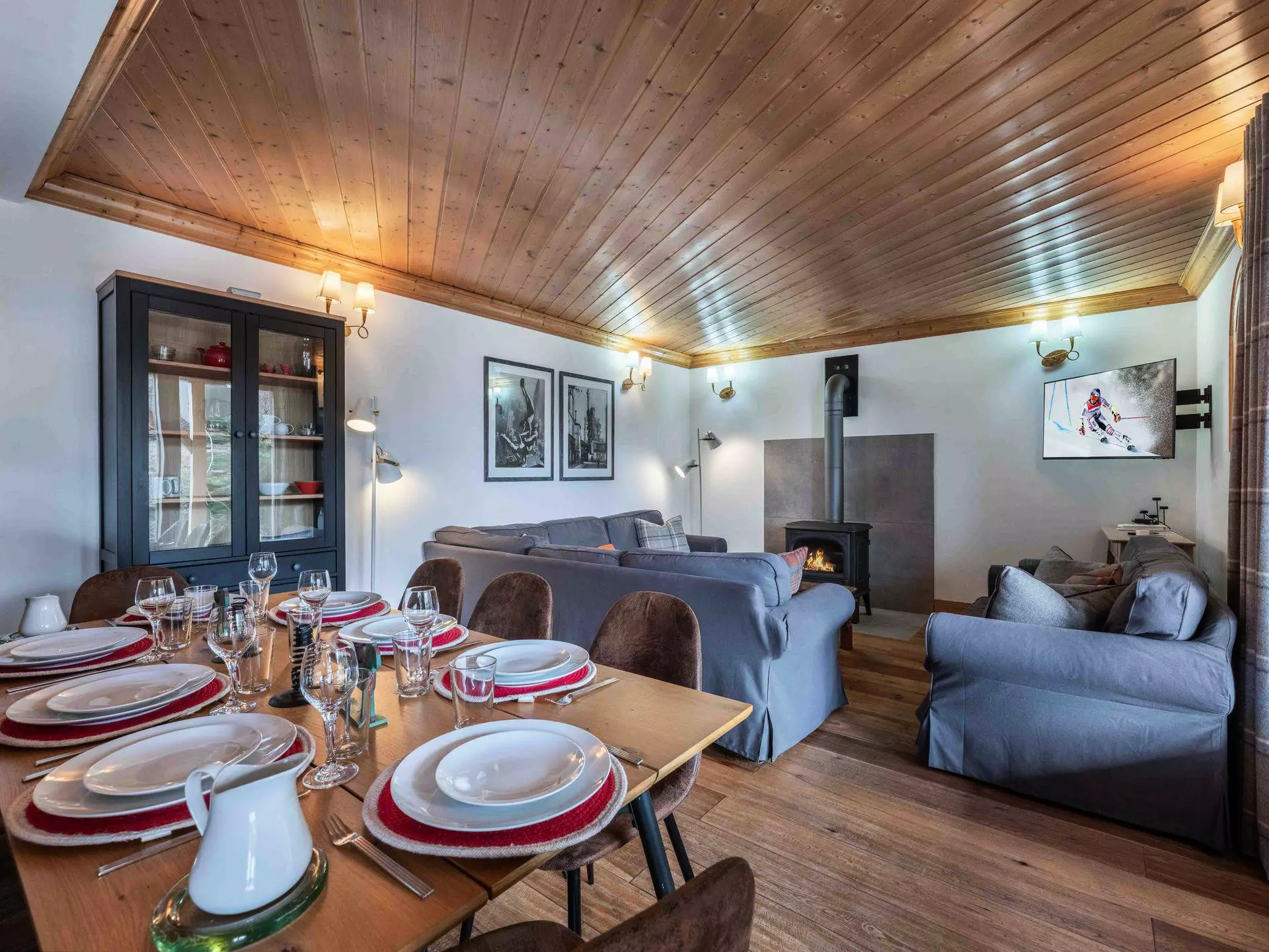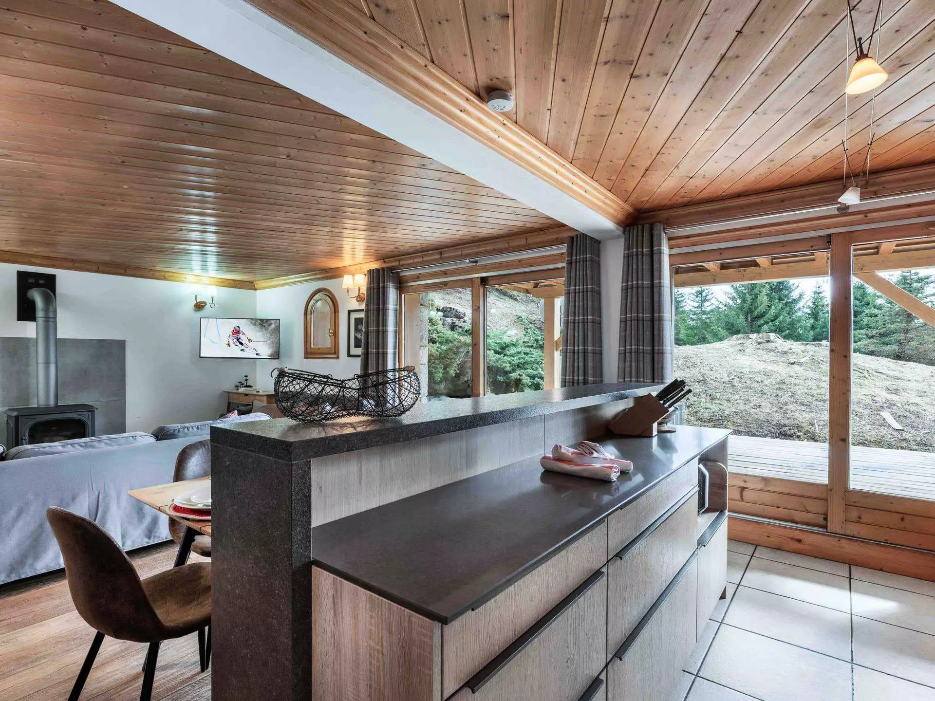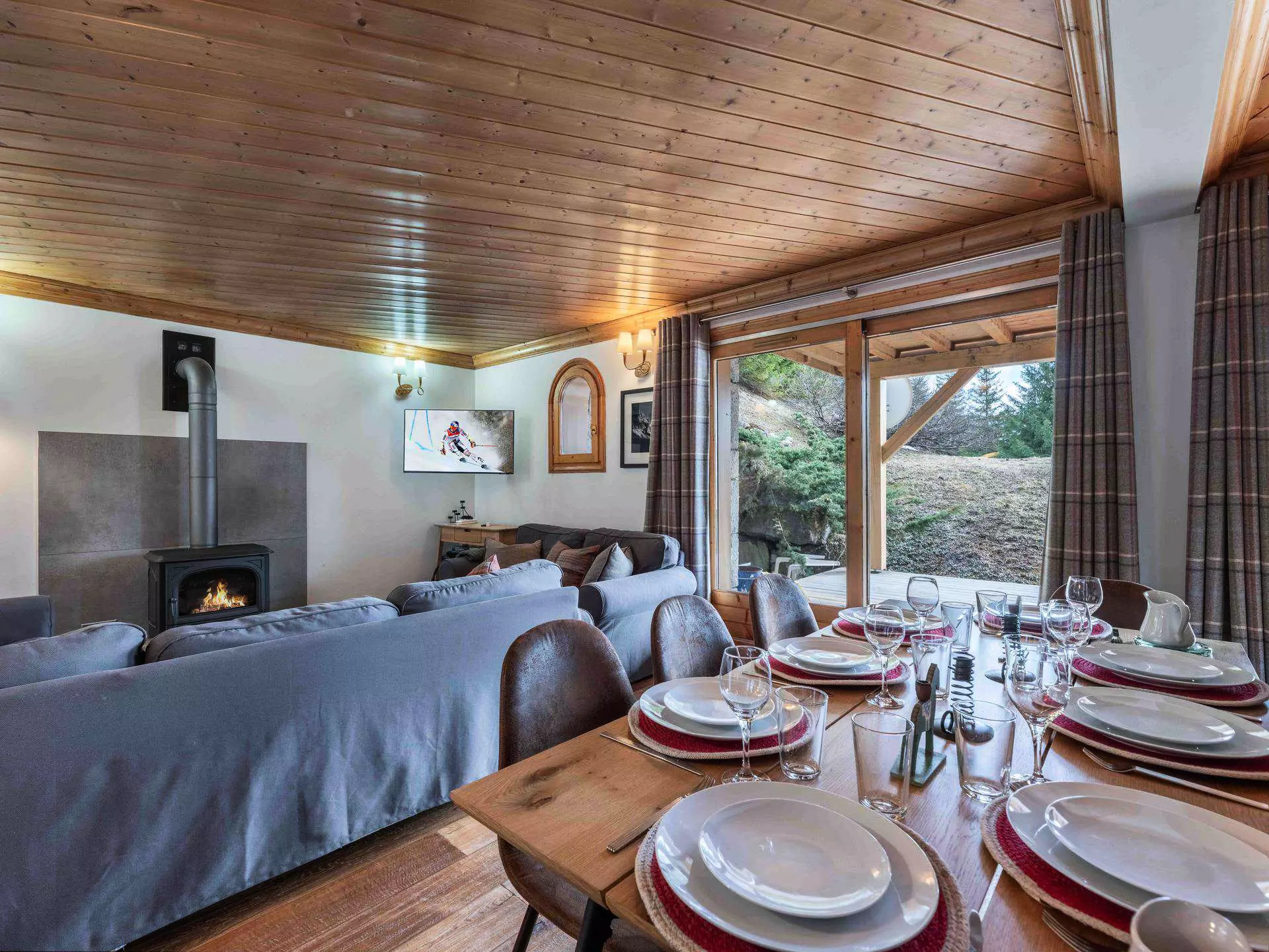 - Salon / salle à manger avec TV, poële à bois et terrasse exposée sud-ouest