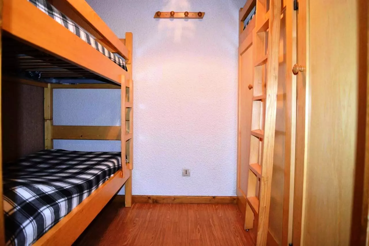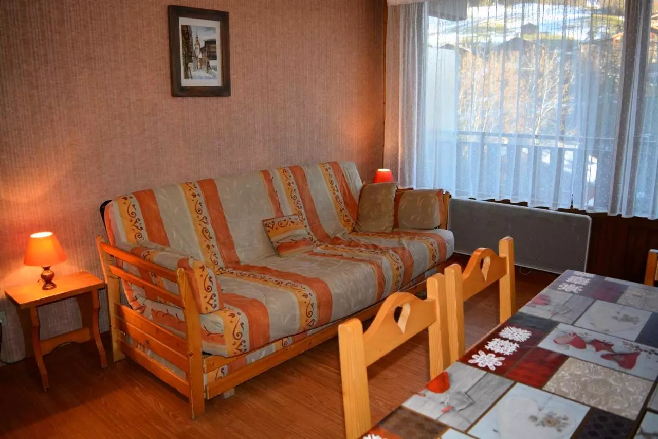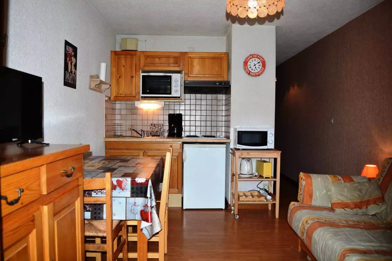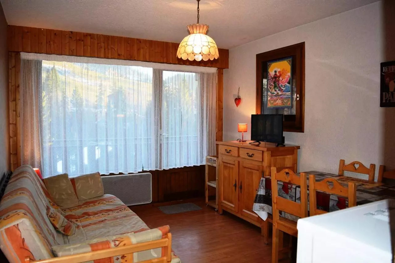 Cet appartement de vacances situé au niveau -2, comprend un séjour avec 1 canapé convertible 2 places et télévision, un accès balcon sud avec vue sur le domaine skiable, un coin cuisine équipé, un coin nuit avec 2 lits superposés , une salle de bains avec WC.
