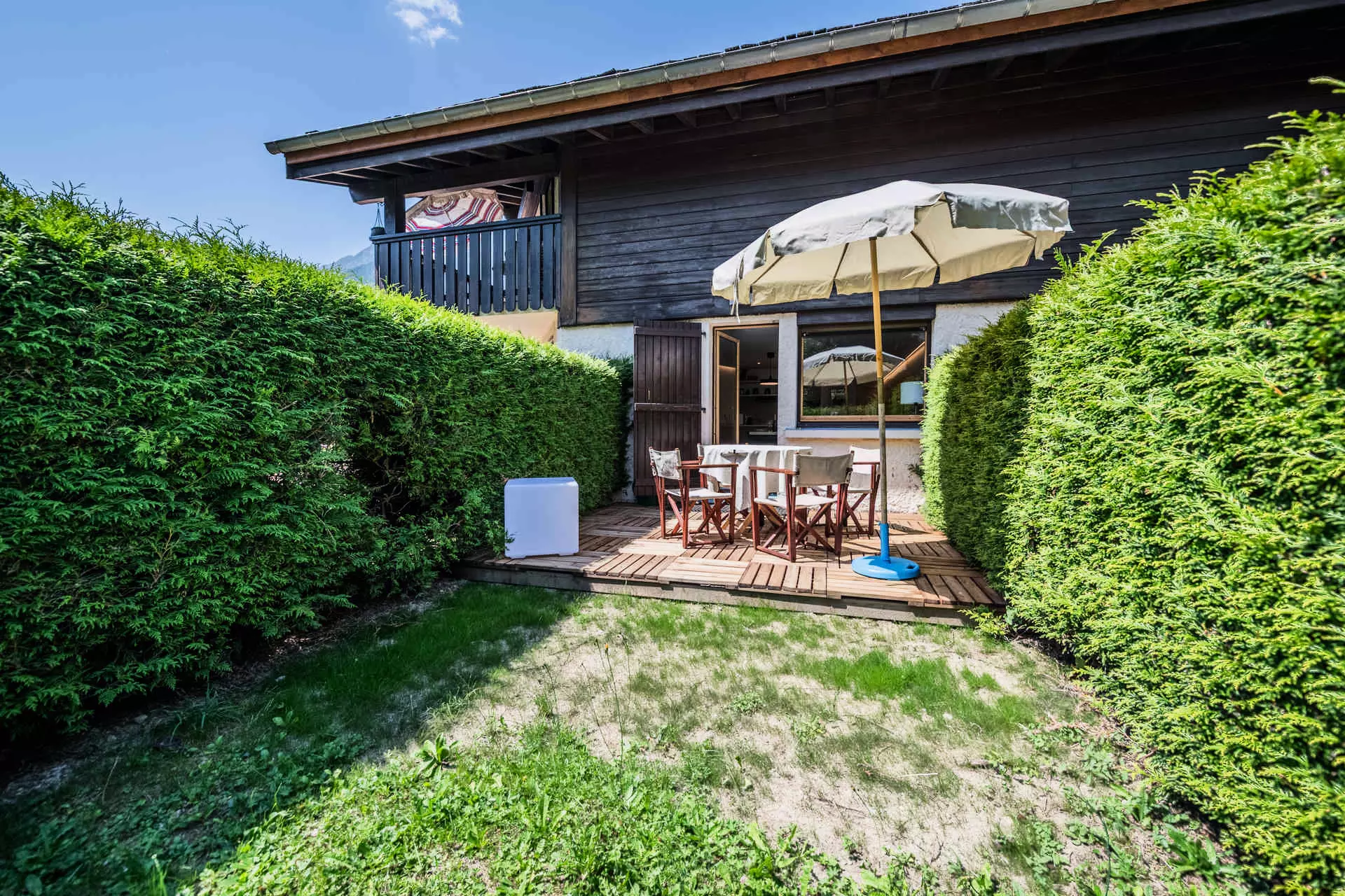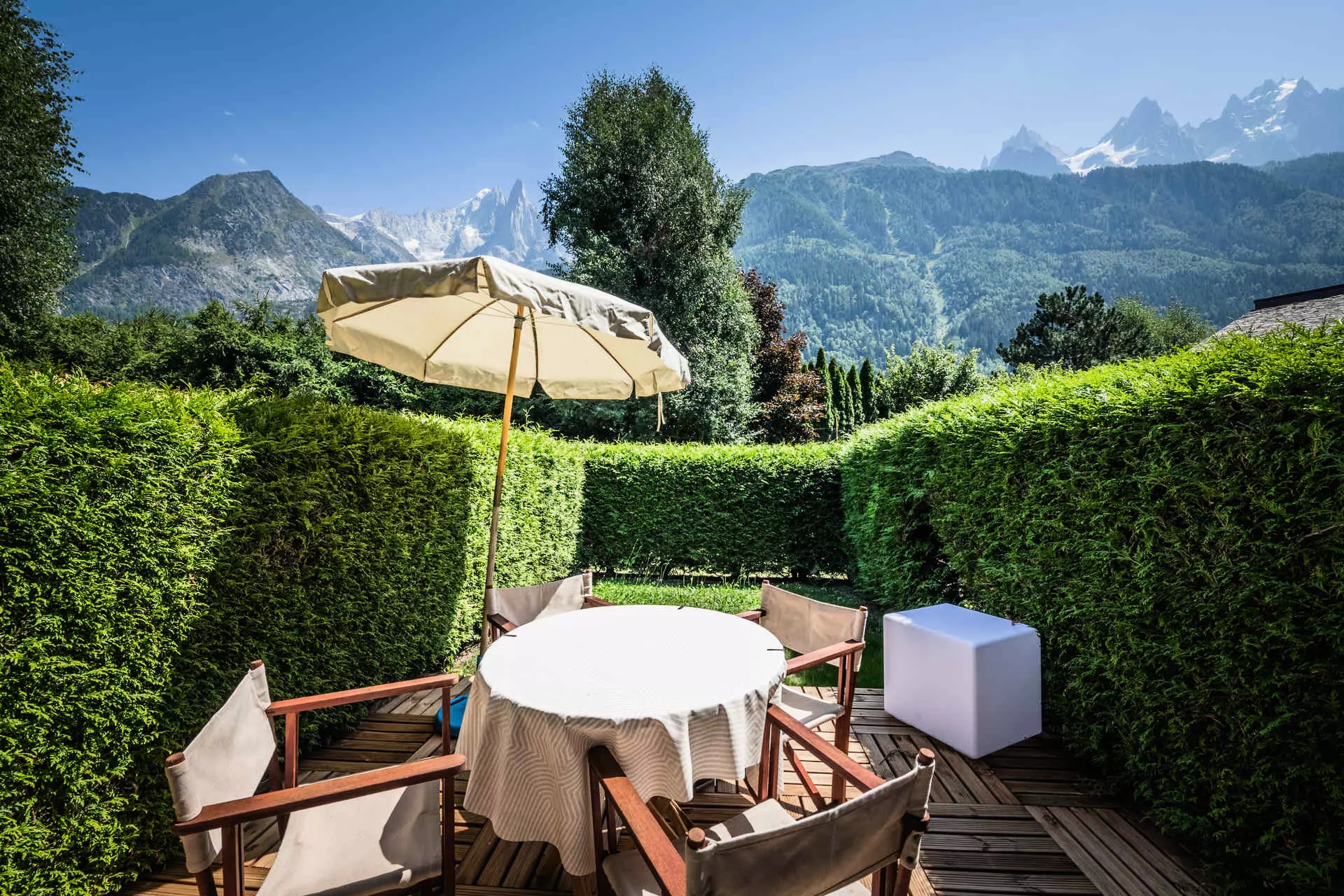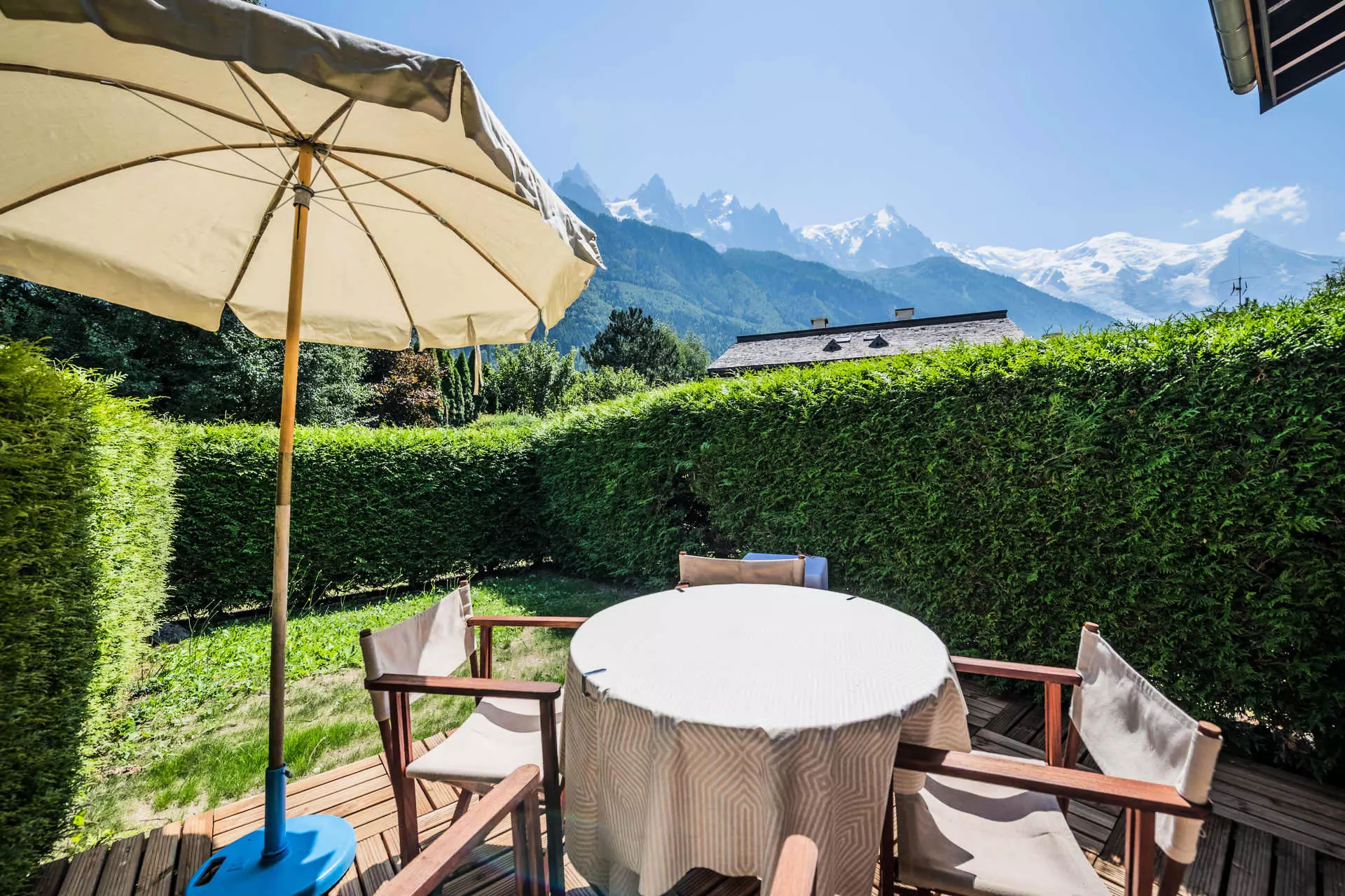 Profitez d'un espace extérieur avec une belle terrasse et un jardin privatif, face à une vue imprenable sur les Drus et l'Aiguille Verte.