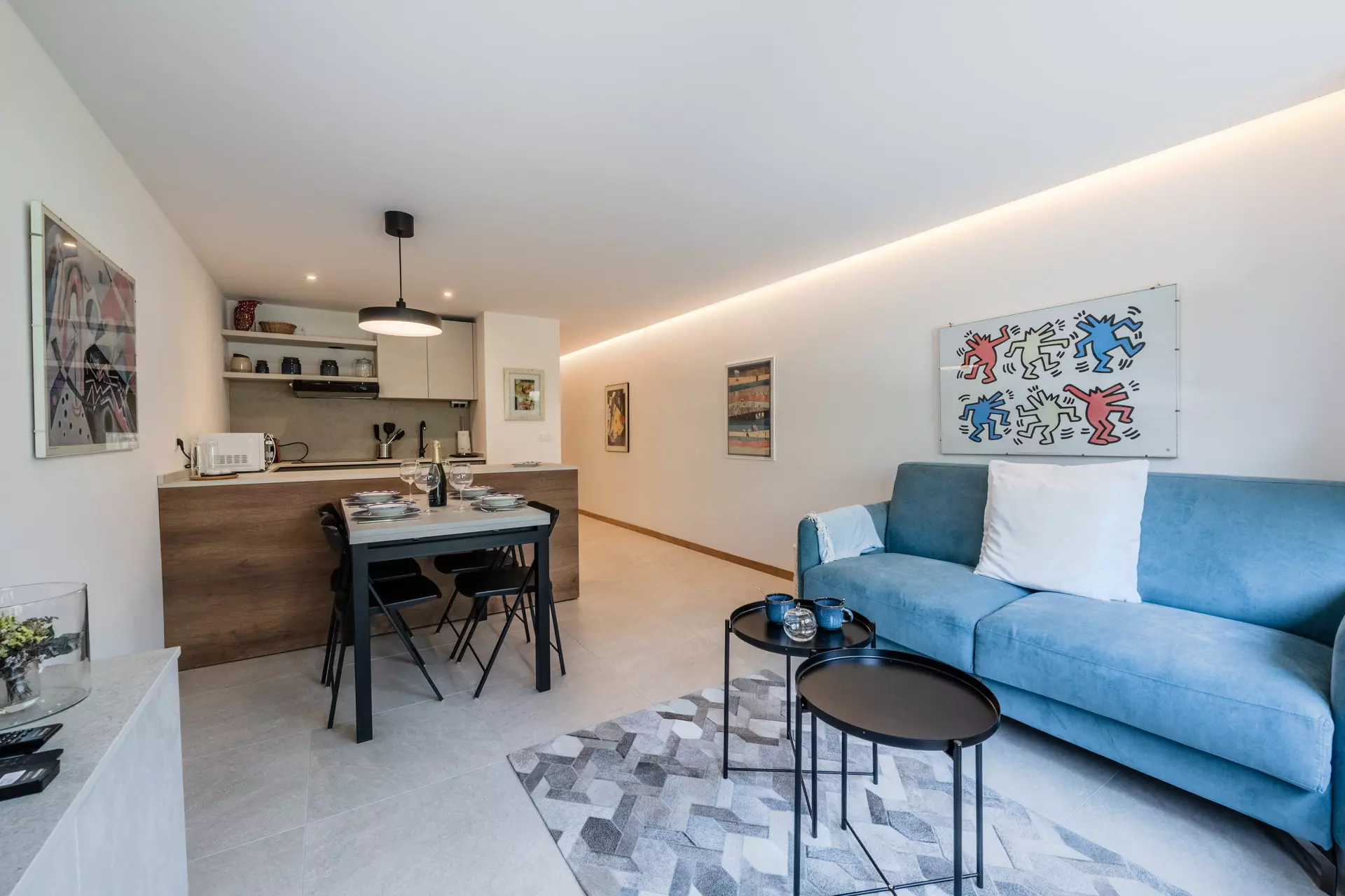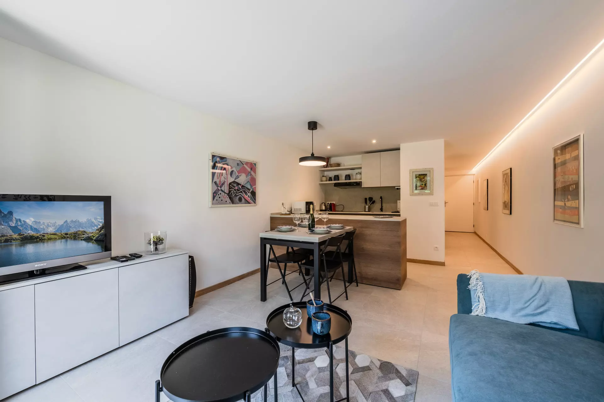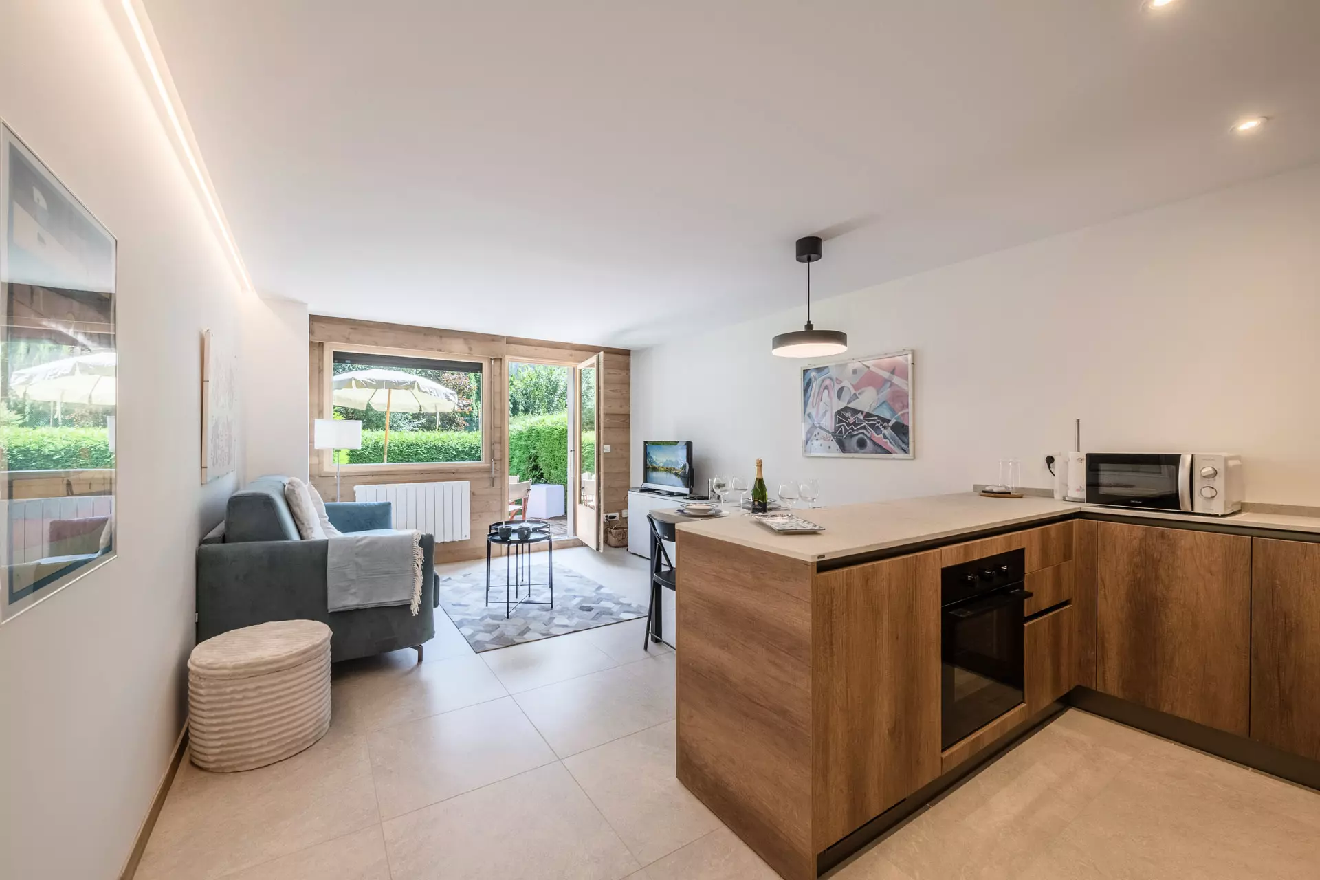 Il se compose d'une chambre double, d'une cuisine entièrement équipée ouverte sur un salon / séjour lumineux et offre un cadre chaleureux et moderne.