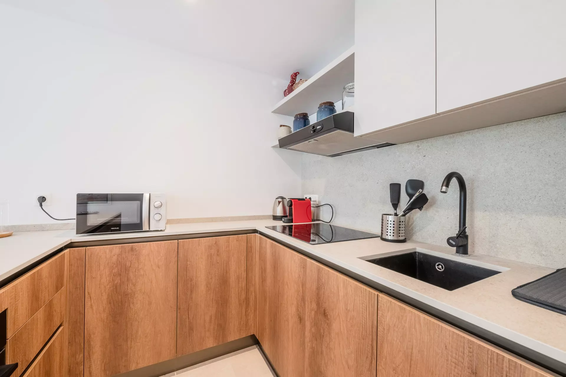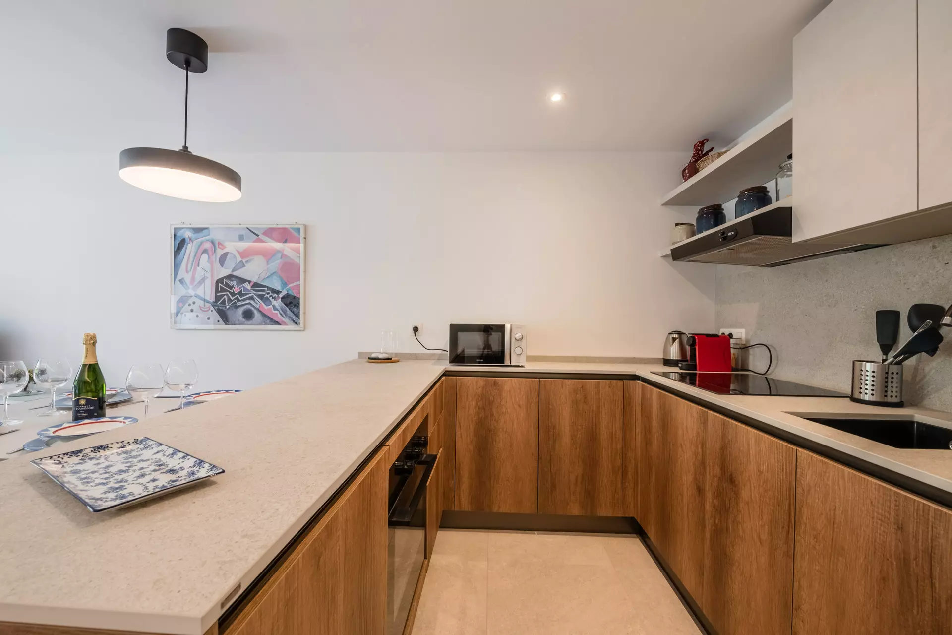 - Coin cuisine équipé (plaque à induction, four, réfrigérateur, lave-vaisselle, machine à café Nespresso, bouilloire, grille-pain, lave-linge)