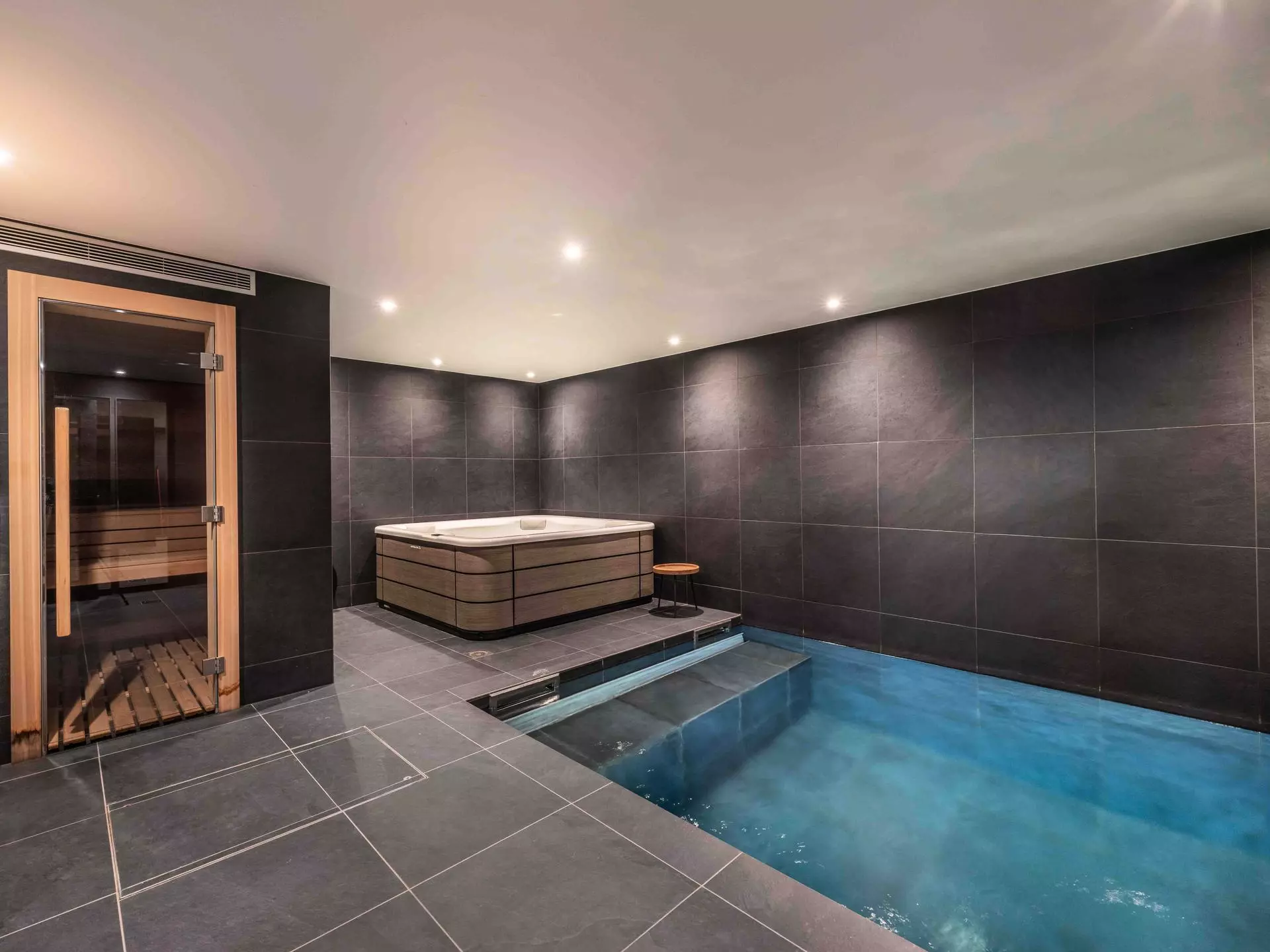 - Espace détente : Piscine à nage à contre courant, bains à remous intérieur, sauna et salle de douche avec toilettes
