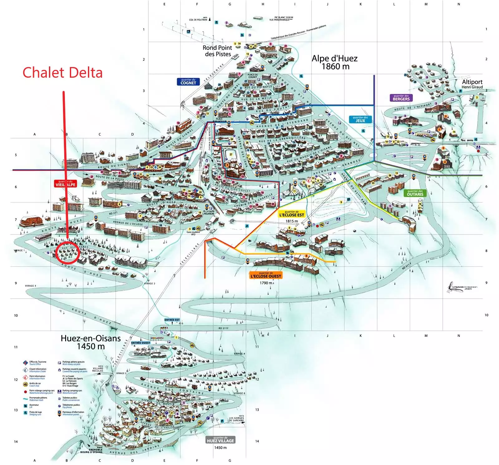 L'Alpe d'Huez s'est développée à 1860 mètres d'altitude sur le massif des Grandes Rousses et bénéficie d'un ensoleillement généreux.