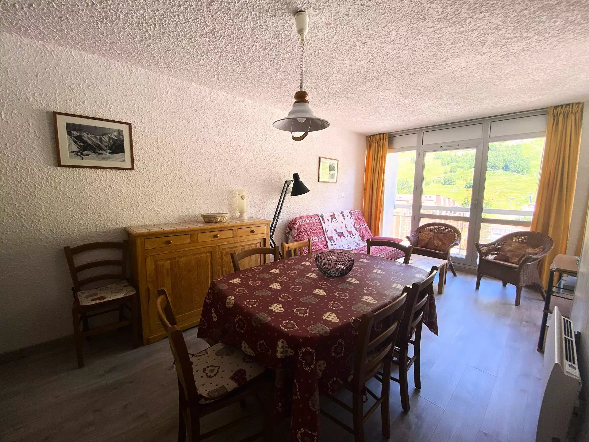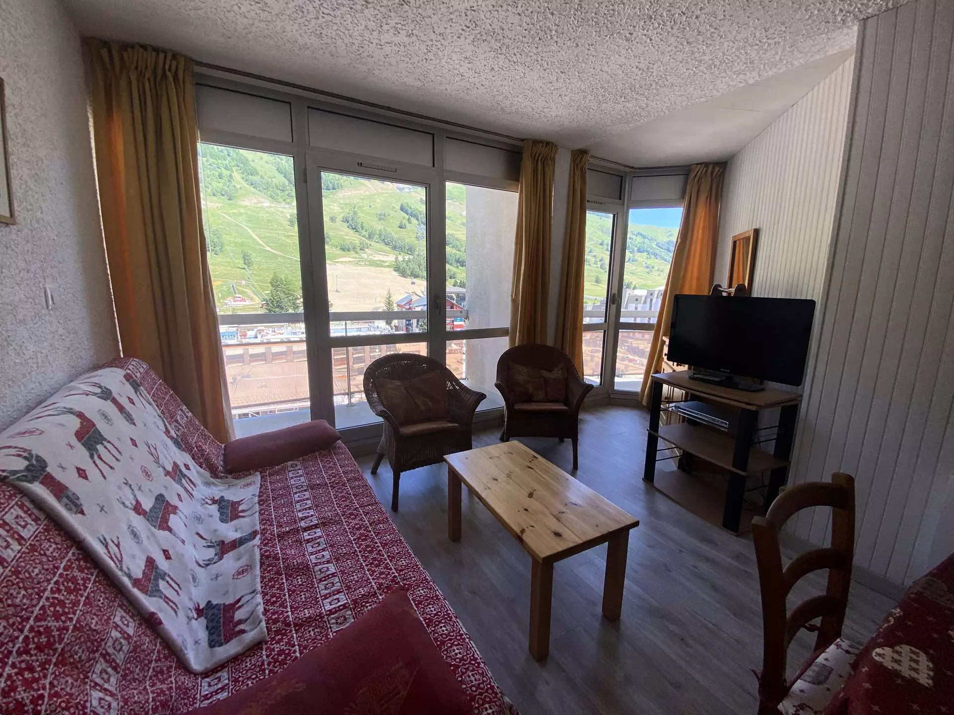 Le séjour est baigné de lumière grâce à son accès à un balcon d'environ 5m², exposé EST avec une vue imprenable sur les pistes, et aux premières loges pour contempler toutes les animations de la station (descente aux flambeaux, feux d'artifice, etc.).
