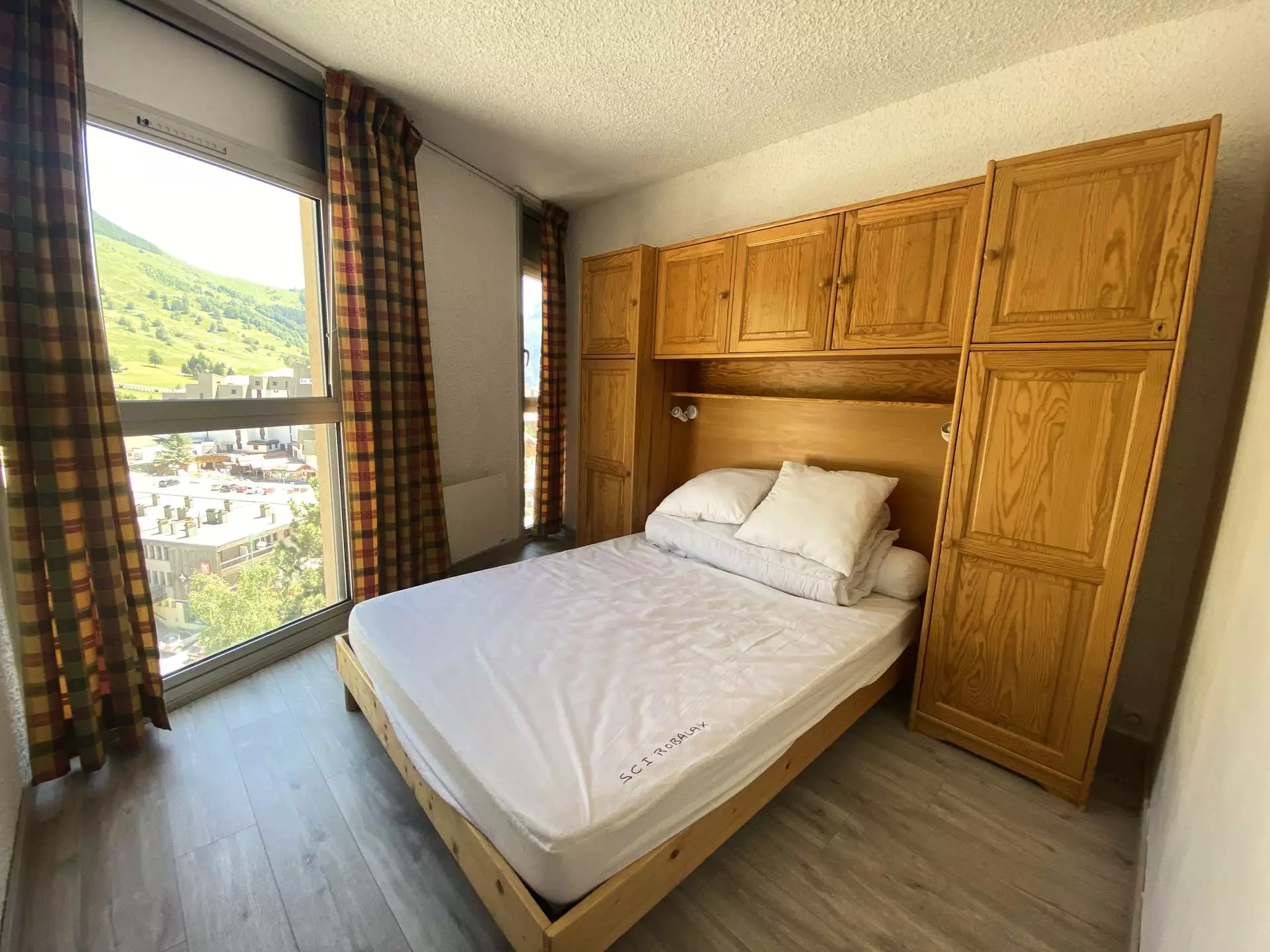- 2 chambres en enfilade. La première dispose de 2 lits simples superposés avec rangement et la deuxième d'un lit double avec rangements ainsi qu'une belle vue sur les pistes.