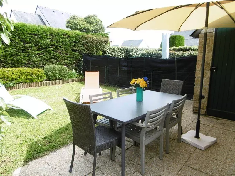 - Un petit jardin clos avec une terrasse équipée d'un salon de jardin, d'un parasol, de bains de soleil et d'un barbecue.