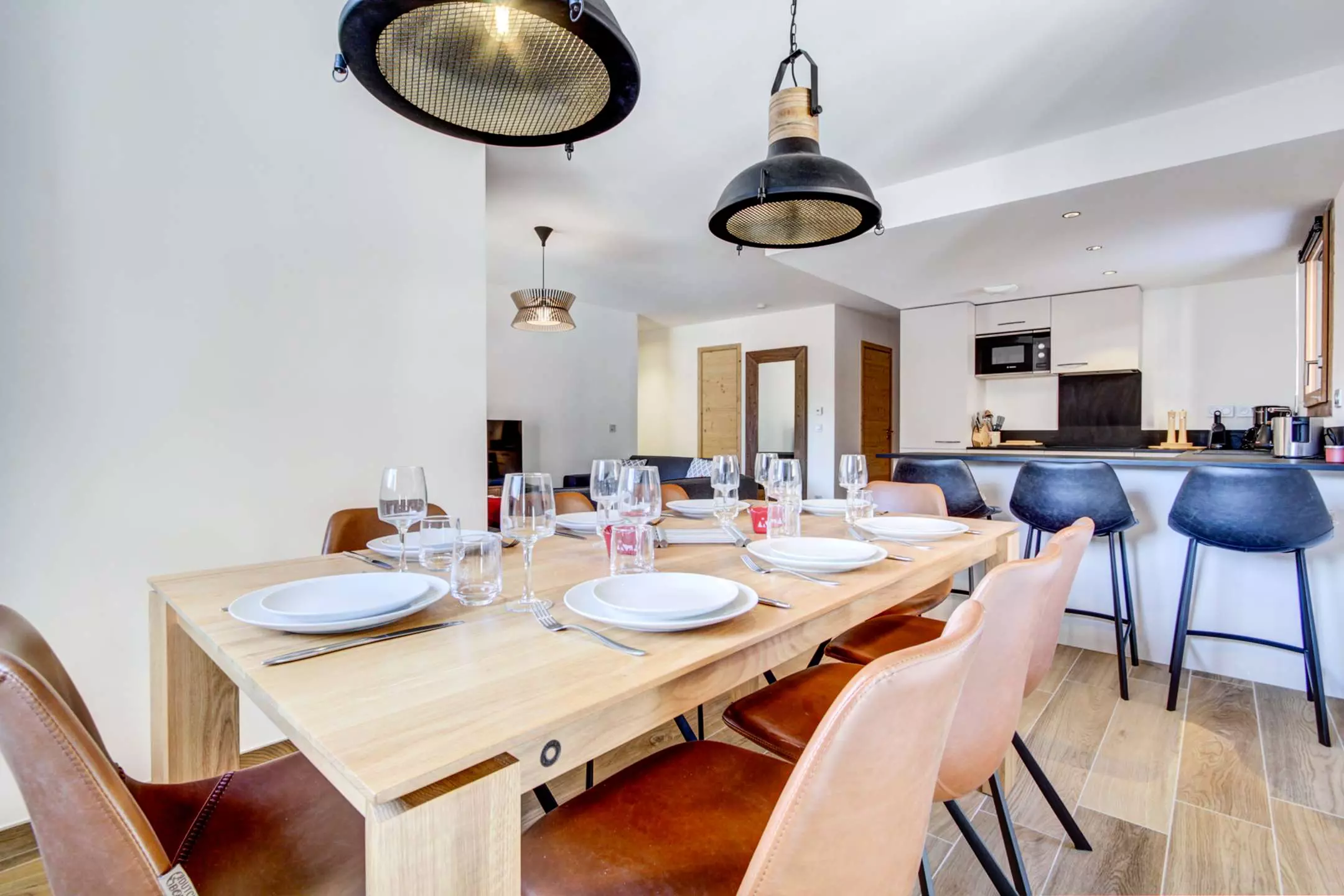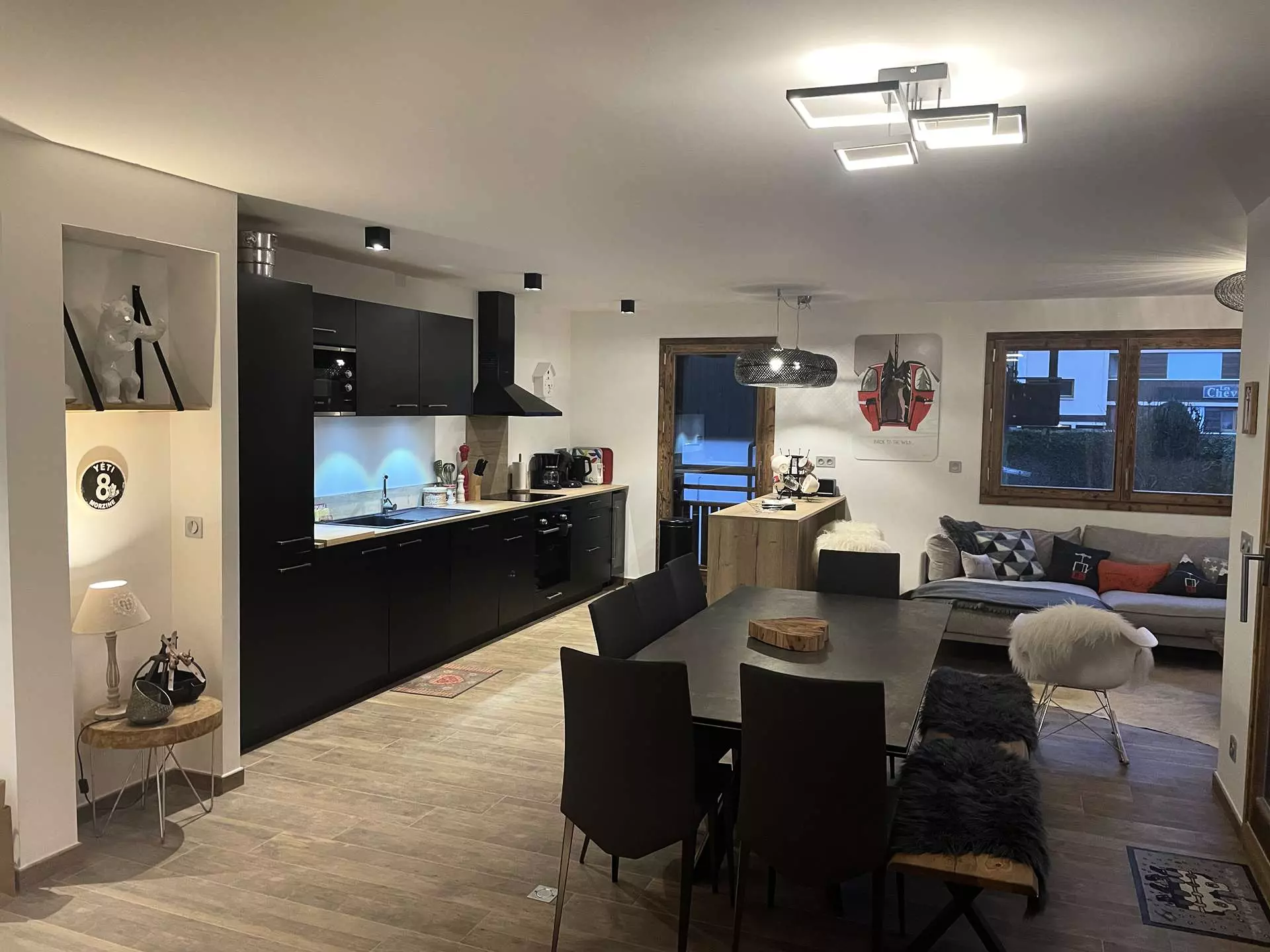 - belle pièce à vivre avec cuisine ouverte équipée, coin repas, salon avec canapé-lit pour 2 personnes et accès terrasse avec vue sur Super-Morzine