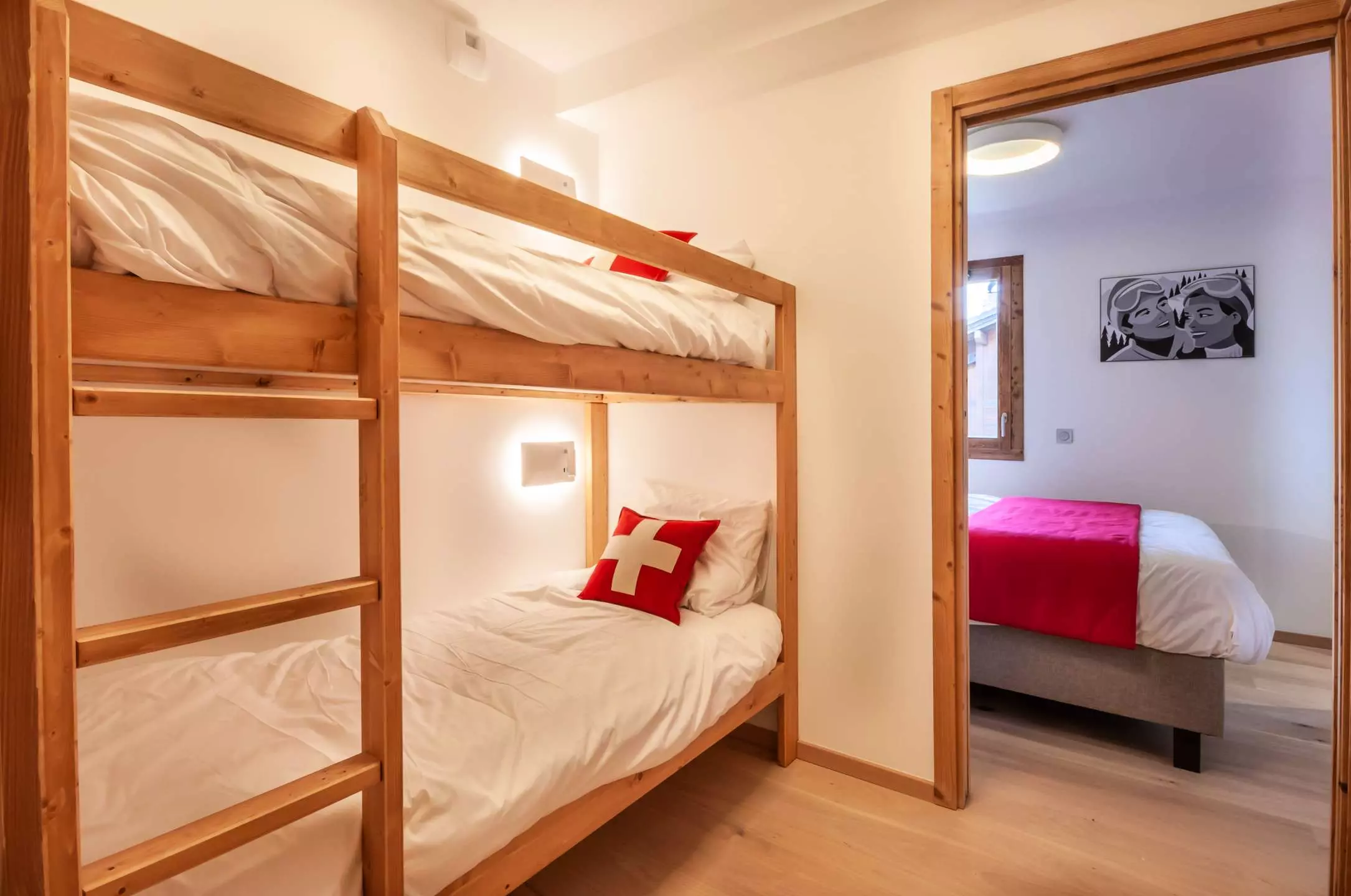 Une seconde chambre avec un lit double ou deux lits simples et deux lits simples superposés, rangement
