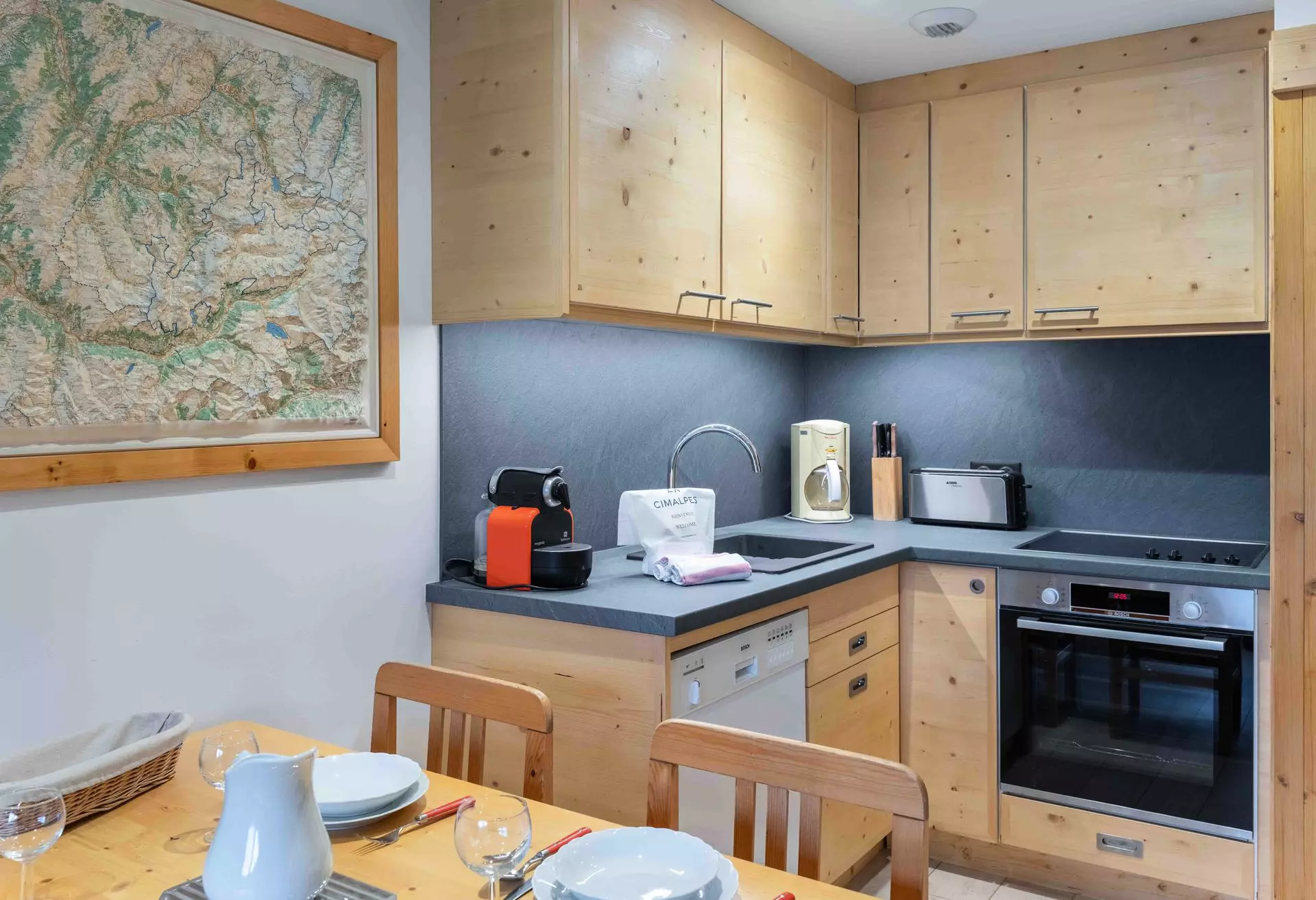 - Cuisine équipée, ouverte : réfrigérateur, four, four micro-onde, lave-vaisselle, plaque vitrocéramique, grille-pain, Nespresso, cafetière à filtre, service à fondue, appareil à raclette et pierrade
