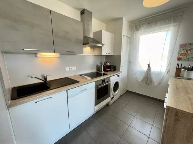 - d'une cuisine ouverte et équipée (plaque induction 3feux, lave-vaisselle, micro-ondes, réfrigérateur-congélateur, four, lave-linge),