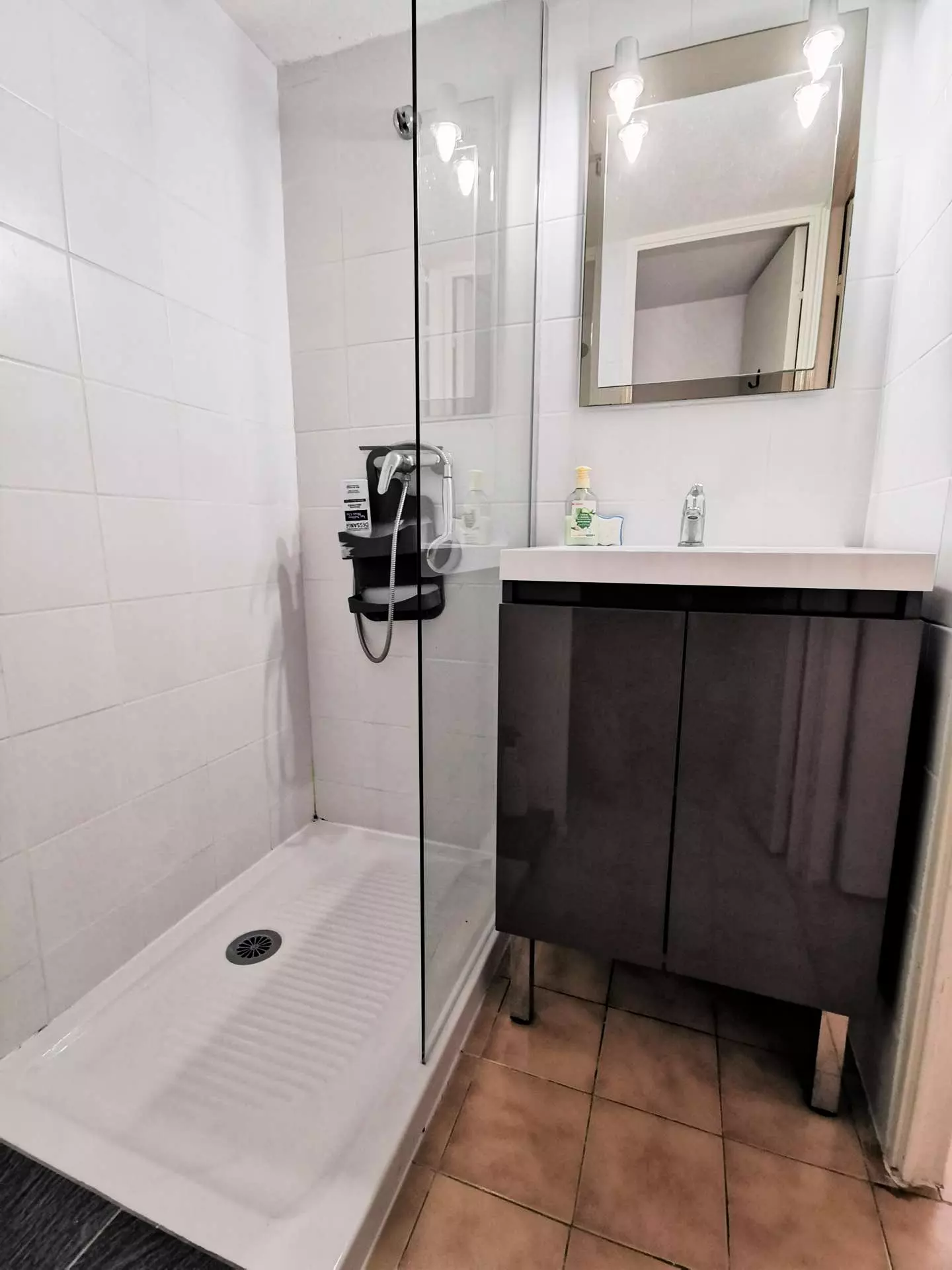 - Équipements : TV par Chrome Cast uniquement, plaques induction, réfrigérateur-congélateur, micro-ondes combiné, lave-vaisselle,lave-linge, cafetière nespresso, bouilloire, grille-pain, fer à repasser