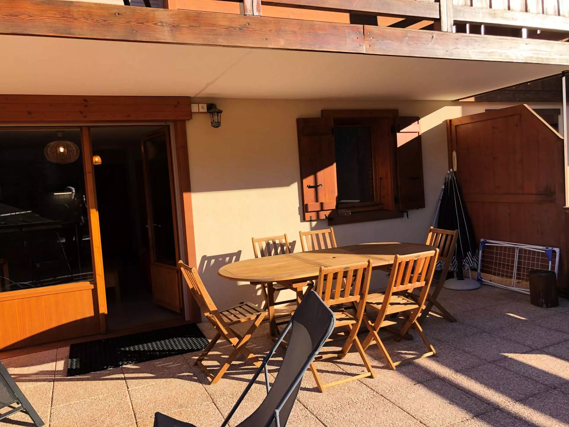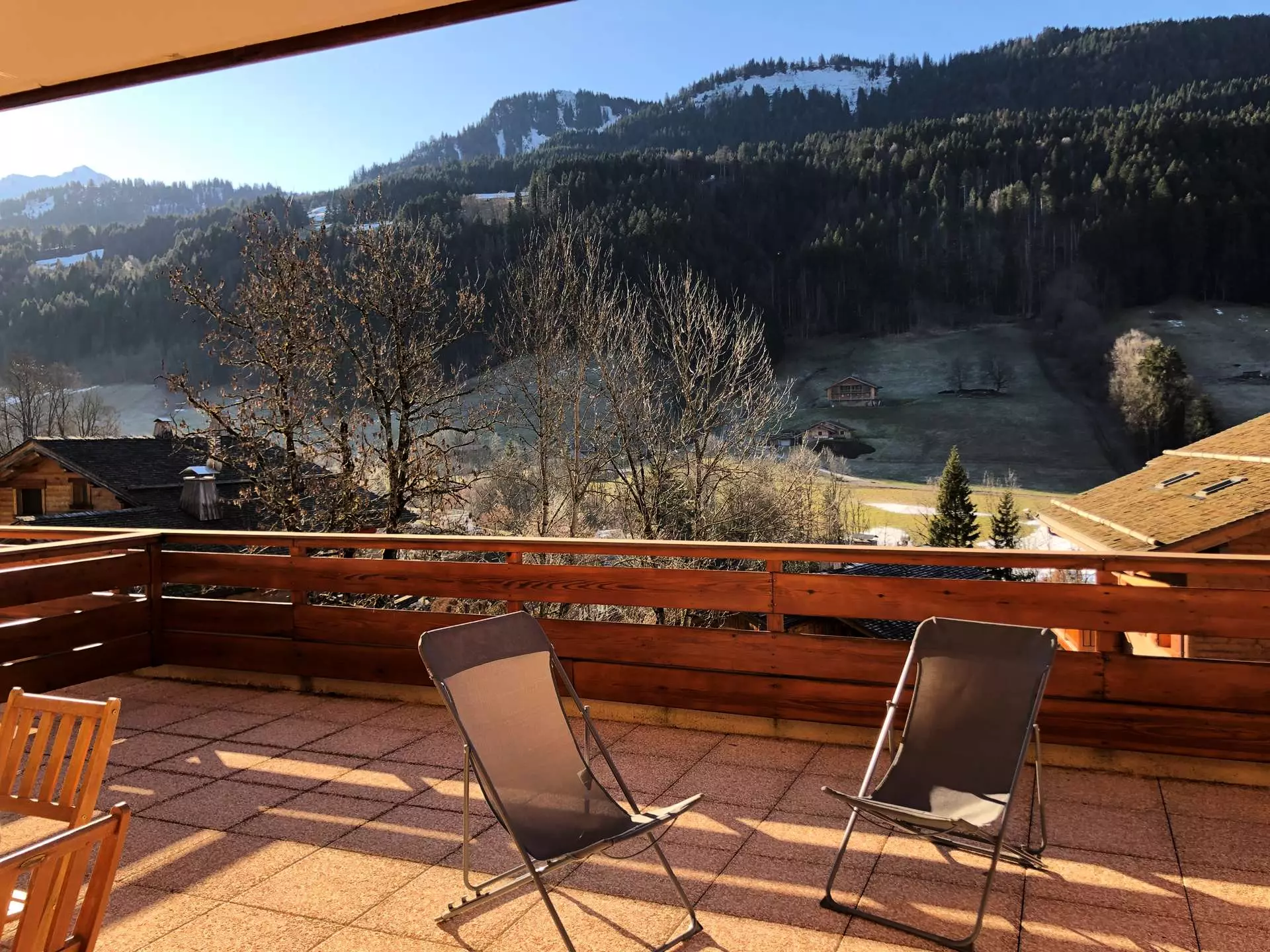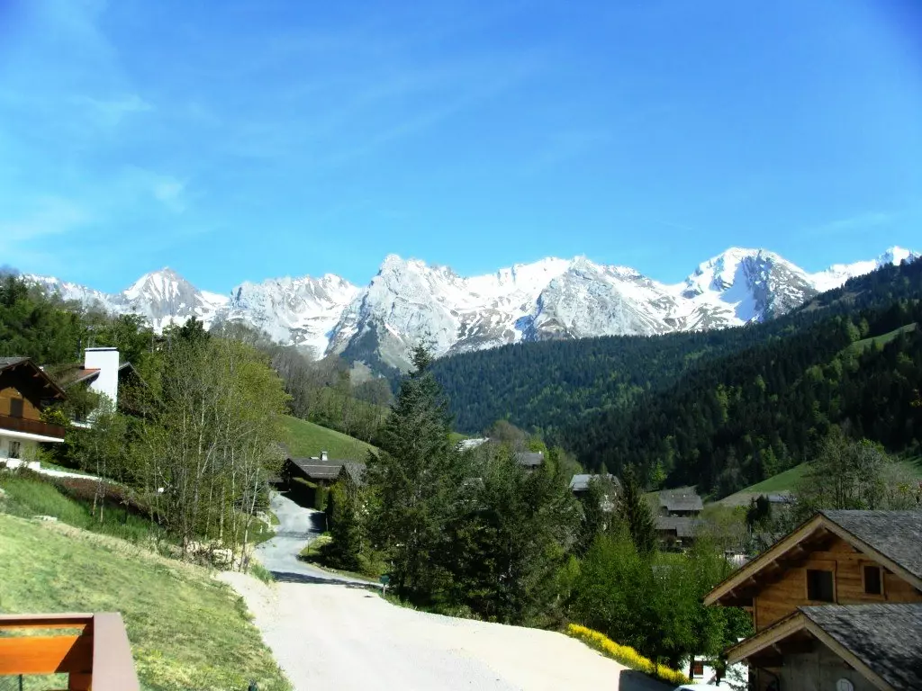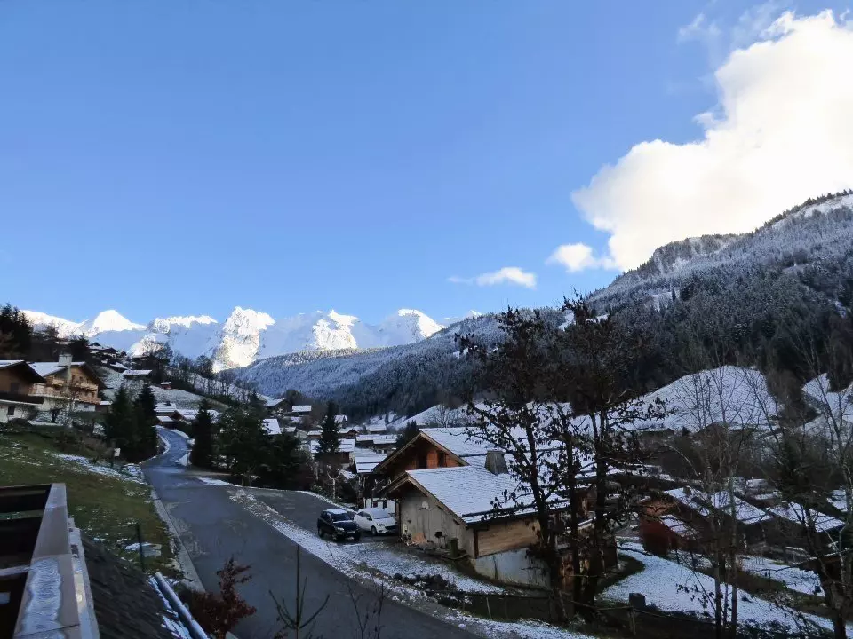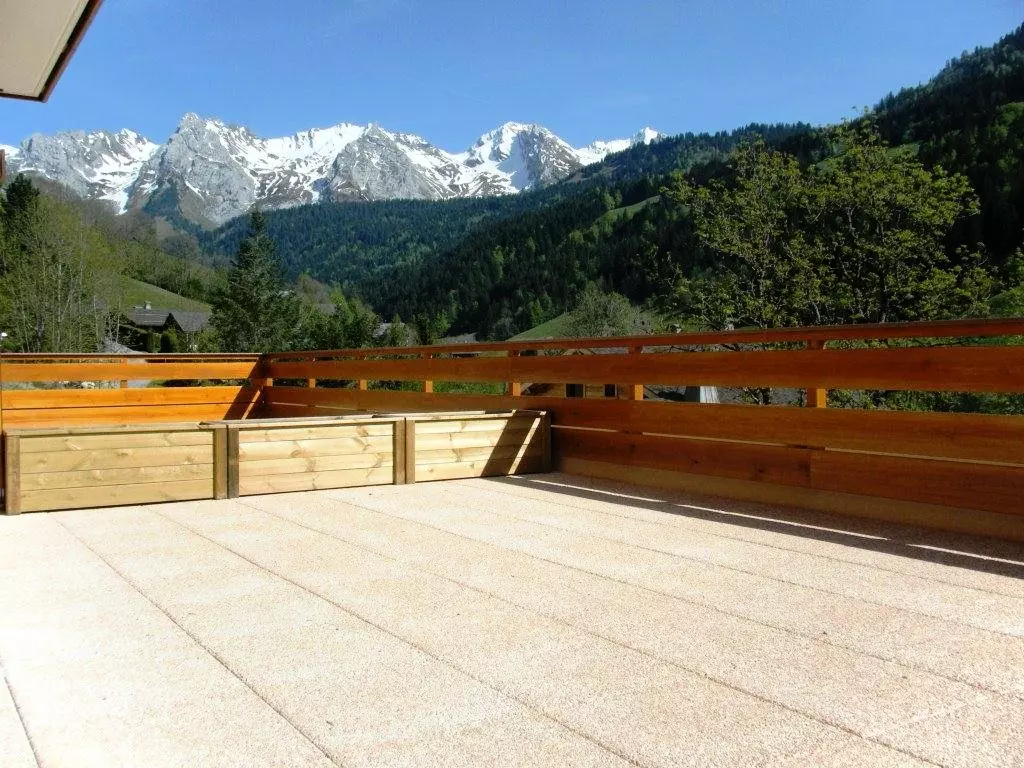 Balcon plein sud avec superbe vue sur le Massif des Aravis et le village.