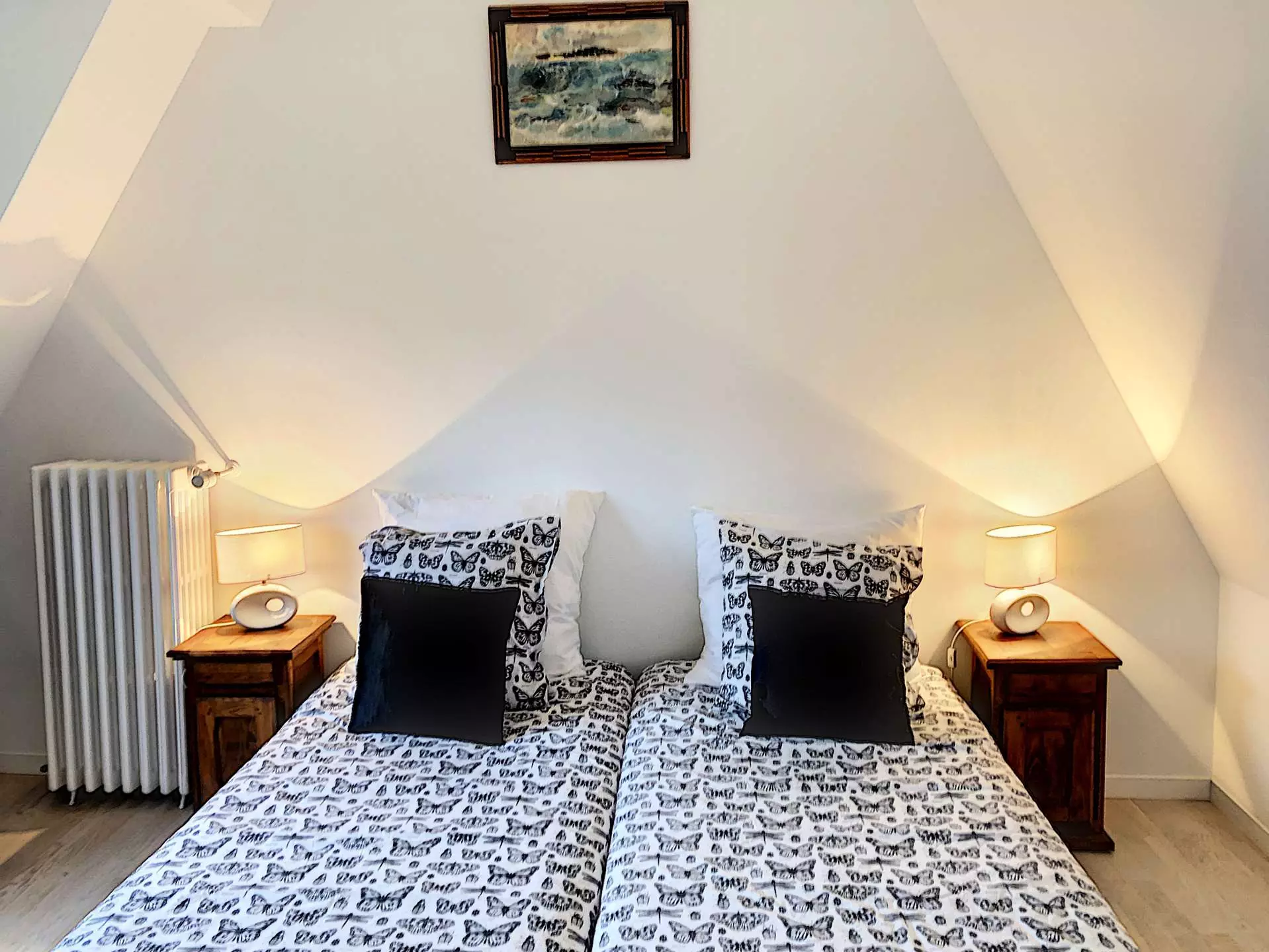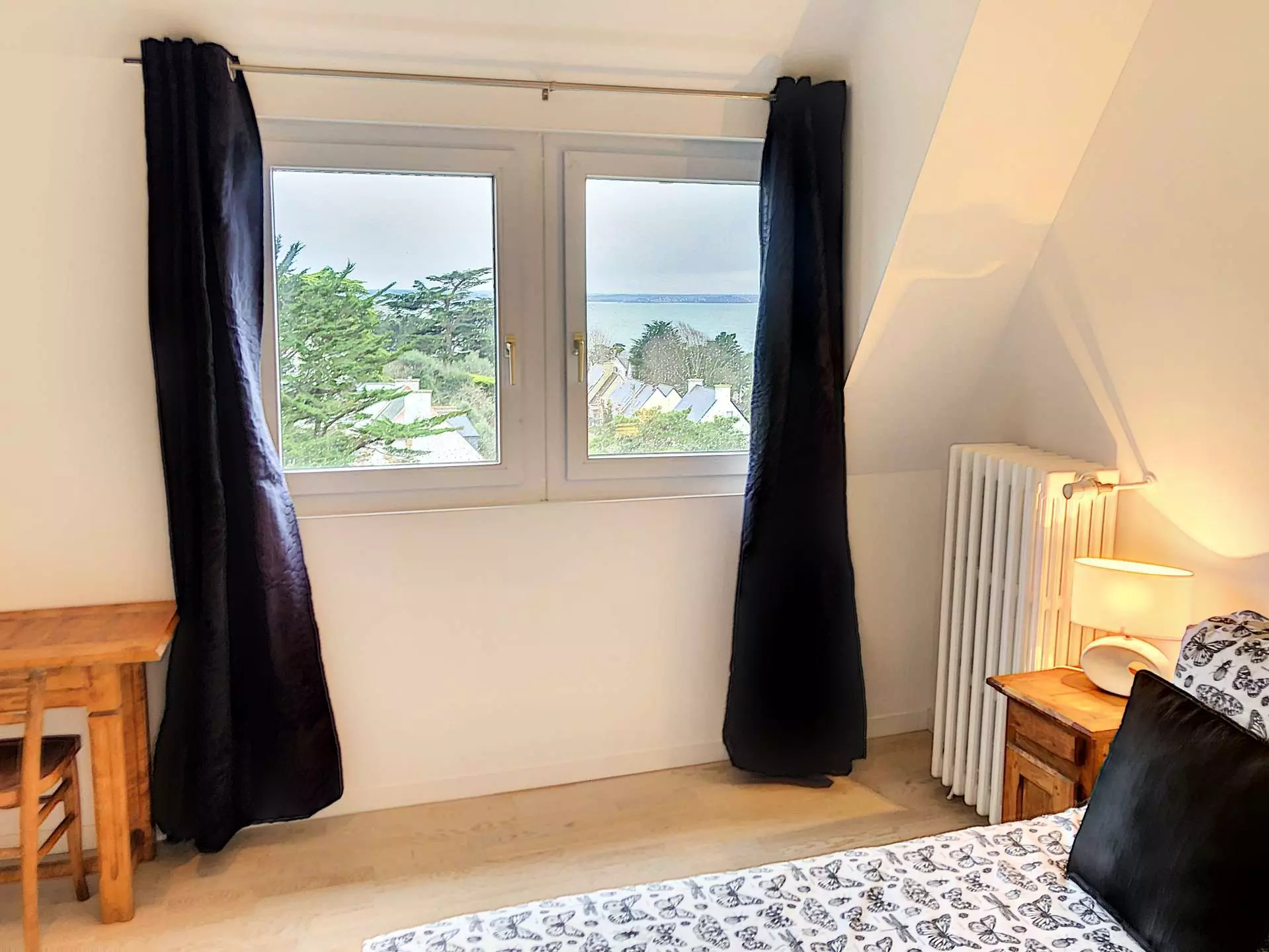 Ar C'hreiz superbe maison dans un cadre exceptionnel vue mer de toutes les pièces. Elle bénéficie d'un classement 4 étoiles pour son confort. 120 m² agencés sur 4 niveaux : grand séjour comprenant la cuisine, l'espace repas et le salon, accès terrasse. Niveau jardin : une chambre lit double, une salle d'eau attenante avec douche et toilettes, une buanderie. Au premier étage, une chambre lit double et une chambre deux lits simples, toilettes séparées et une salle d'eau. Au-dessus, une chambre avec lit double, une salle d'eau avec des toilettes. Jardin et parking privé clos d'un portail électrique. Logement non fumeur, chiens bienvenus (2 maximum). Linge et ménage final inclus.