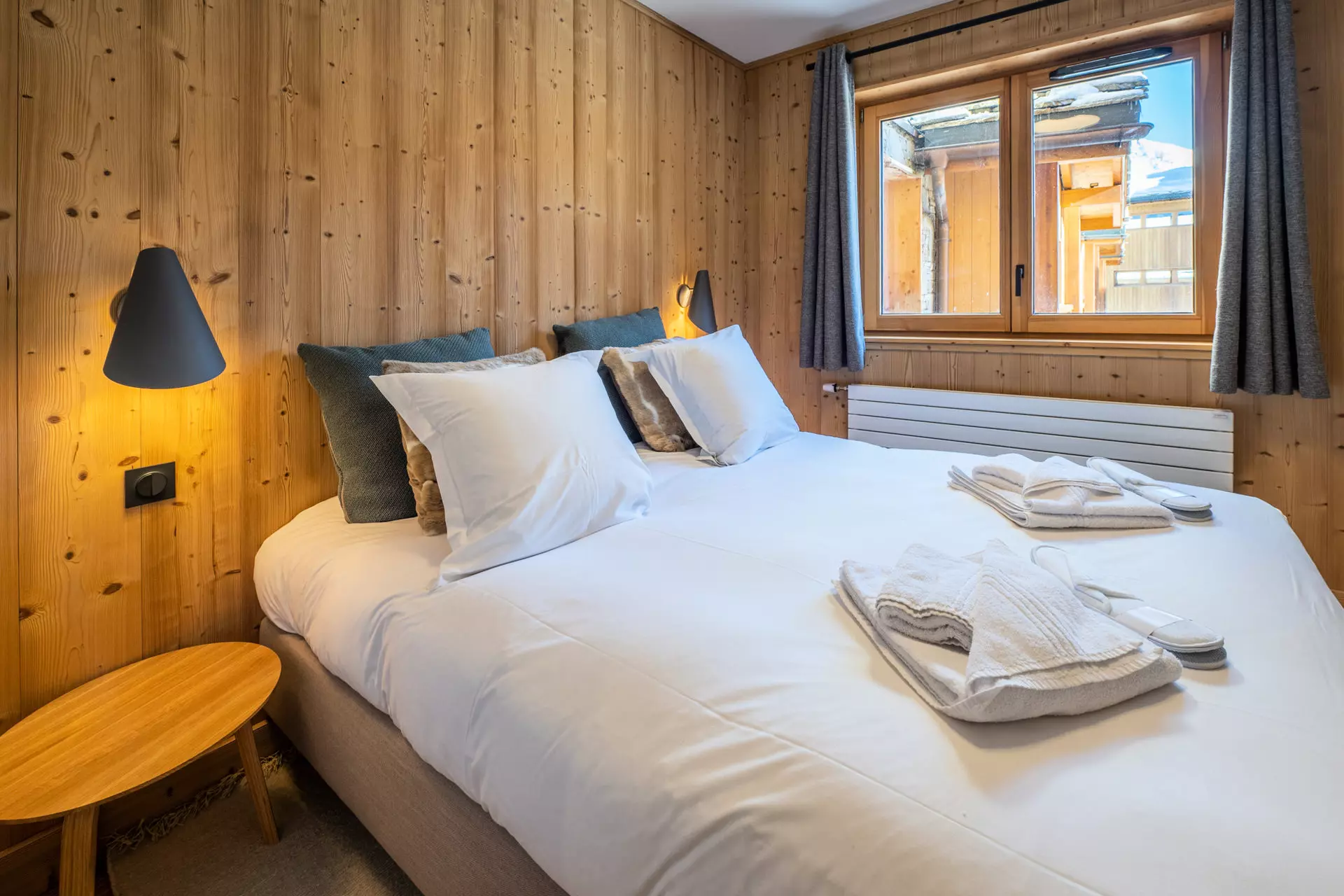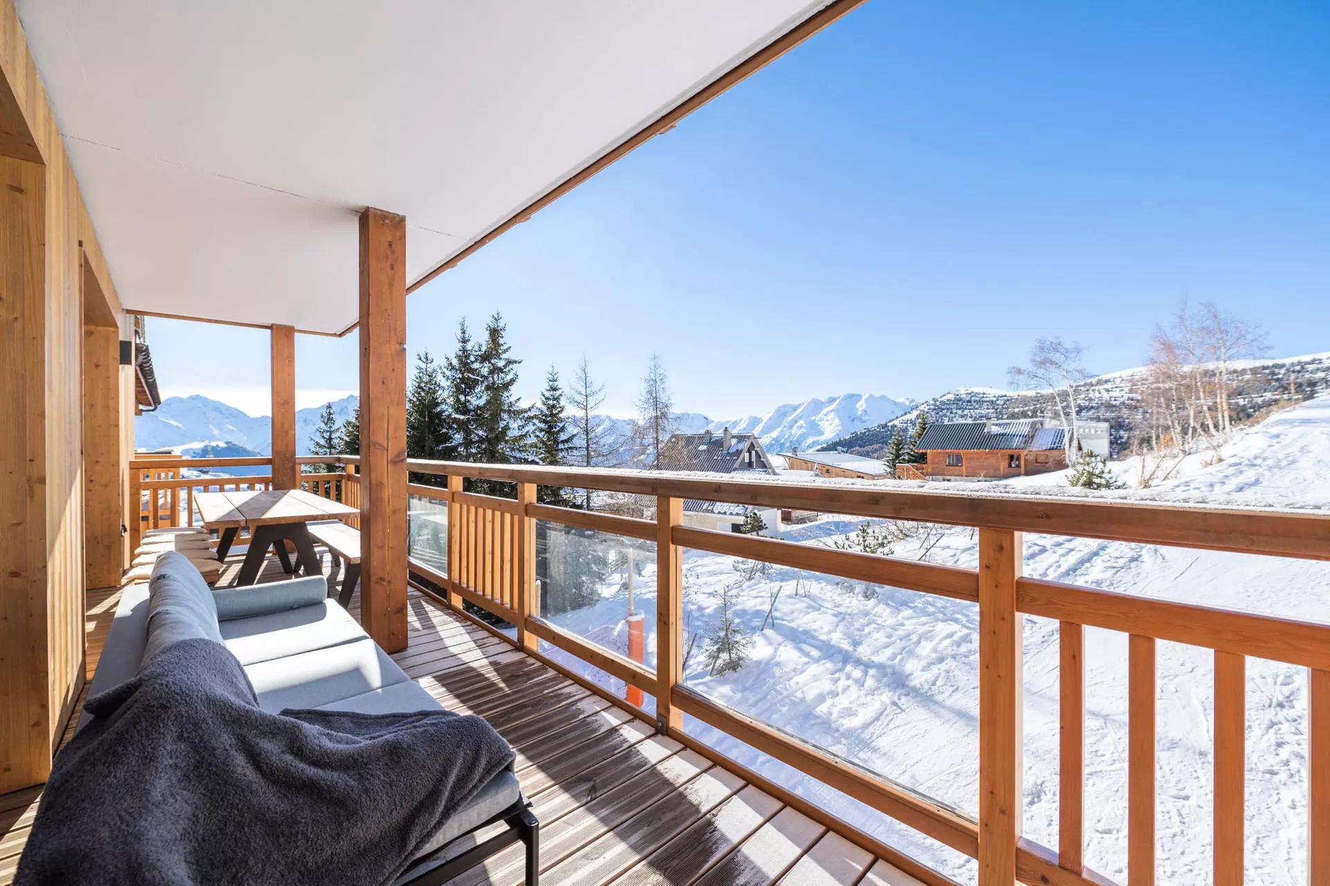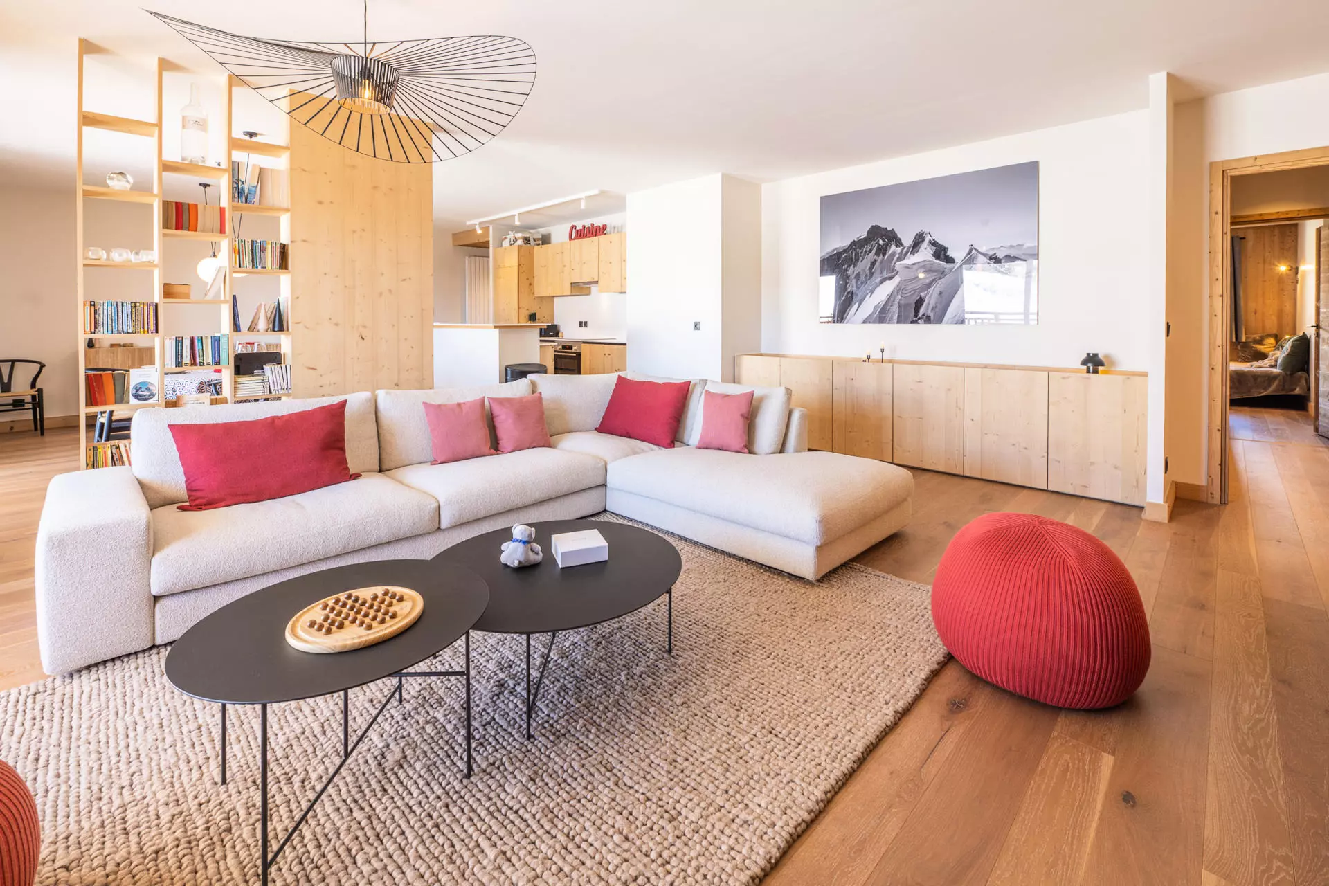 Nichée au cœur de la station et aux pied des pistes, cette résidence de prestige offre un espace bien-être et détente comprenant piscine, sauna et hammam. Cet appartement de 130m² accueille 4 adultes et 4 enfants.
