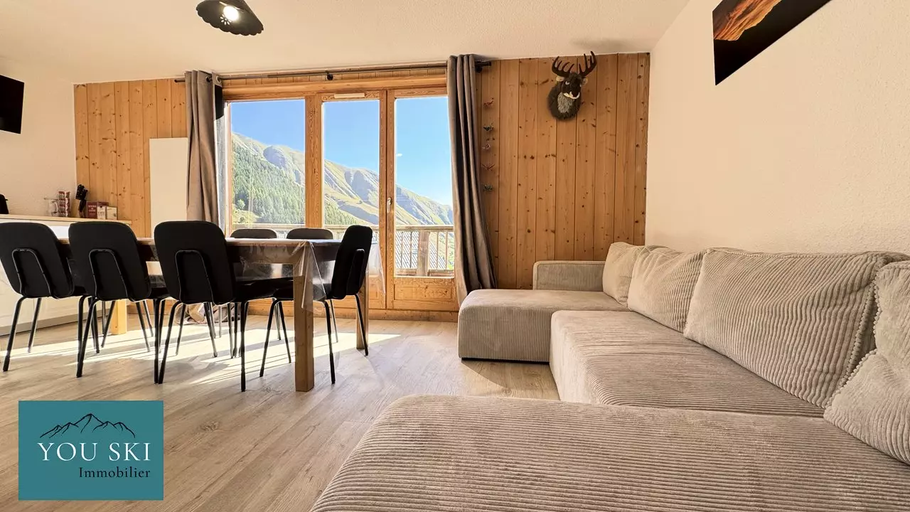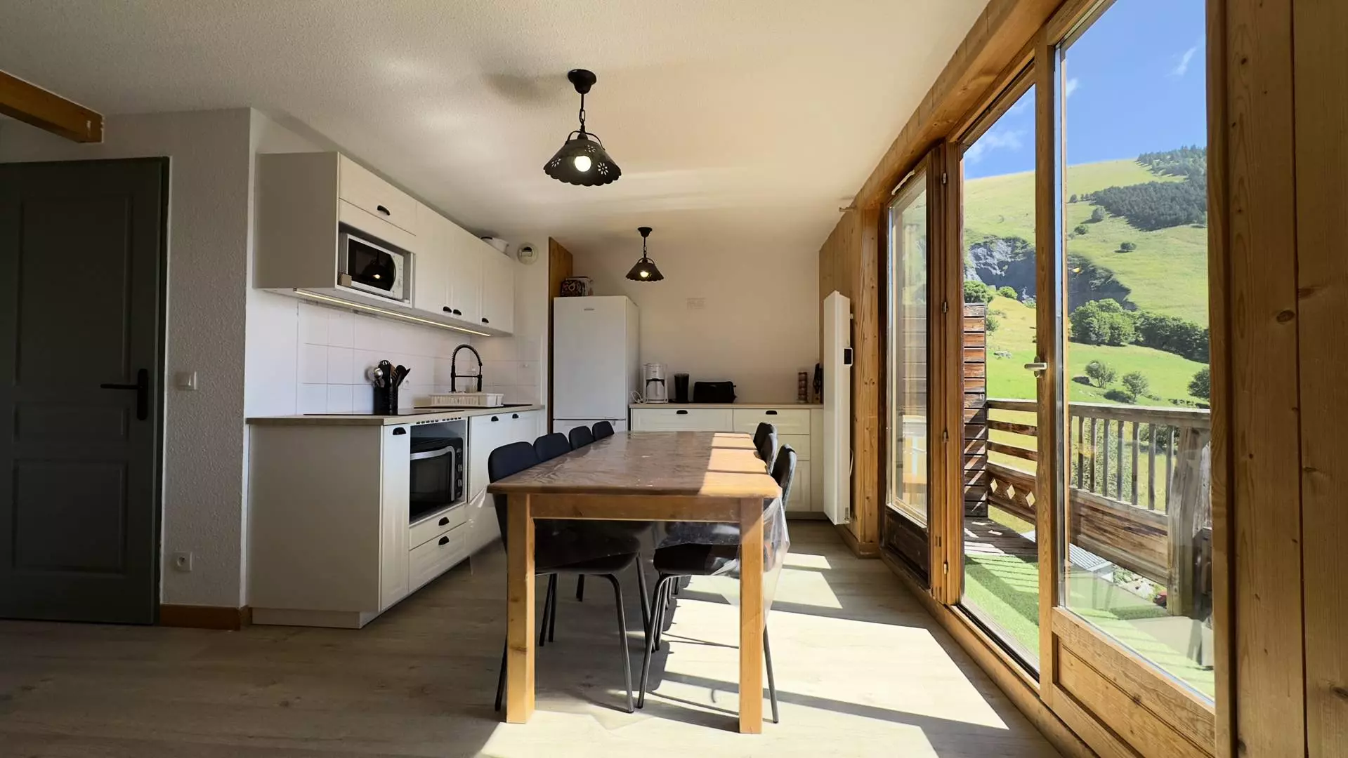 La pièce de vie spacieuse et baignée de lumière réunit une cuisine entièrement équipée et un salon convivial avec canapé convertible ? l'endroit parfait pour partager un repas après une journée sur les pistes, ou savourer un chocolat chaud en admirant les sommets enneigés.
