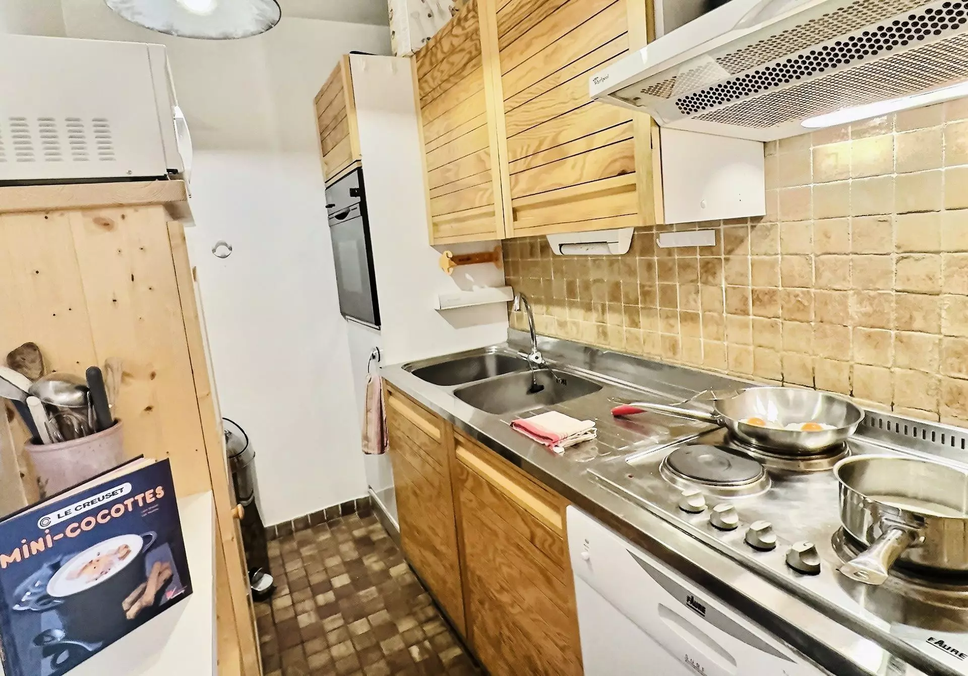 Elle est toute équipée avec plaques à induction, un micro-ondes, un lave vaisselle et un réfrigérateur.