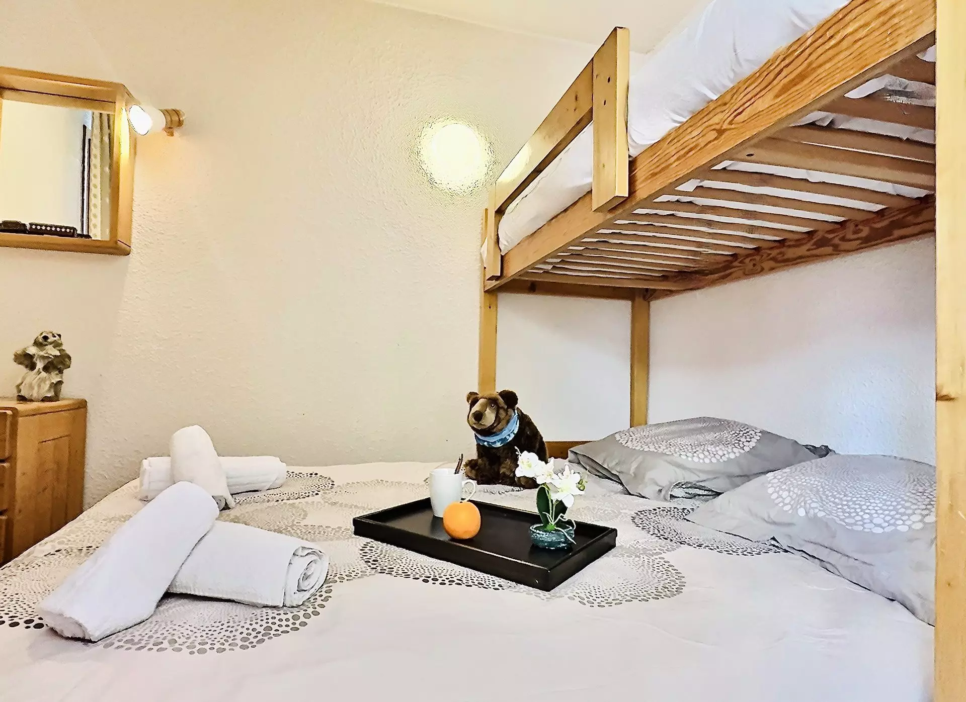 Une deuxième chambre avec des lits superposés. Merci de noter que le couchage en hauteur ne convient pas à des enfants de moins de 6 ans.