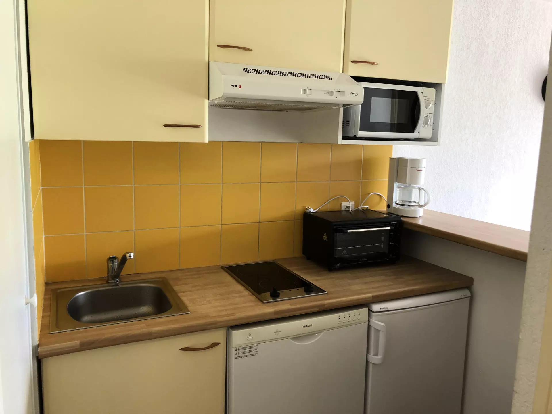 Coin cuisine équipée d'une plaque vitro céramique, micro-ondes,lave-vaisselle, réfrigérateur, cafetière Nespresso