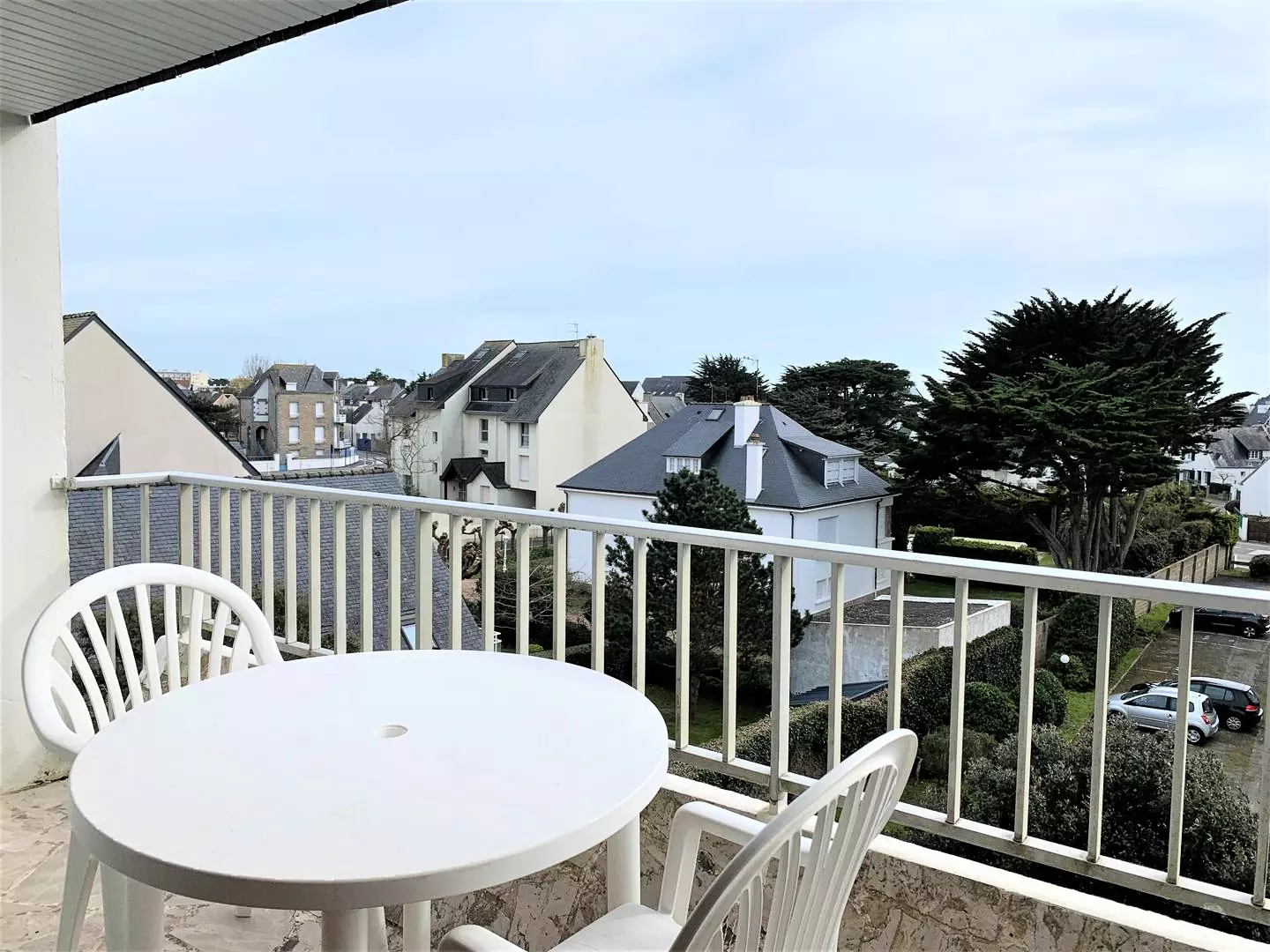 Balcon avec salon de jardin et petit aperçu mer.