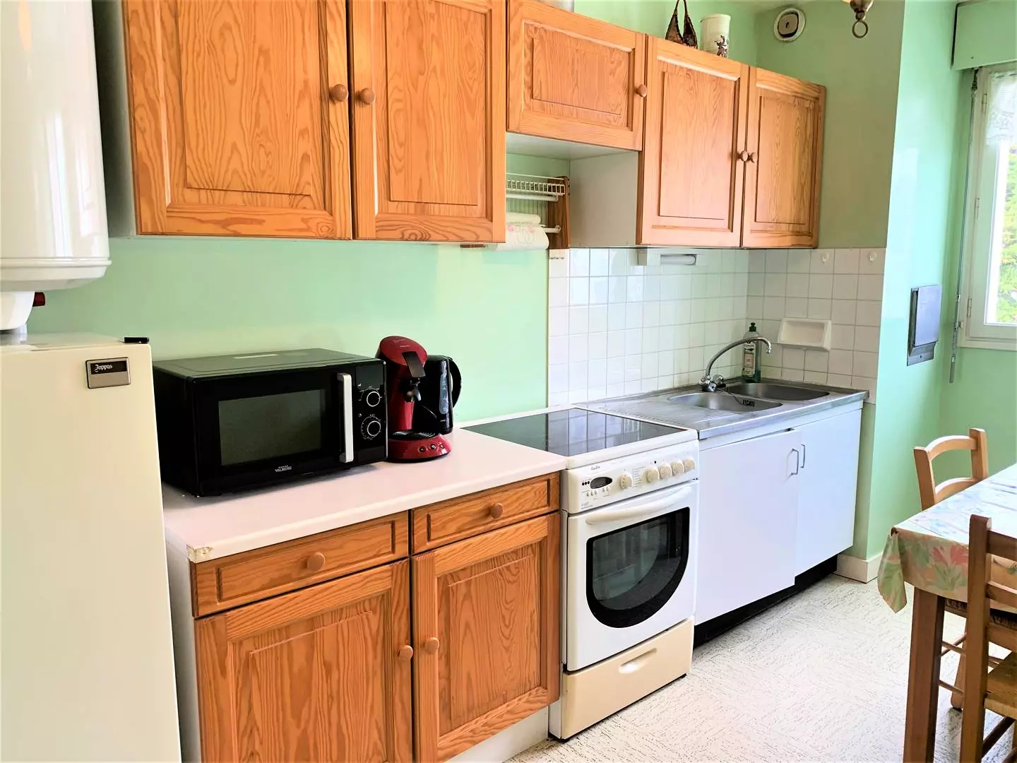 - Une cuisine séparée et équipée (plaque à induction 3 feux, lave-vaisselle, lave-linge, réfrigérateur, cafetière, bouilloire, grille-pain, micro-onde),