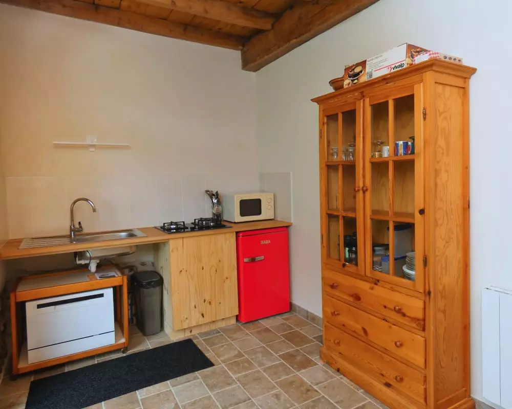 Cuisine séparée du coin couchage par un petit couloir (et un paravent si besoin) et bien équipée : gazinière, micro-ondes, réfrigérateur, lave-vaisselle, coin petit-déjeuner avec cafetière, bouilloire et grille-pain.