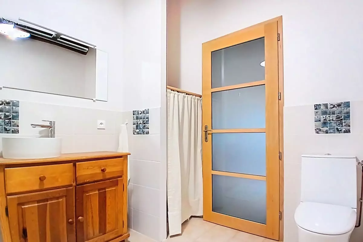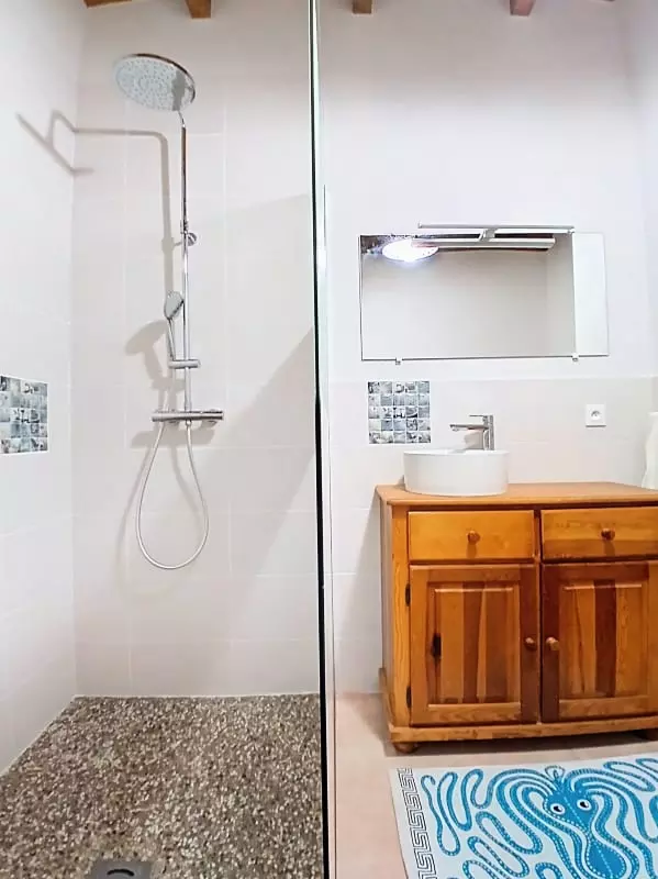 Salle d’eau moderne avec douche à l’italienne, WC et meuble vasque.
