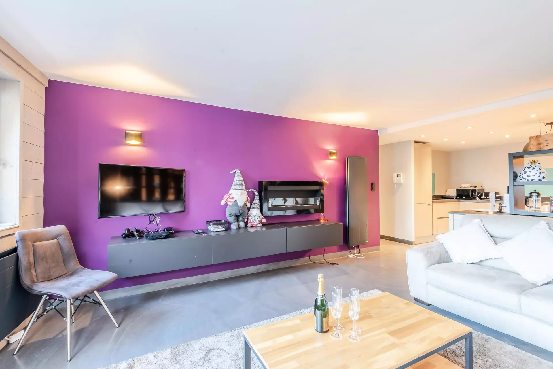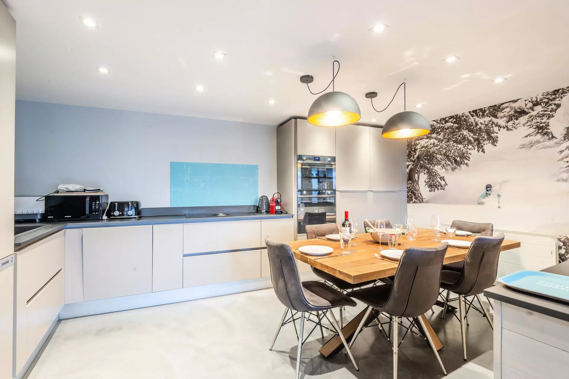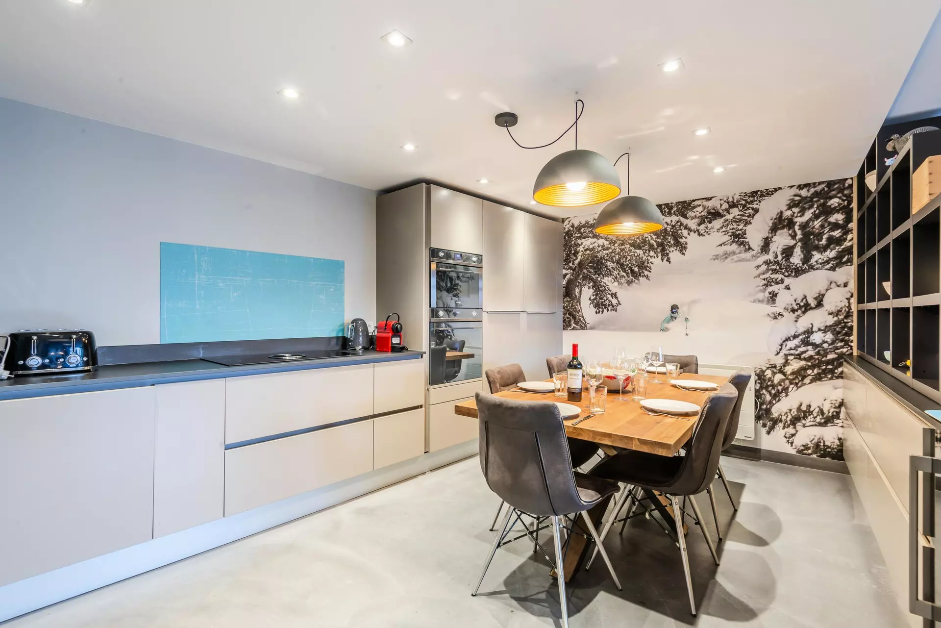 - Cuisine ouverte (grille-pain, bouilloire, four, micro-onde, lave-linge, sèche-linge, cafetières, appareil à fondue, appareil à raclette, cave à vin) avec espace repas