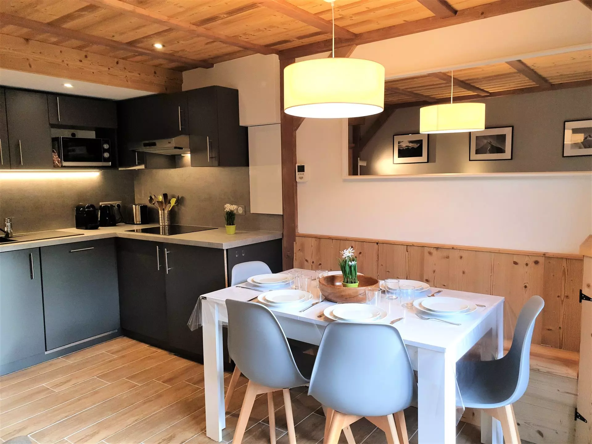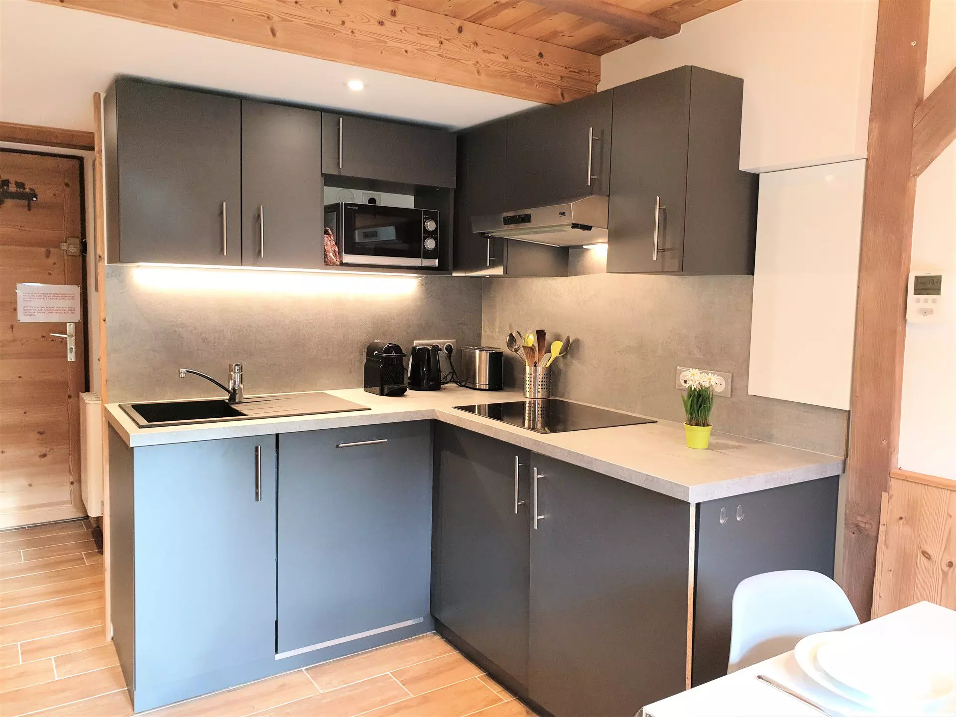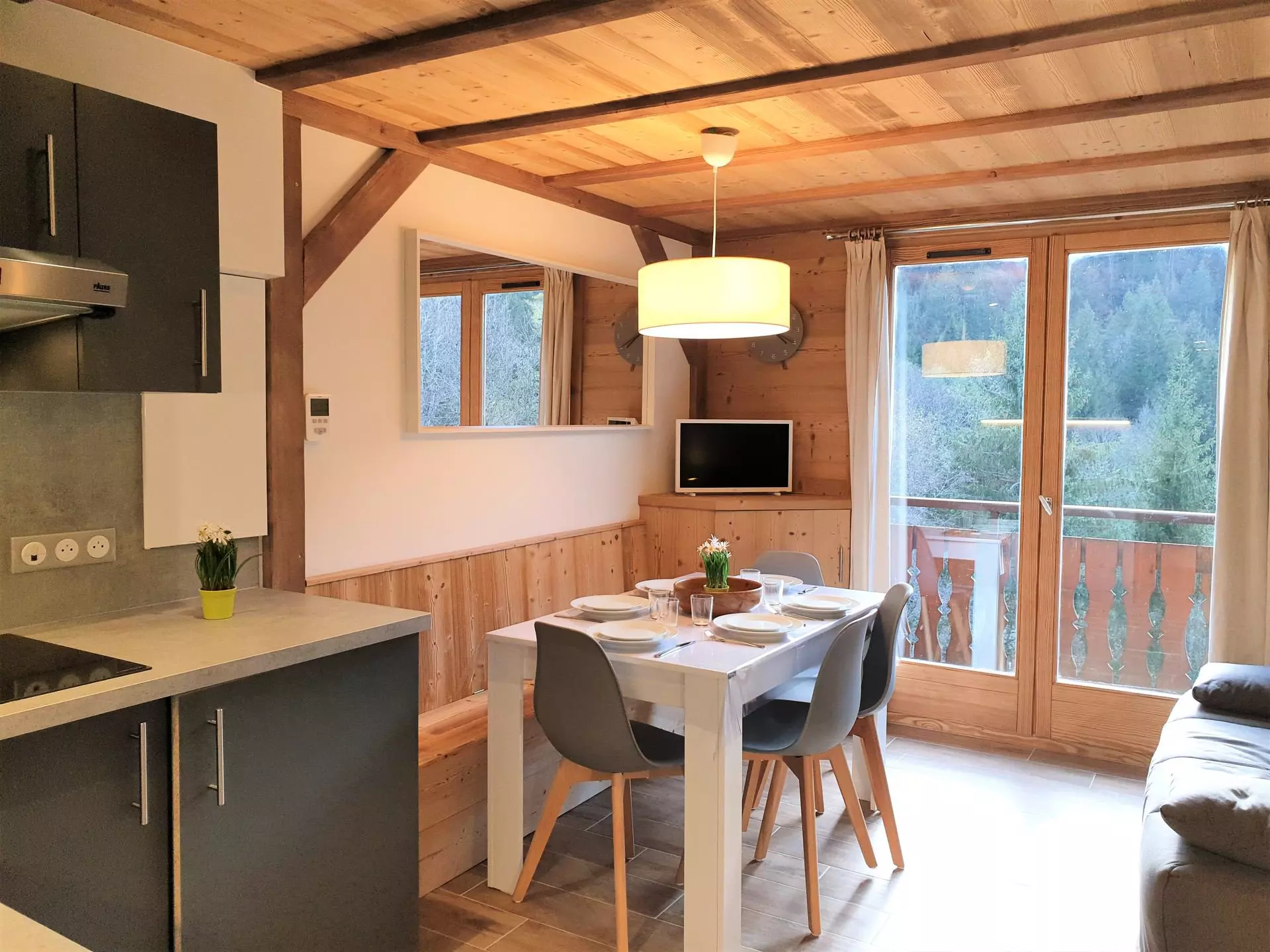 - Kitchenette équipée (micro-onde, mixeur, lave-vaisselle, cafetière, bouilloire, grille-pain, appareil à fondue, plaque induction)