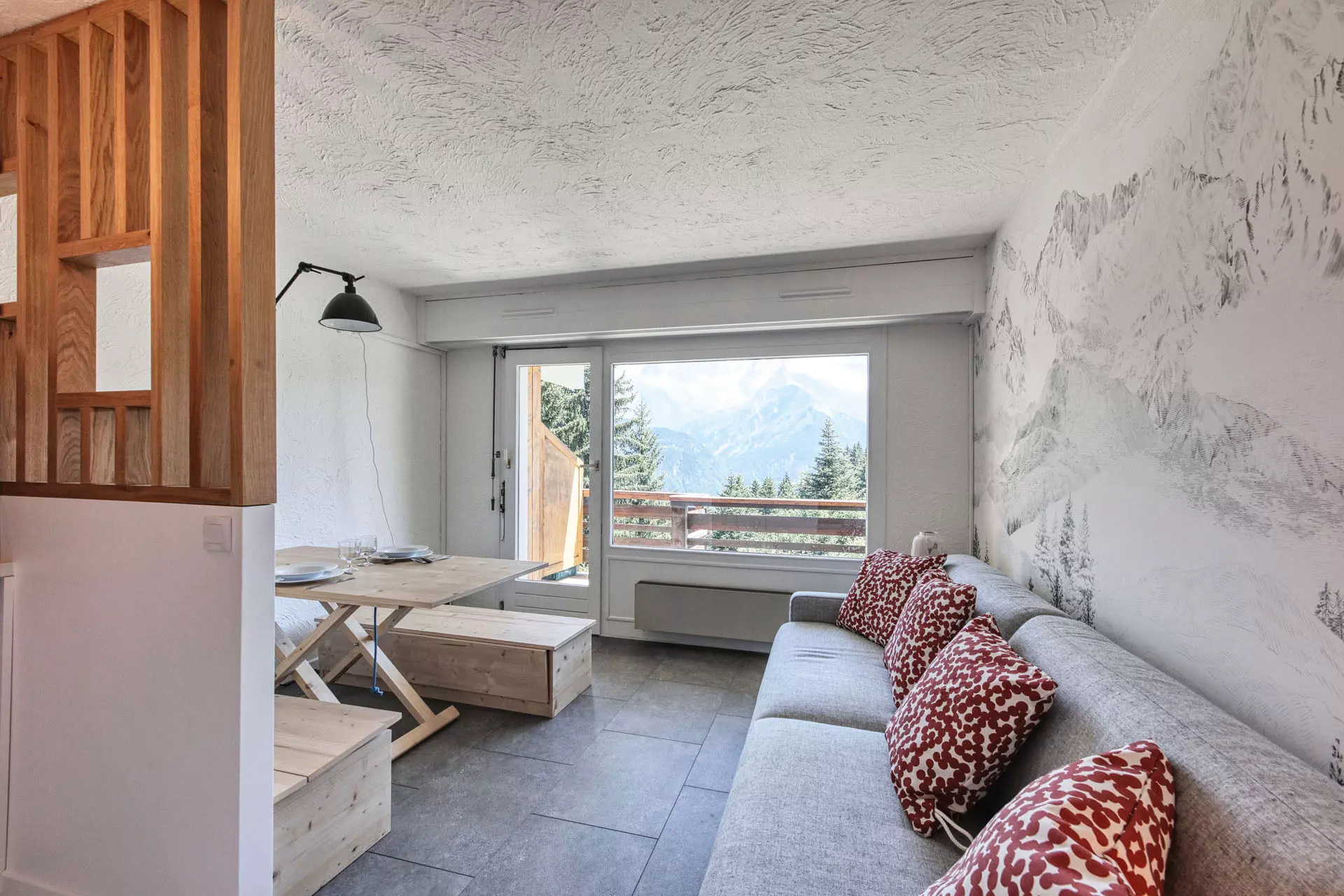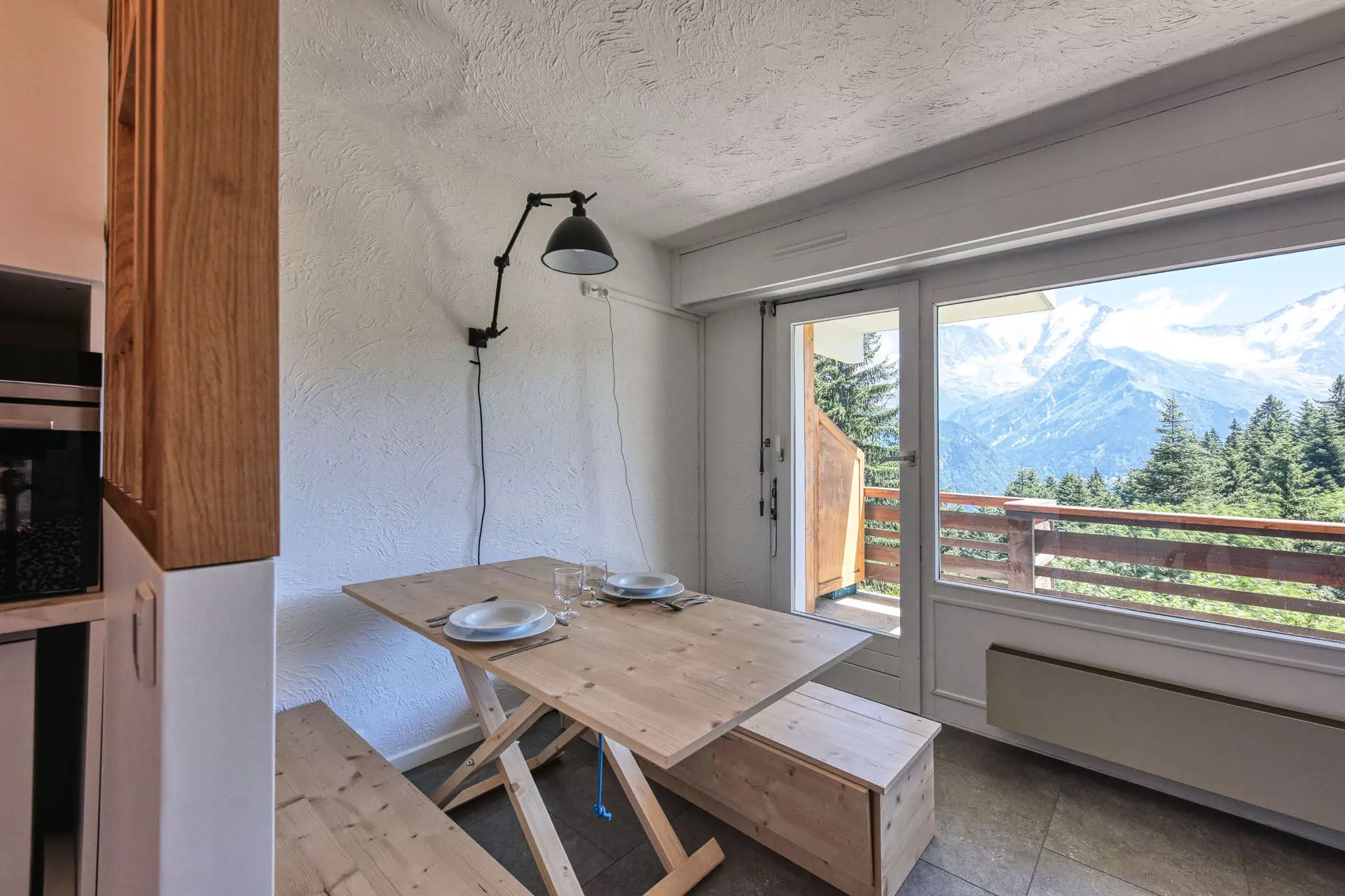 Ce studio, situé dans une résidence calme et ensoleillée à proximité des pistes de ski, offre une vue imprenable sur la chaîne du Mont Blanc. Il se compose d'une pièce de vie aménagée avec un coin cuisine, un espace repas et un coin nuit.