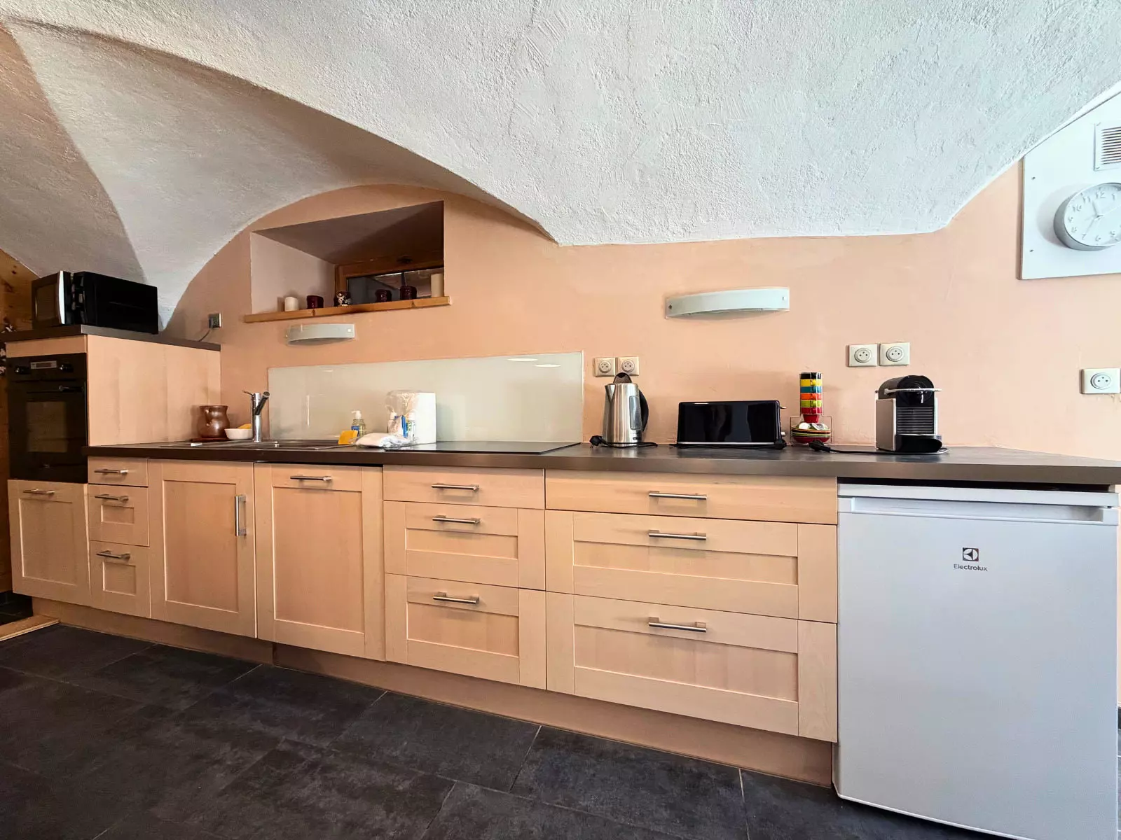 Cuisine ouverte sur le séjour : plaques de cuisson à induction, four, micro-ondes, réfrigérateur, congélateur, lave-vaisselle, cafetière, bouilloire, grille-pain, appareil à fondue, appareil à raclette
