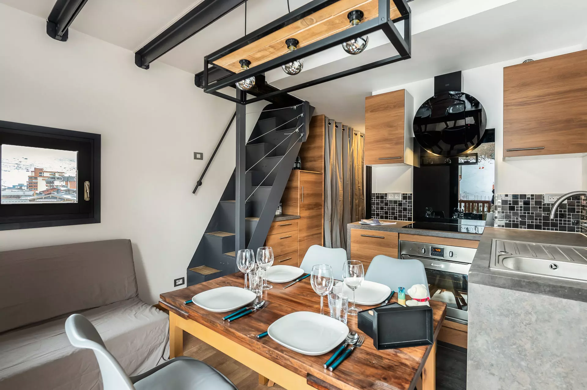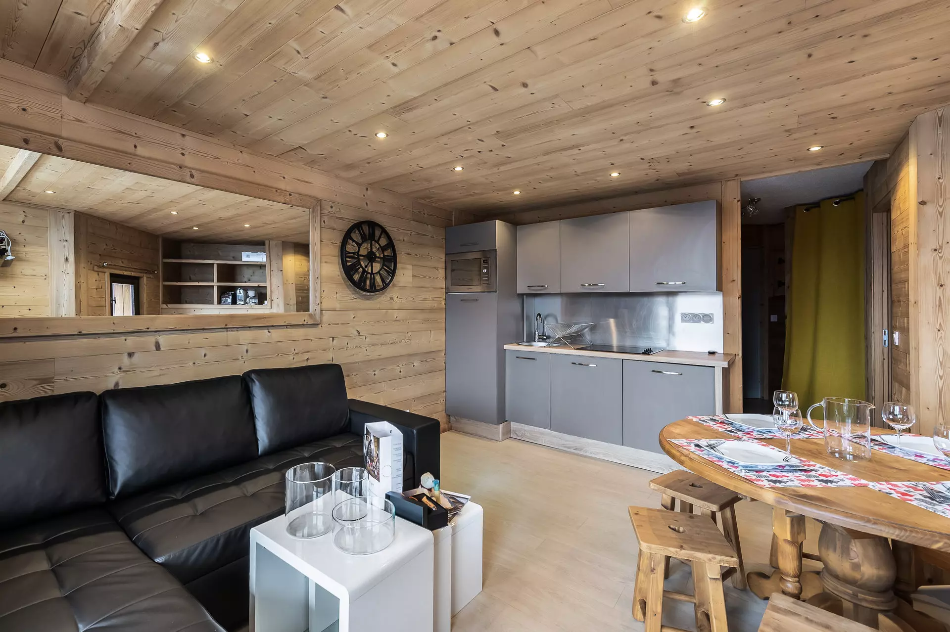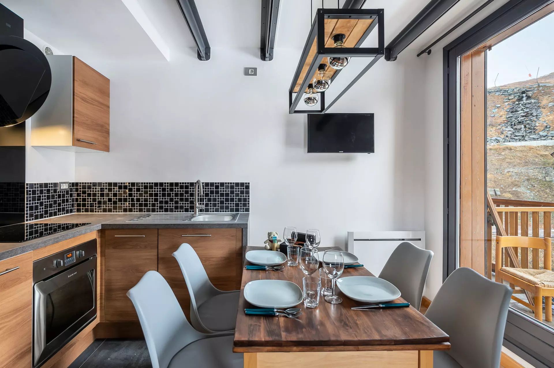 L'espace de vie est conçu dans un style contemporain et minimaliste qui allie confort et élégance. Le décor associe des éléments modernes, comme des chaises d'inspiration scandinave, à des touches de caractère telles que des rideaux à motifs écossais modernisés. La nouvelle cuisine entièrement équipée est conçue pour faciliter les séjours en montagne.