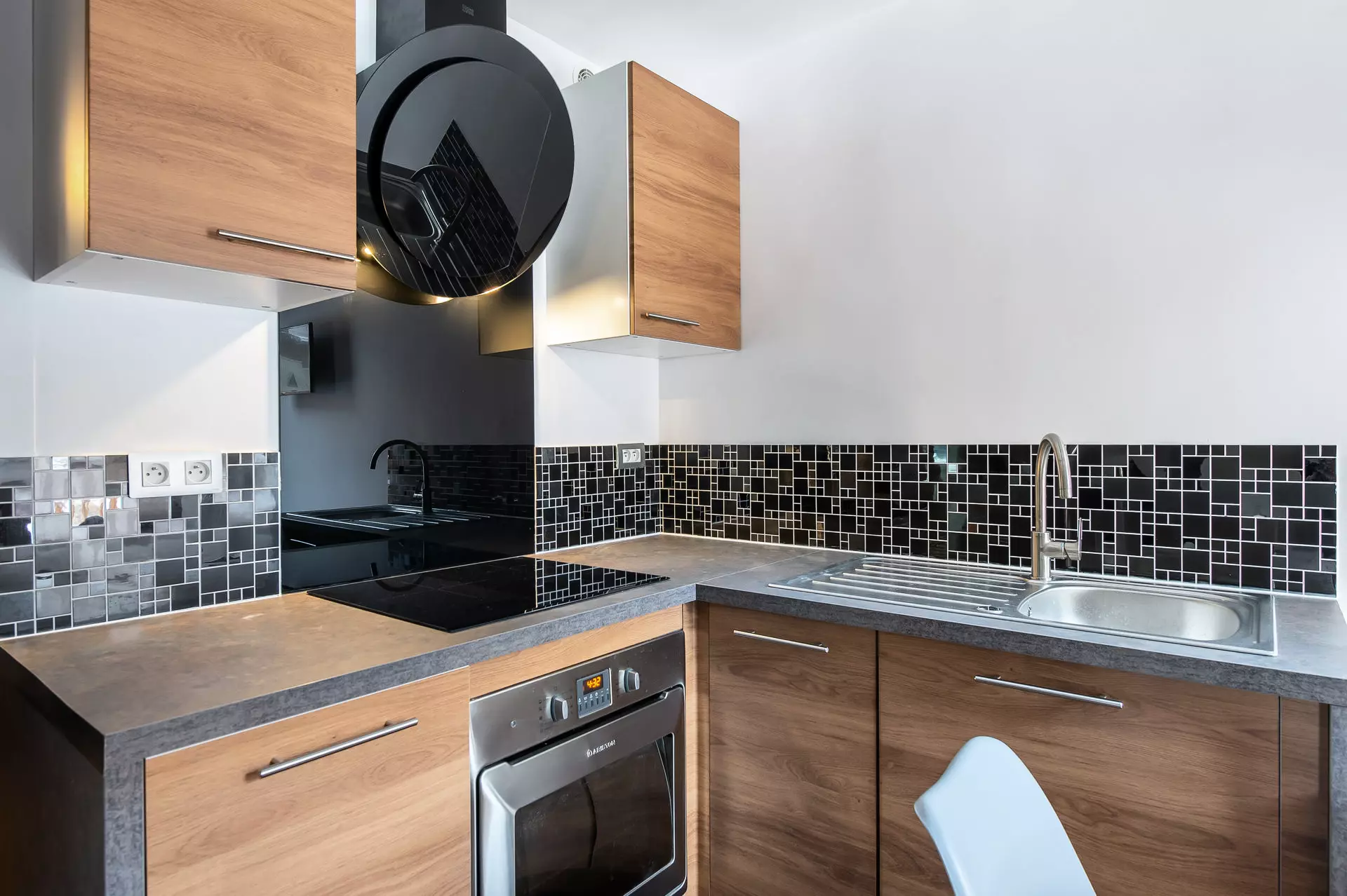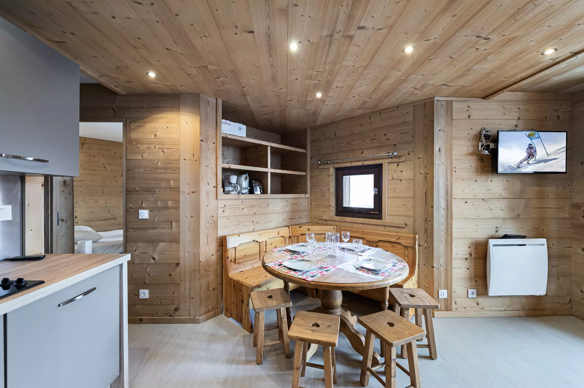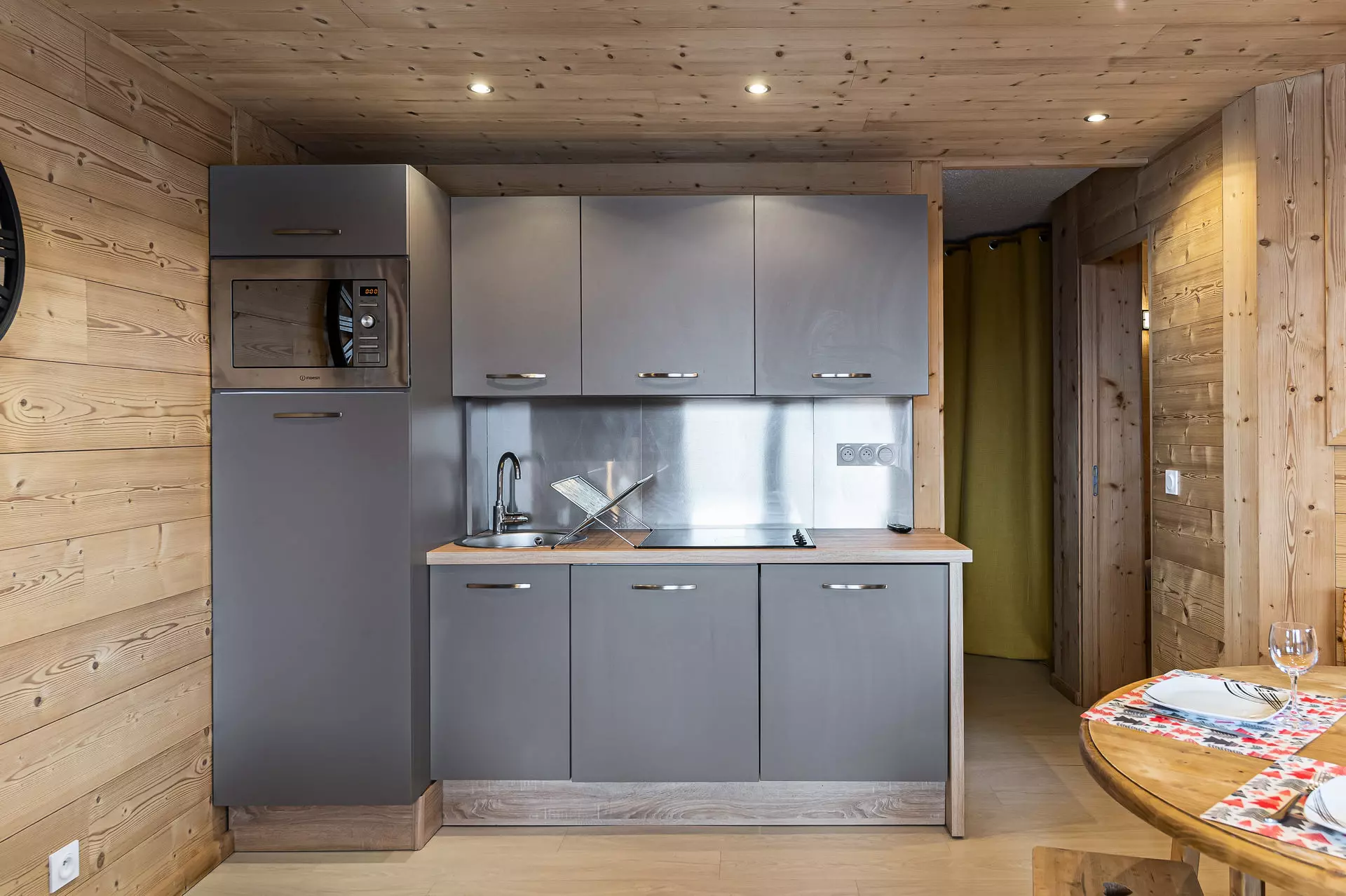 L'espace de vie est conçu dans un style contemporain et minimaliste qui allie confort et élégance. Le décor associe des éléments modernes, comme des chaises d'inspiration scandinave, à des touches de caractère telles que des rideaux à motifs écossais modernisés. La nouvelle cuisine entièrement équipée est conçue pour faciliter les séjours en montagne.