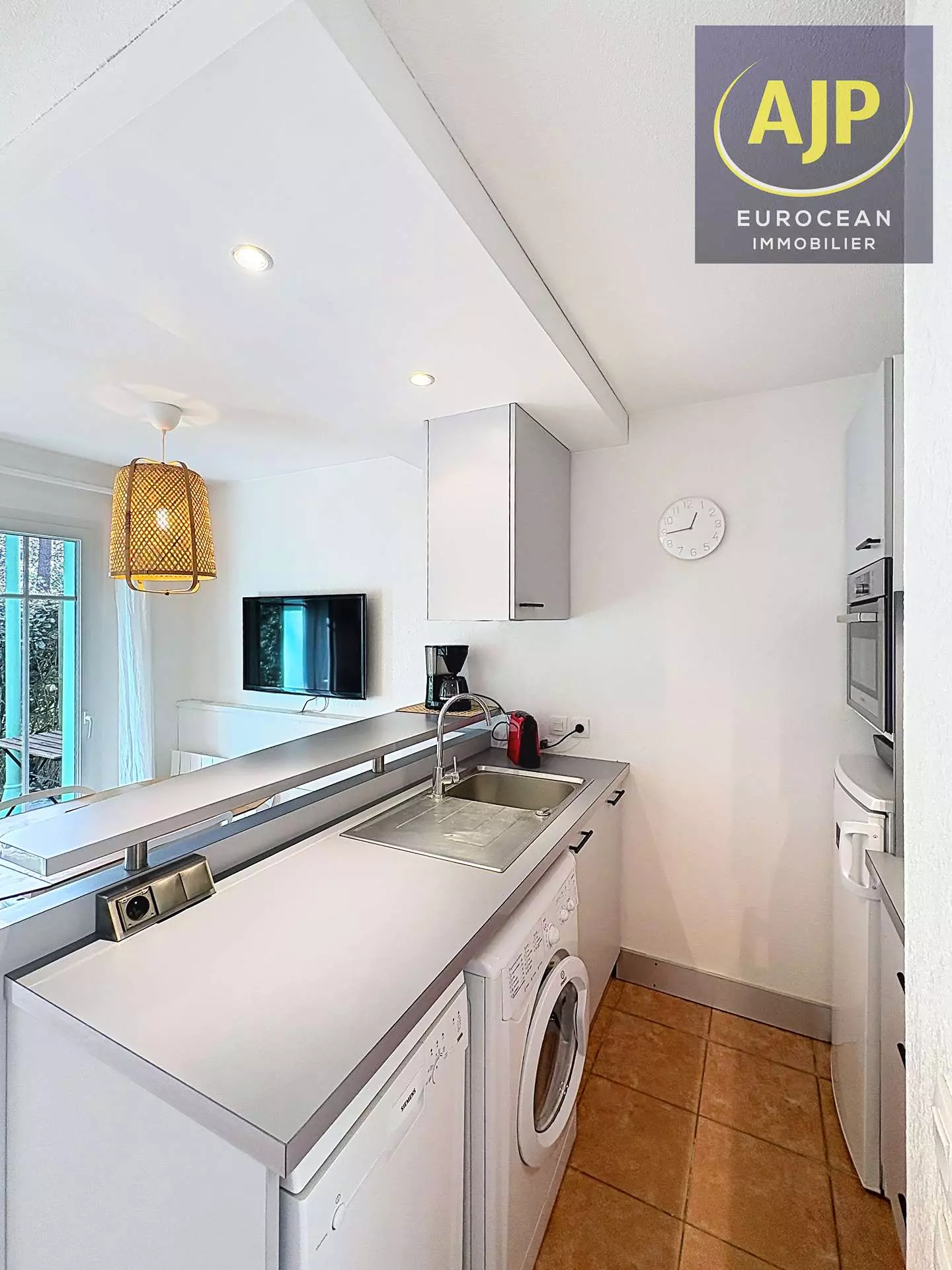 Appartement T 2 pour l'accueil de 4 personnes au sein d'une grande enseigne de résidence de tourisme située sur le domaine du Golf de Lacanau. Situé à proximité des 3 golfs, cet agréable appartement est se trouve au 1er étage. La pièce principale faisant office de salon et salle à manger possède une kitchenette et ouvre sur une petite terrasse équipée de mobilier de jardin et parasol avec vue sur la piscine. Les quatre couchages sont répartis entre la chambre, équipée d'un lit double et le salon équipé de banquettes gigognes, les sanitaires comprennent une salle de bain et des WC indépendants. Le parking de la résidence est gratuit. La résidence Lacanau Les Pins, anciennement Pierre & Vacances, propose beaucoup de prestations : grand espace aquatique chauffé ouvert de début avril à fin septembre, location de vélos et vélos électriques, Food trucks variés chaque jour (Présents uniquement Juillet/ Août), aire de jeux pour enfants, sanitaires, laverie automatique. Rejoignez la plage, l'océan, les commerces à 3 km, le premier golf à 1 km, le lac de lacanau à 4km (Ref 01411). Chèques vacances ANCV acceptés