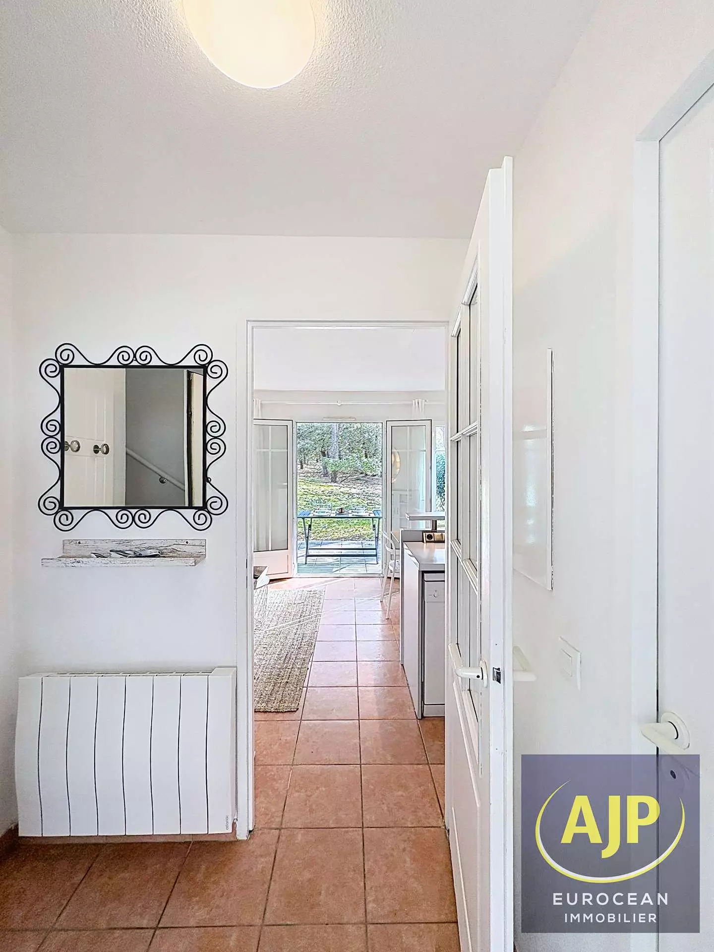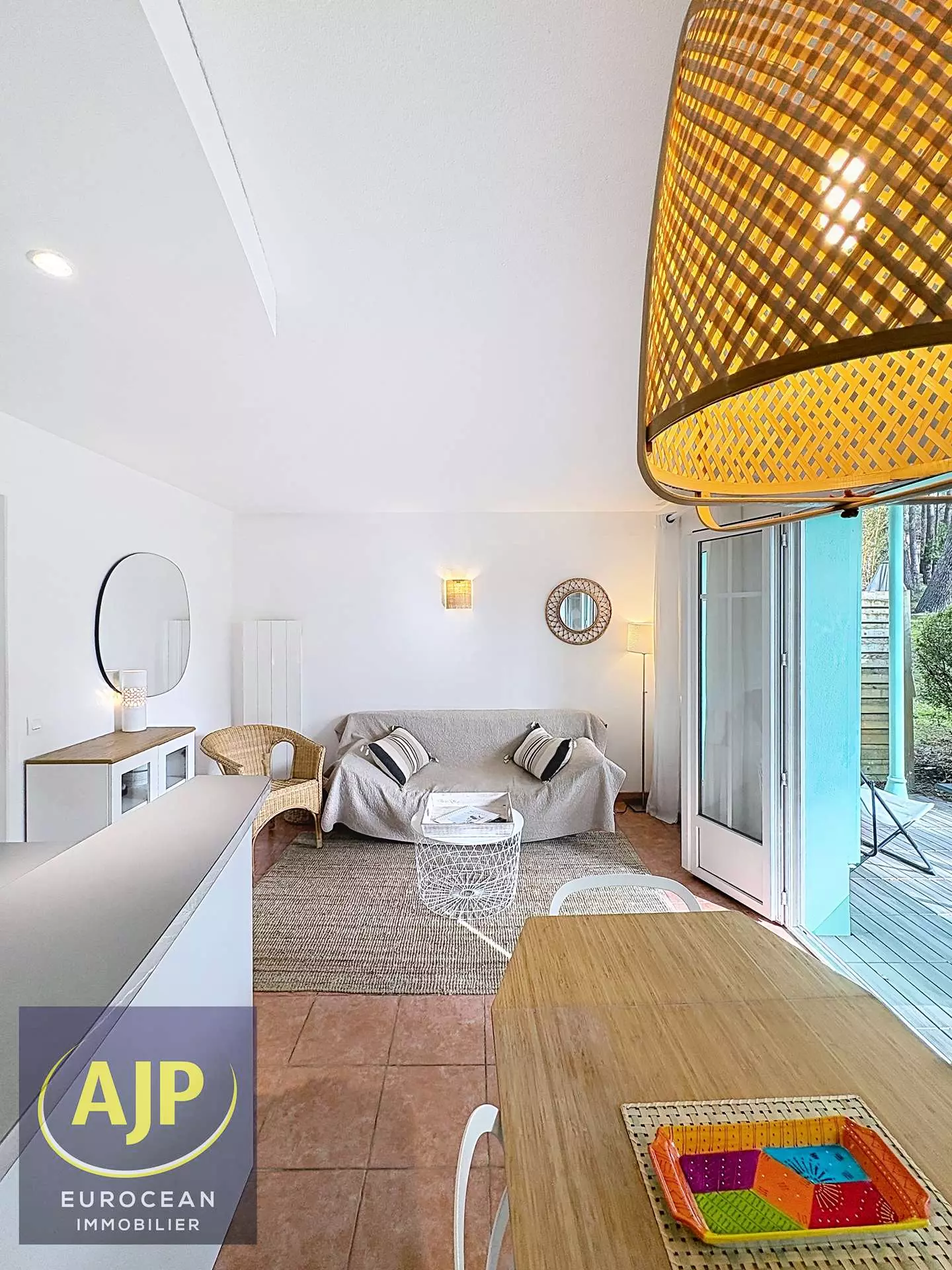 Pavillon mitoyen. Terrasse et espace Jardin privatif (25m2) ouvrant sur Parc arboré sans vis à vis. Exposition Sud. Votre hébergement comprend une entrée, une pièce à vivre faisant office de salon et salle à manger avec espace cuisine équipé type petite cuisine américaine. Wc indépendants en rez-de-jardin. L'étage entièrement rénové avec du plancher massif comprend un palier équipé d'une penderie et étagères, une salle d'eau avec WC (vasque - douche), deux chambres, chacune équipée (modulez votre couchage : grand lit double ou lits jumeaux (2 lits de 80/190 ou lit parental de 160/190 ). Le parking de la résidence est gratuit pour les résidents. Connexion Wi-Fi gratuite. La résidence Le Domaine du Golf, anciennement Pierre & Vacances, propose beaucoup de prestations : grand espace aquatique chauffé ouvert de début avril à fin septembre, location de vélos et vélos électriques, Food trucks variés chaque jour (Présents uniquement Juillet/ Août), aire de jeux pour enfants, sanitaires, laverie automatique. Rejoignez la plage, l'océan, les commerces à 3 km, le premier golf à 1 km, le lac de Lacanau à 4km (Ref 02369). Chèques vacances acceptés