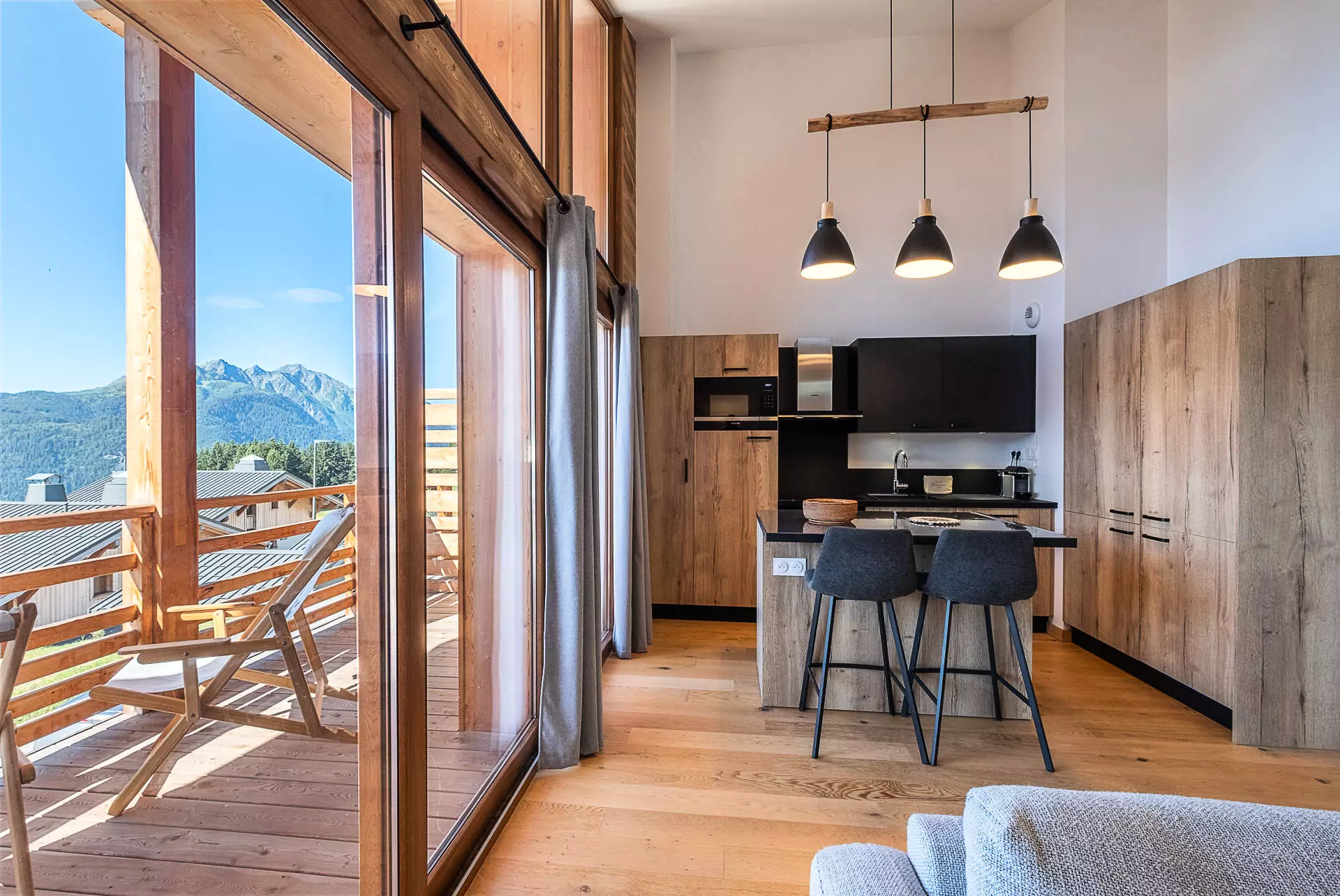 - salon/salle à manger avec cuisine ouverte donnant sur balcon