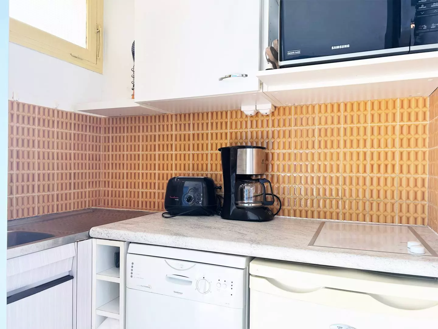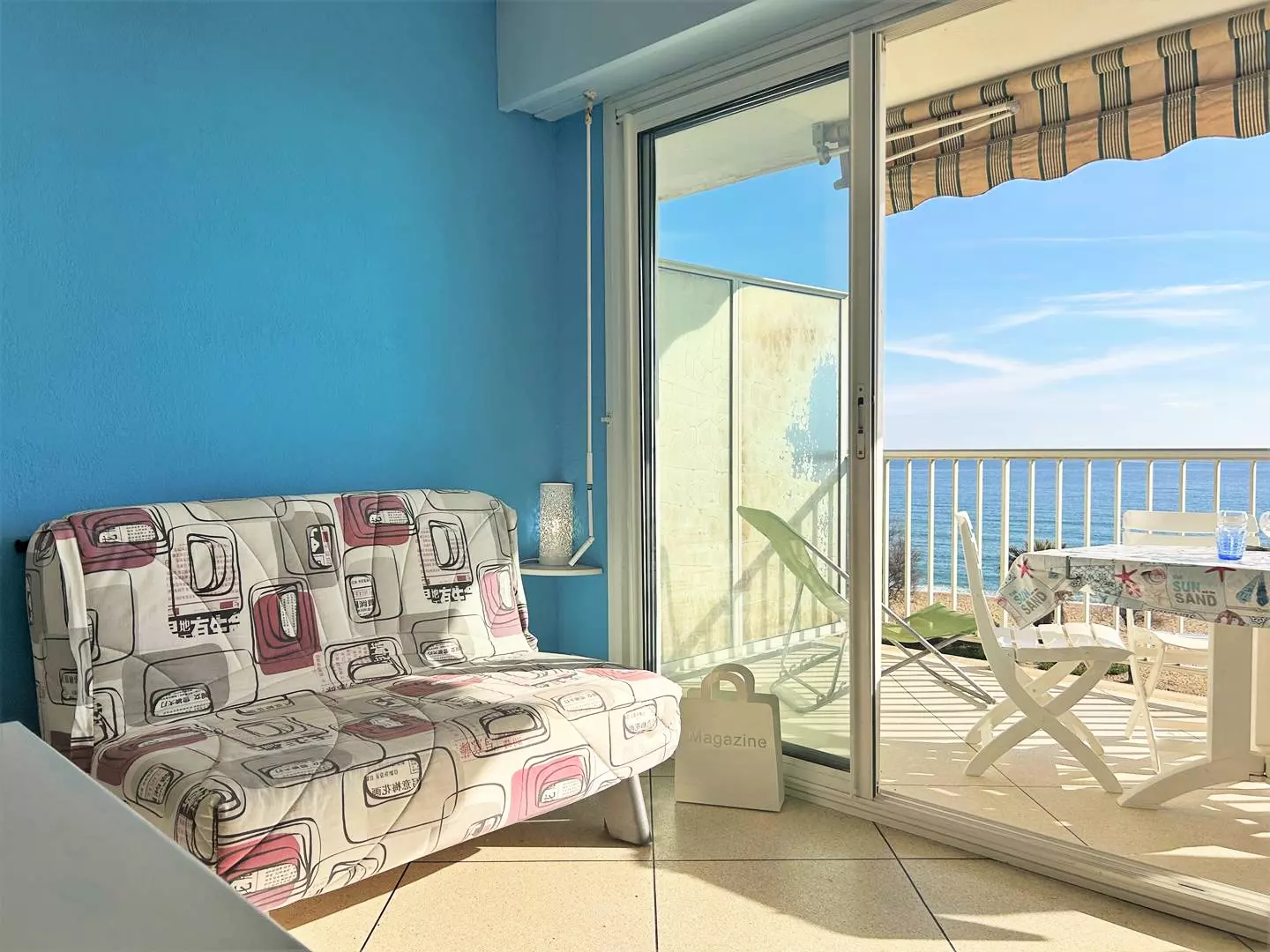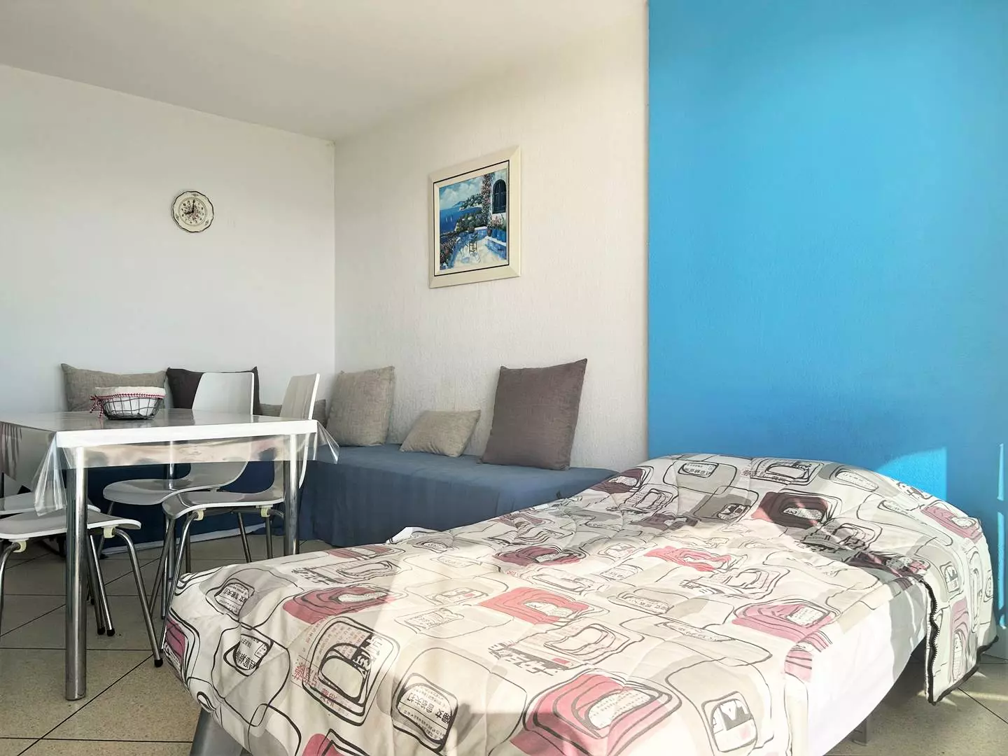 Cette location de vacances au deuxième étage par ascenseur vous offre un séjour lumineux équipé d'un canapé convertible 120 pour une personne et deux lits simples, un coin cuisine, une salle d'eau avec wc.