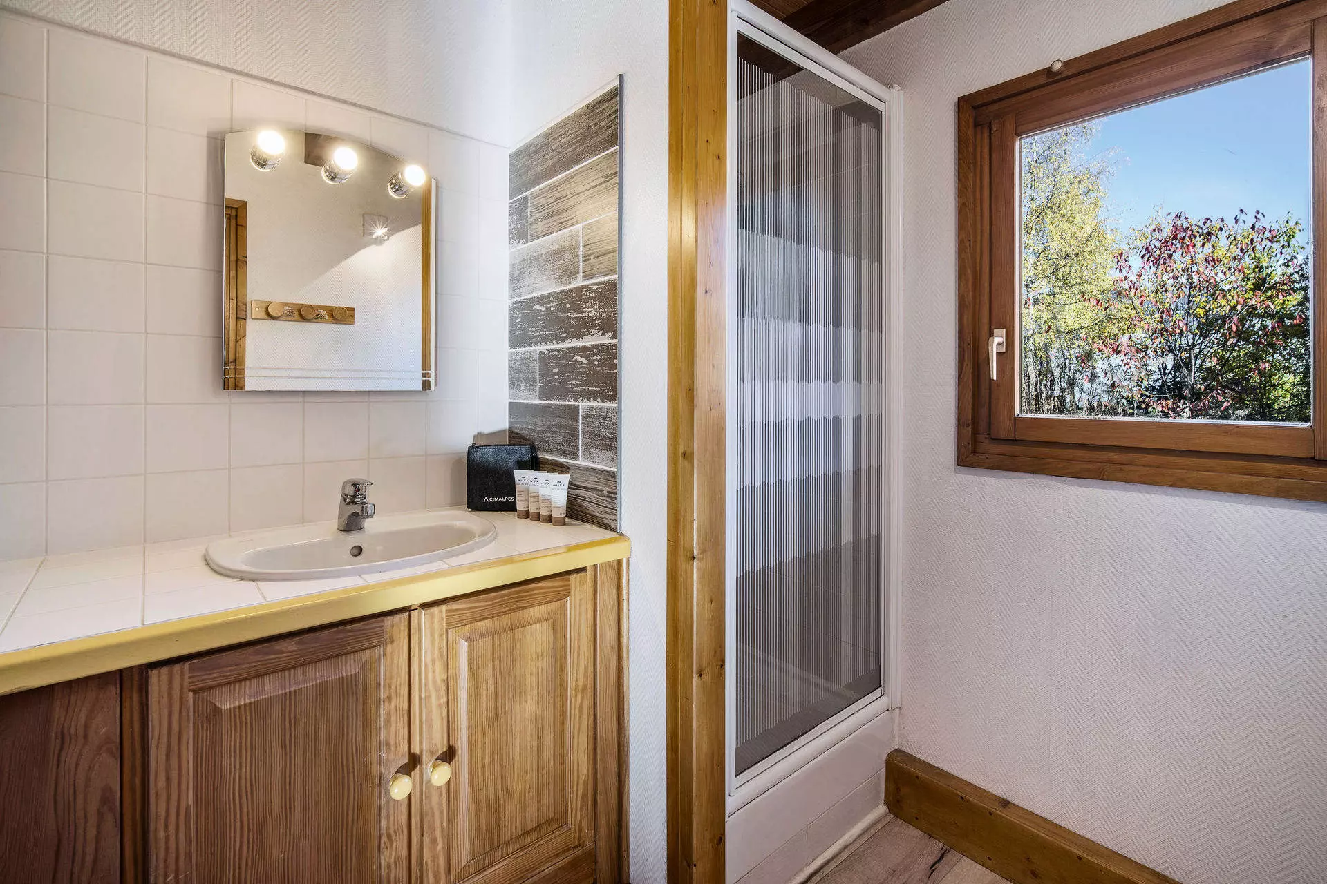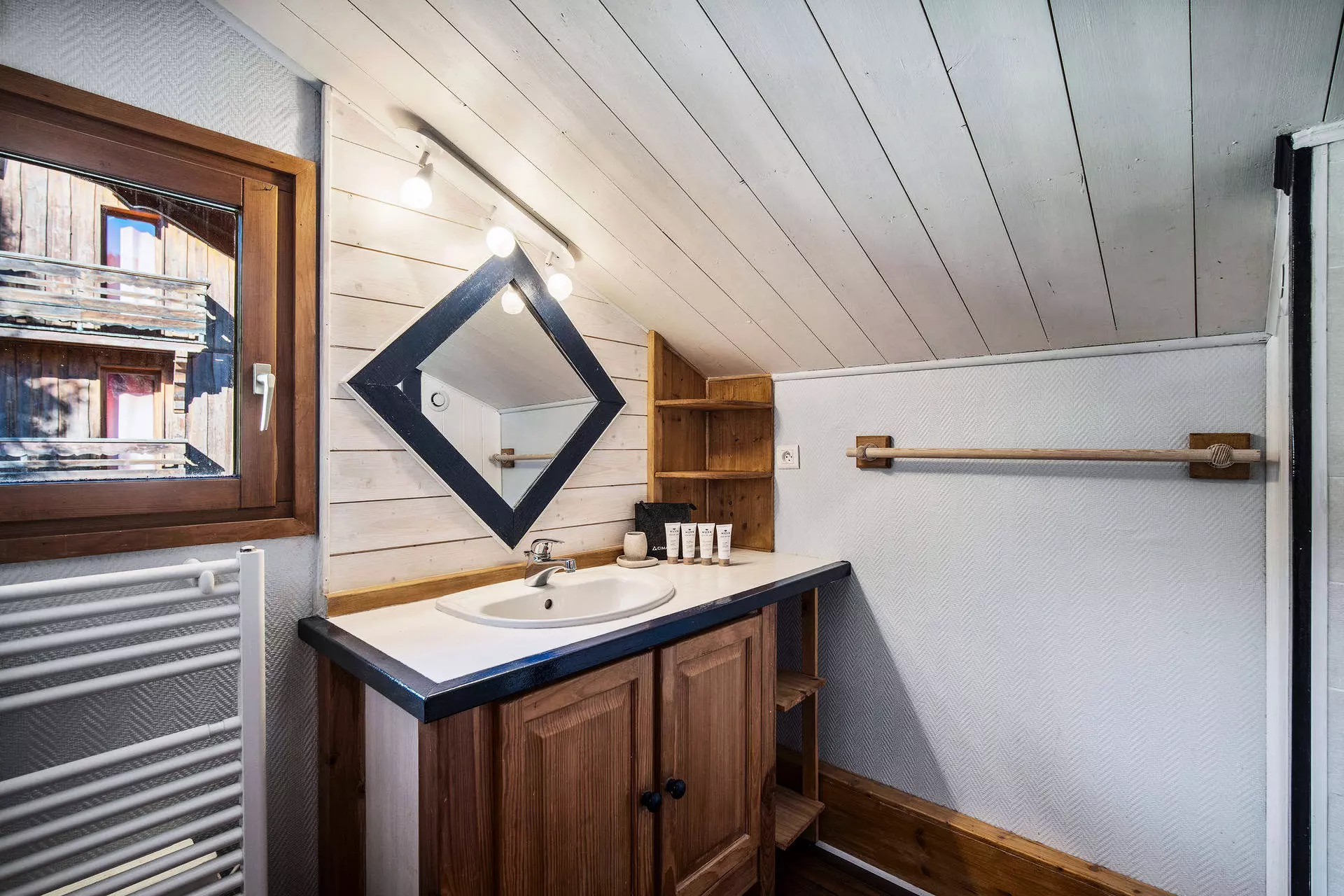 - 1 salle de douche avec simple vasque et sèches serviette,
